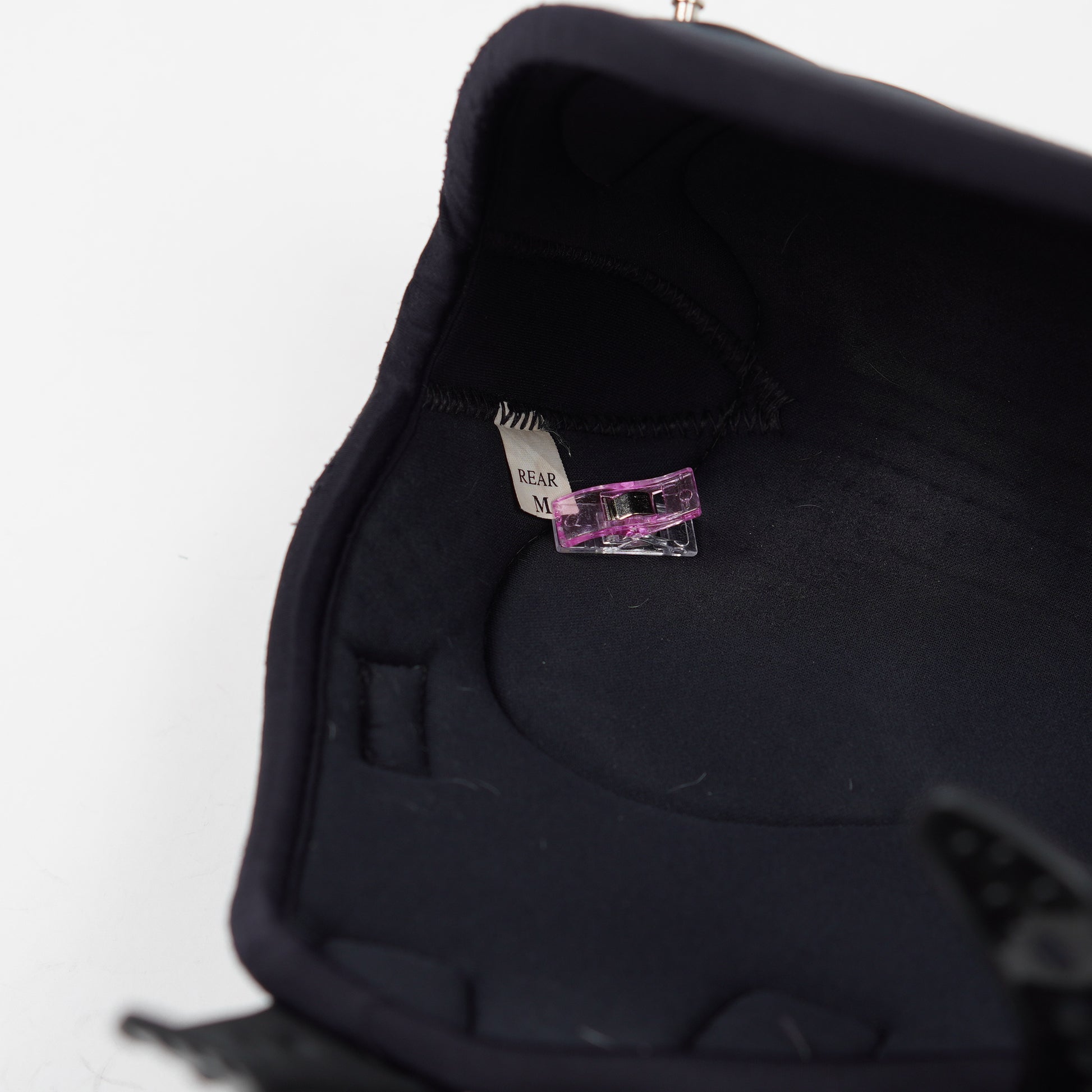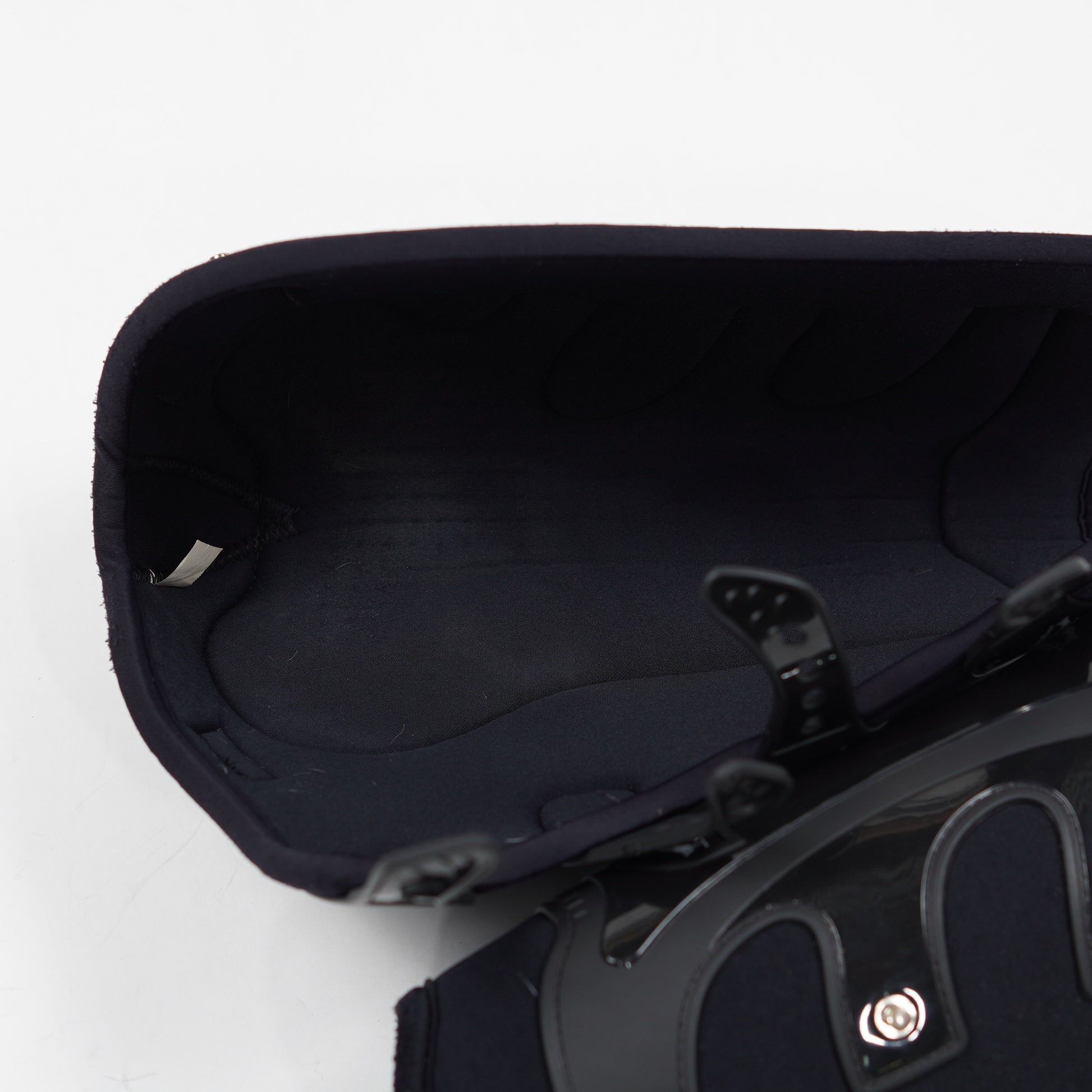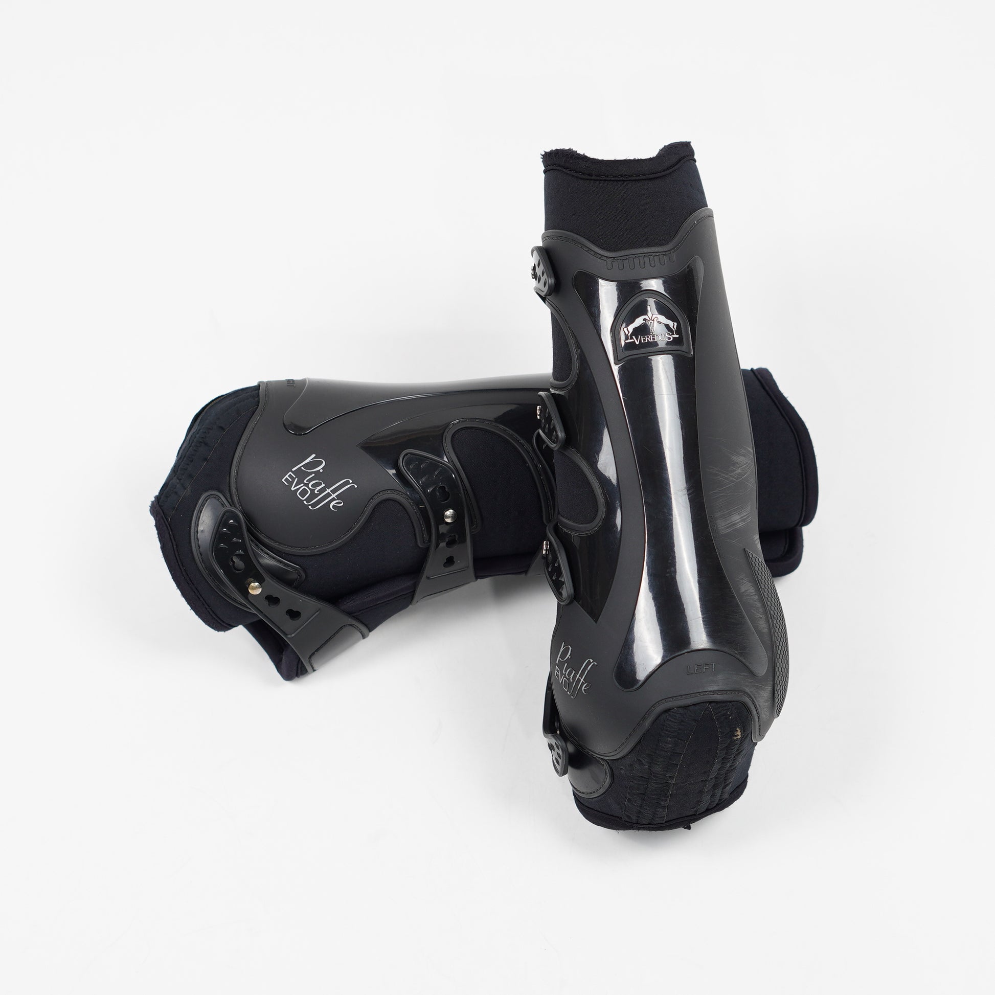 Mjuka benskydd Piaffe Evo AeroX med elastiska inspänningar från Veredus. Ett ytligt litet hål syns på baksidan, se bild.