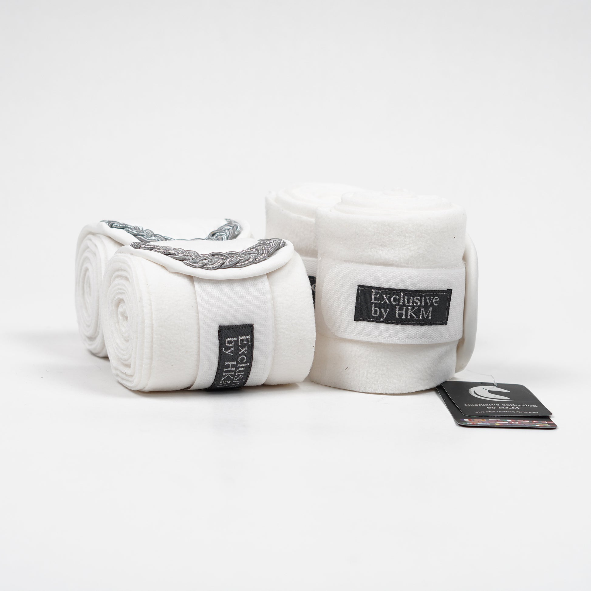 Oanvända benlindor i vit fleece och silke från HKM Exclusive.