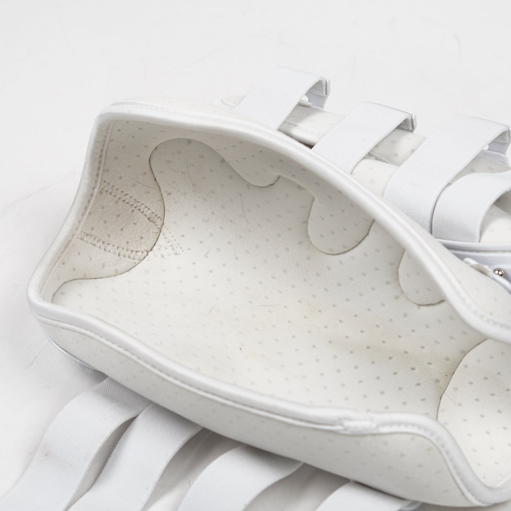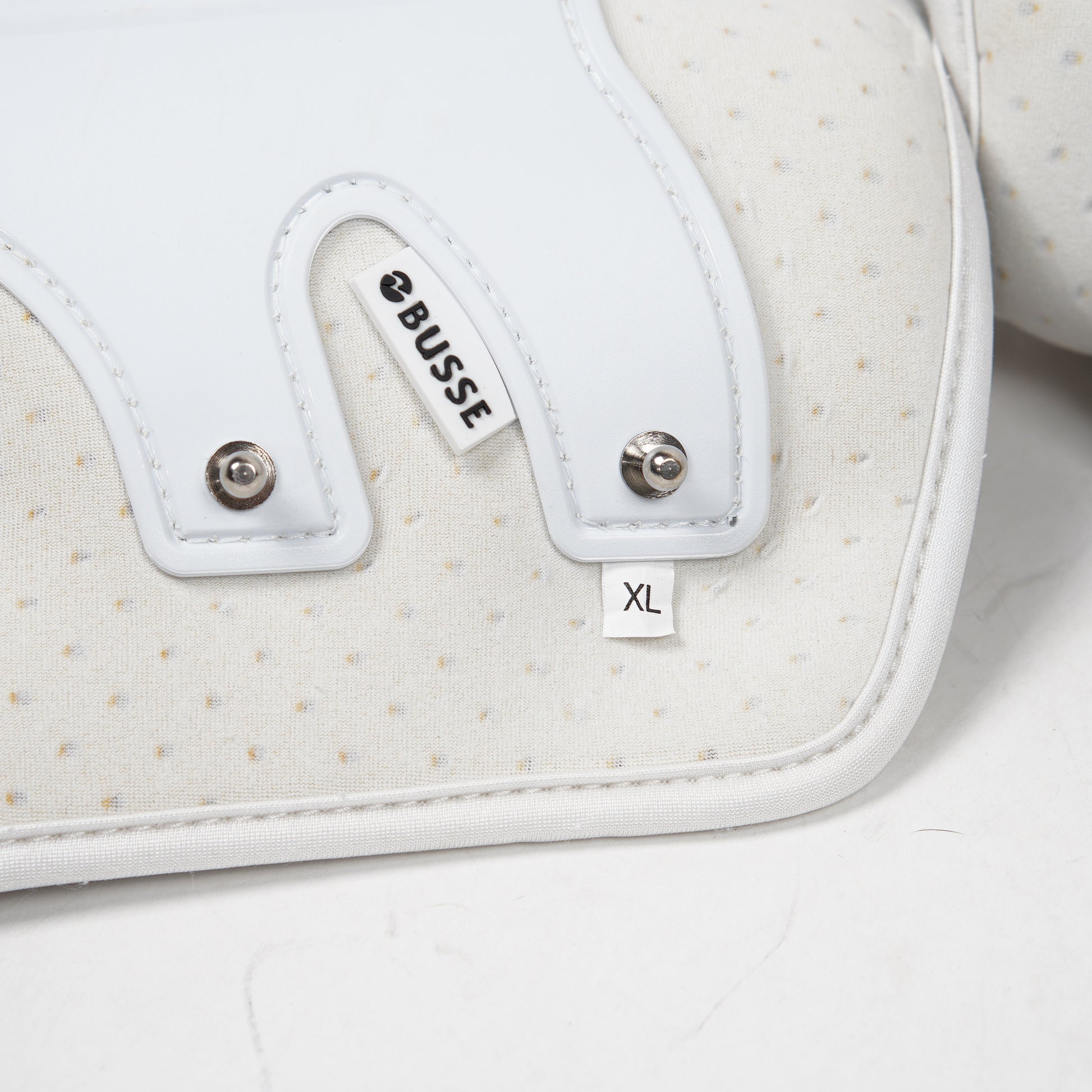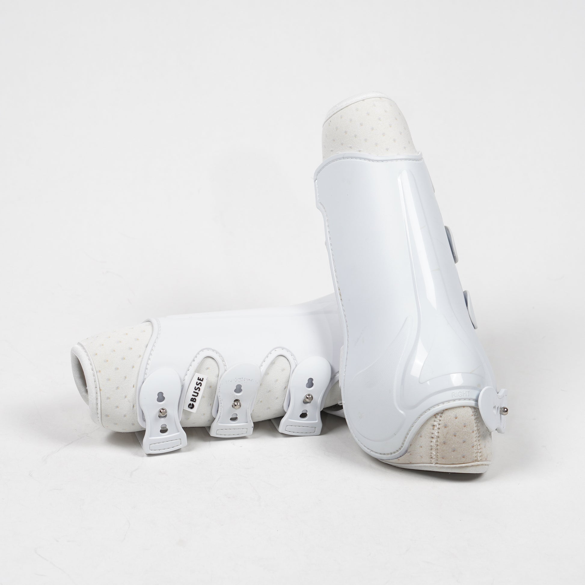 Vita benskydd från Busse som är anatomiskt formade för at ge en så bra passform som möjligt. Skydden är helt slutna och har hårt skal som går över skenan och fetlockområdet. Fästs med elastiska spännen och knapplåsning.