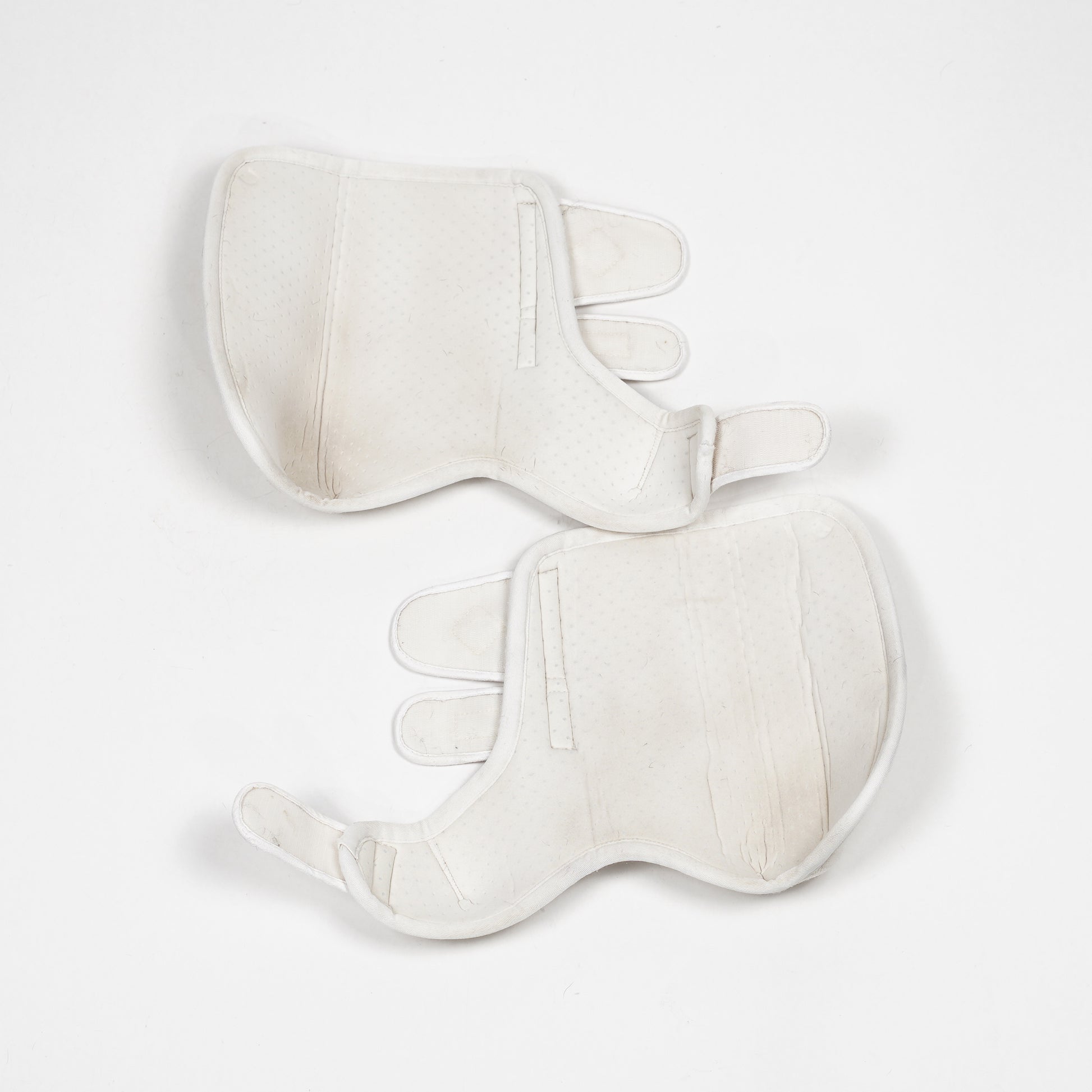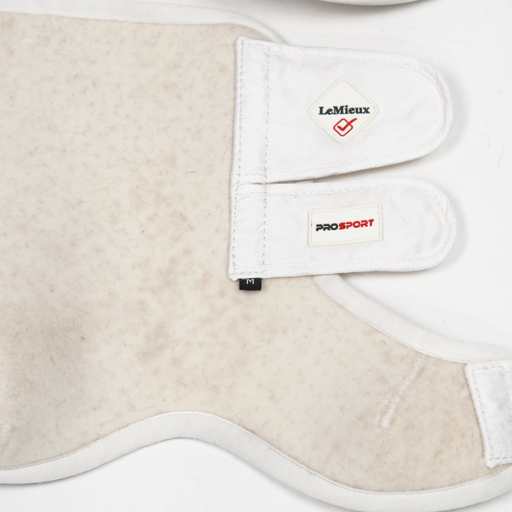 Mjuka benskydd/damasker i vitt med kardborrespännen från LeMieux.