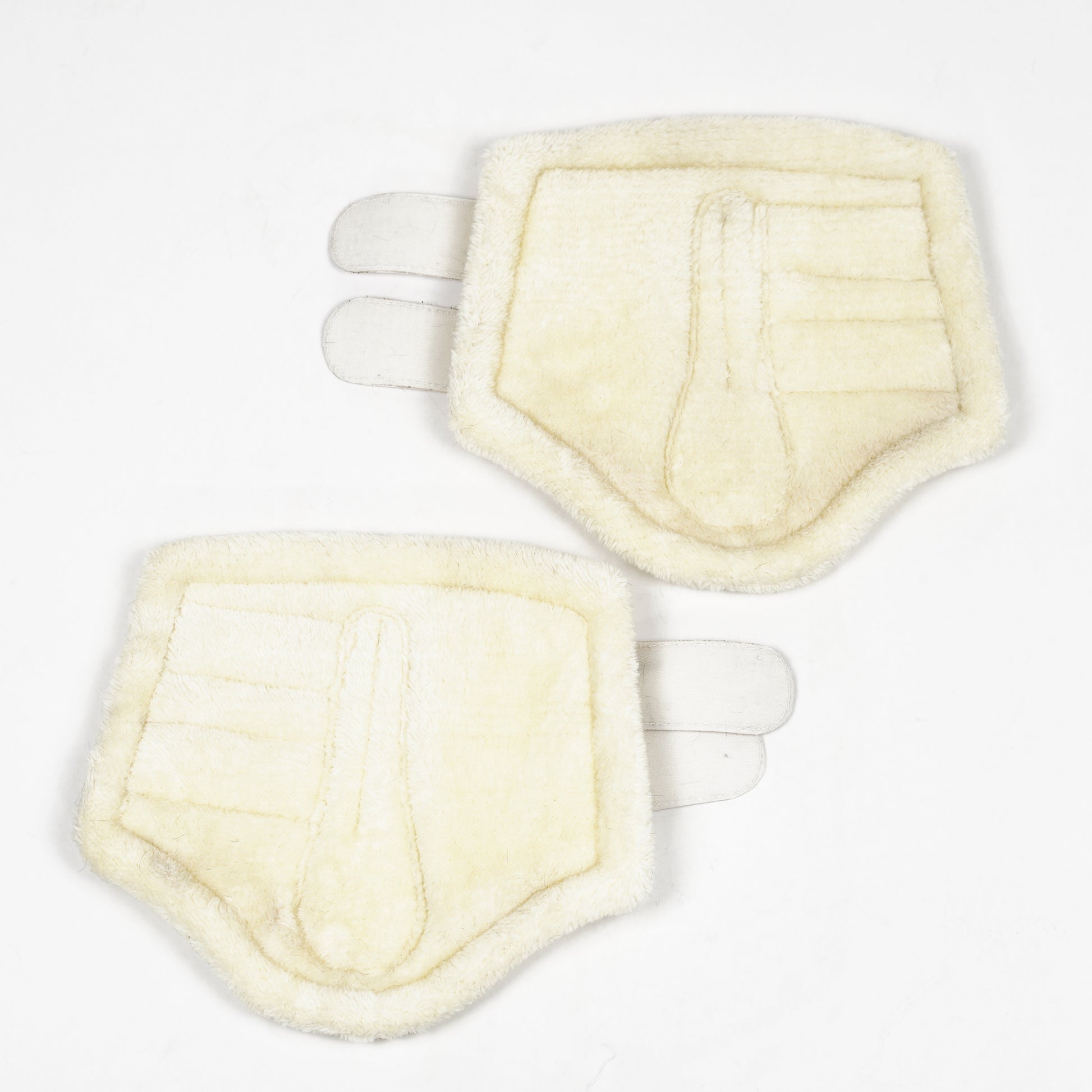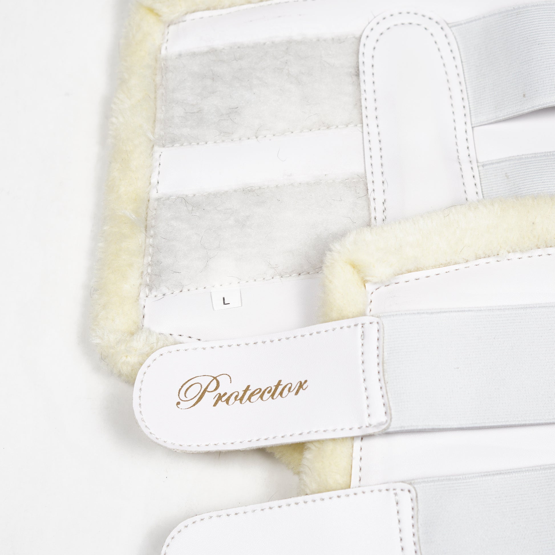 Mjuk benskydd i vitt syntetläder med teddyfoder och elastiska kardborren från Protector.