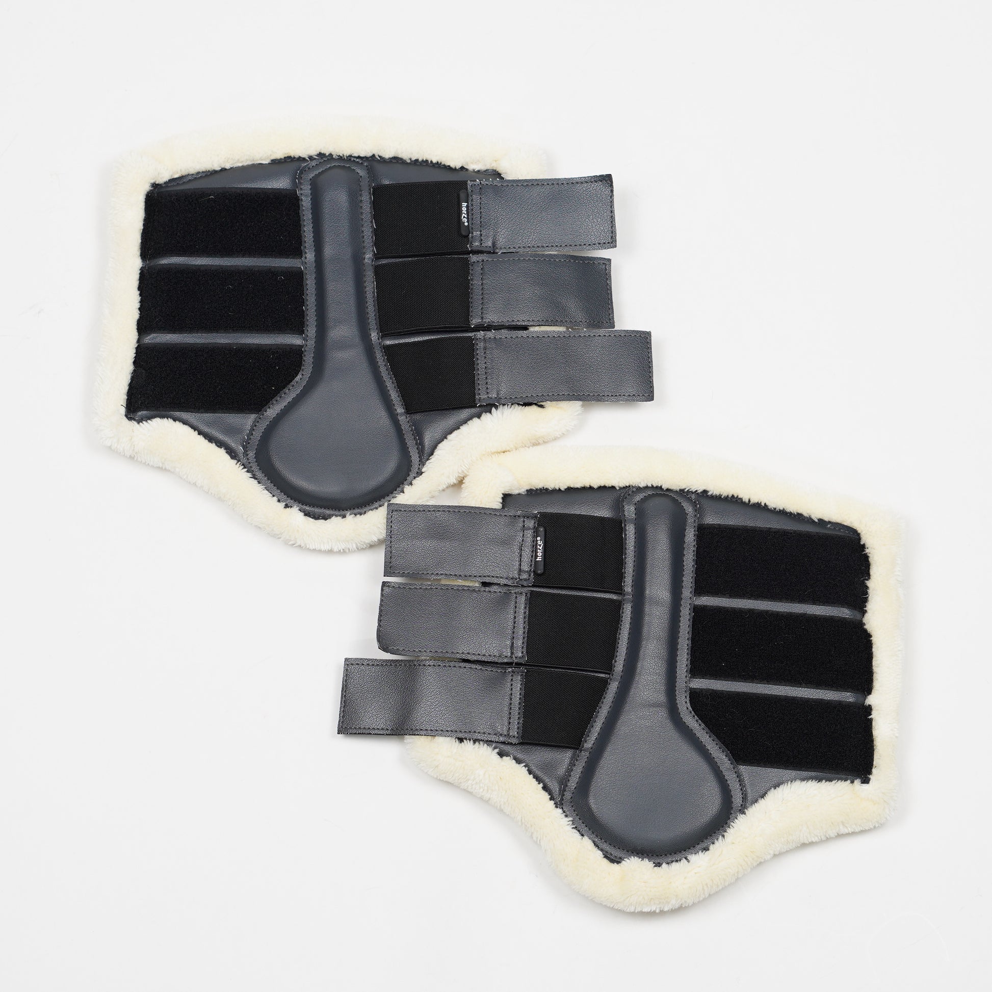 Mjuk benskydd med teddyfoder på insidan, grått syntetläder på utsidan och elastiska kardborrespännen från Horze.