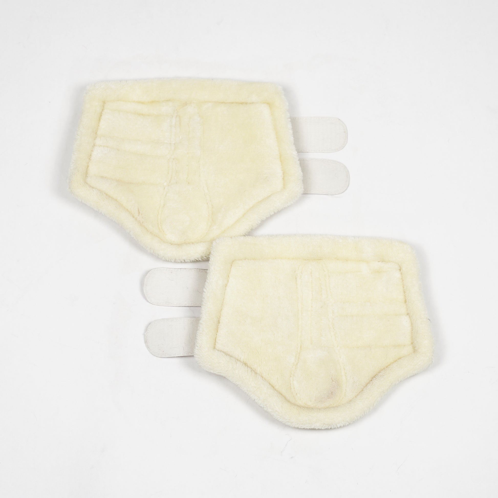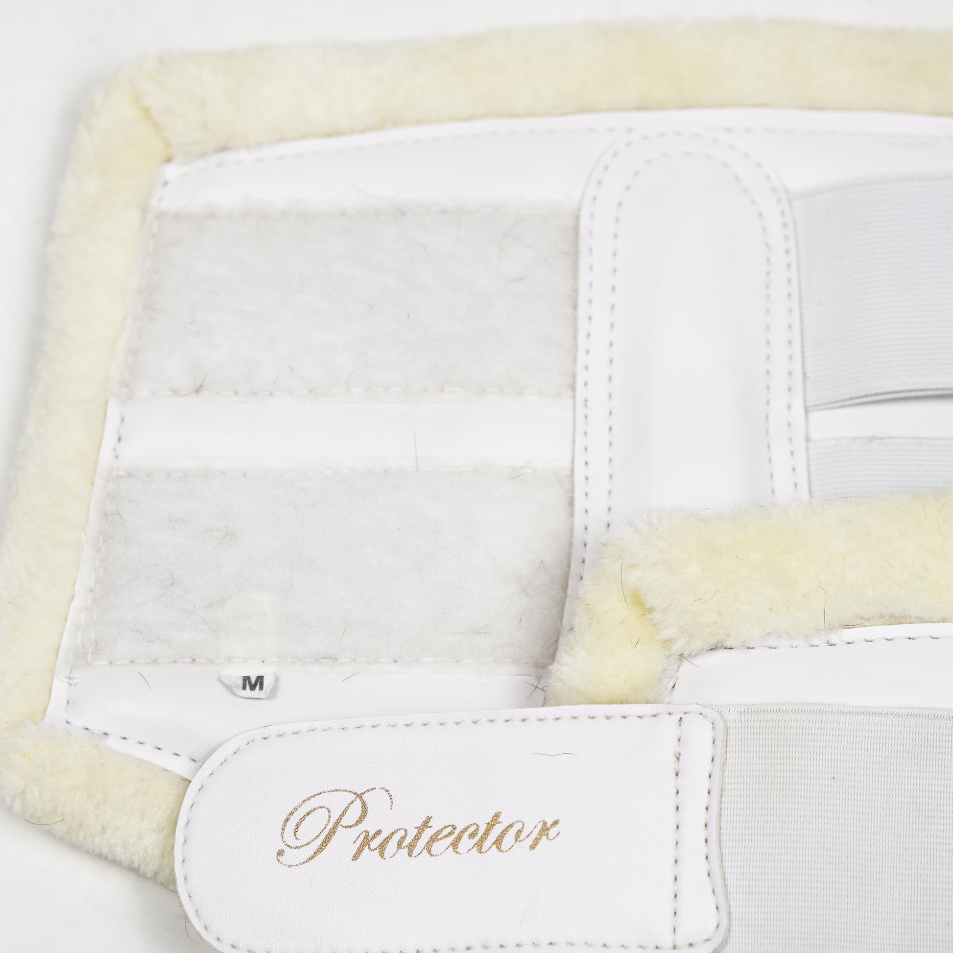 Mjuk benskydd i vitt syntetläder med teddyfoder och elastiska kardborren från Protector.