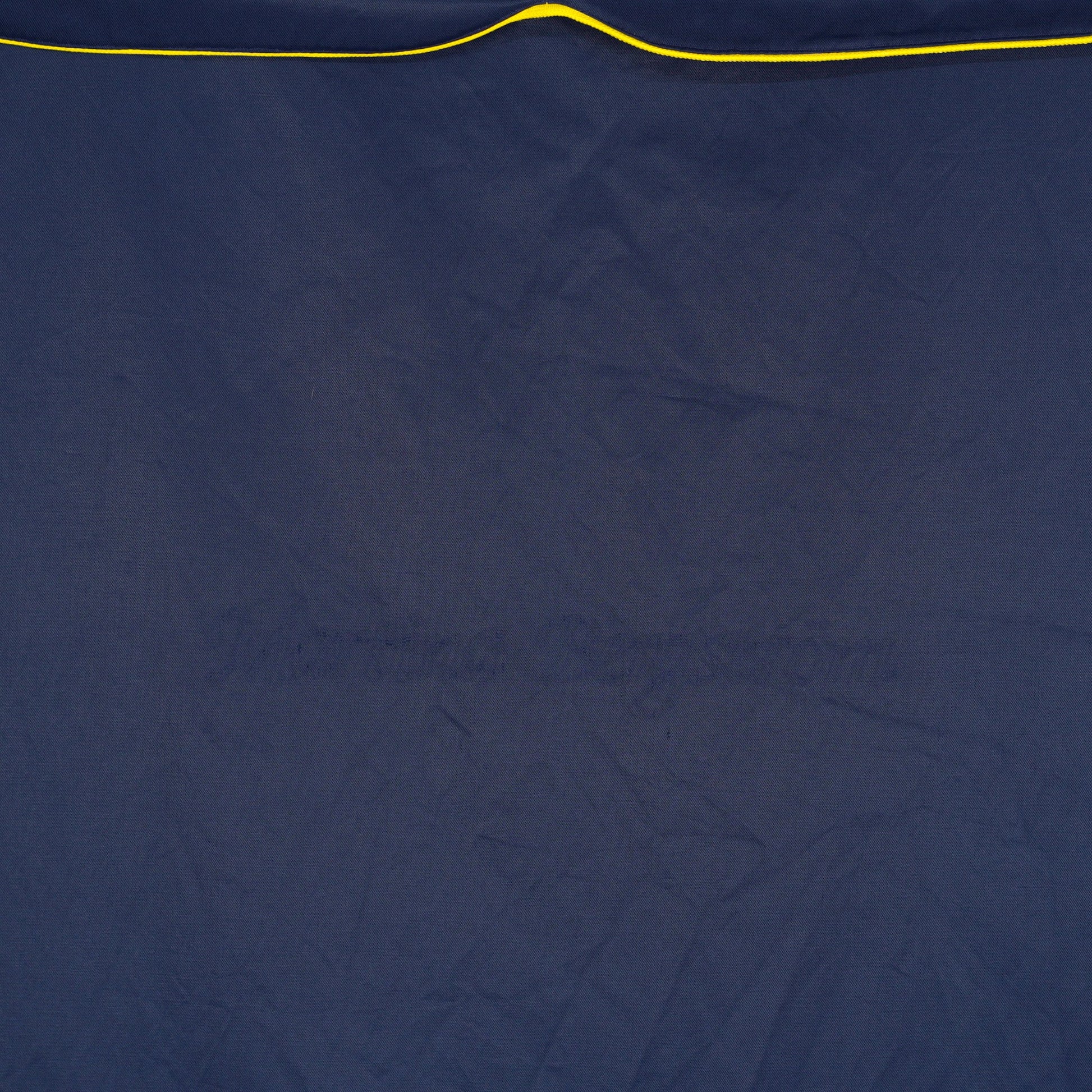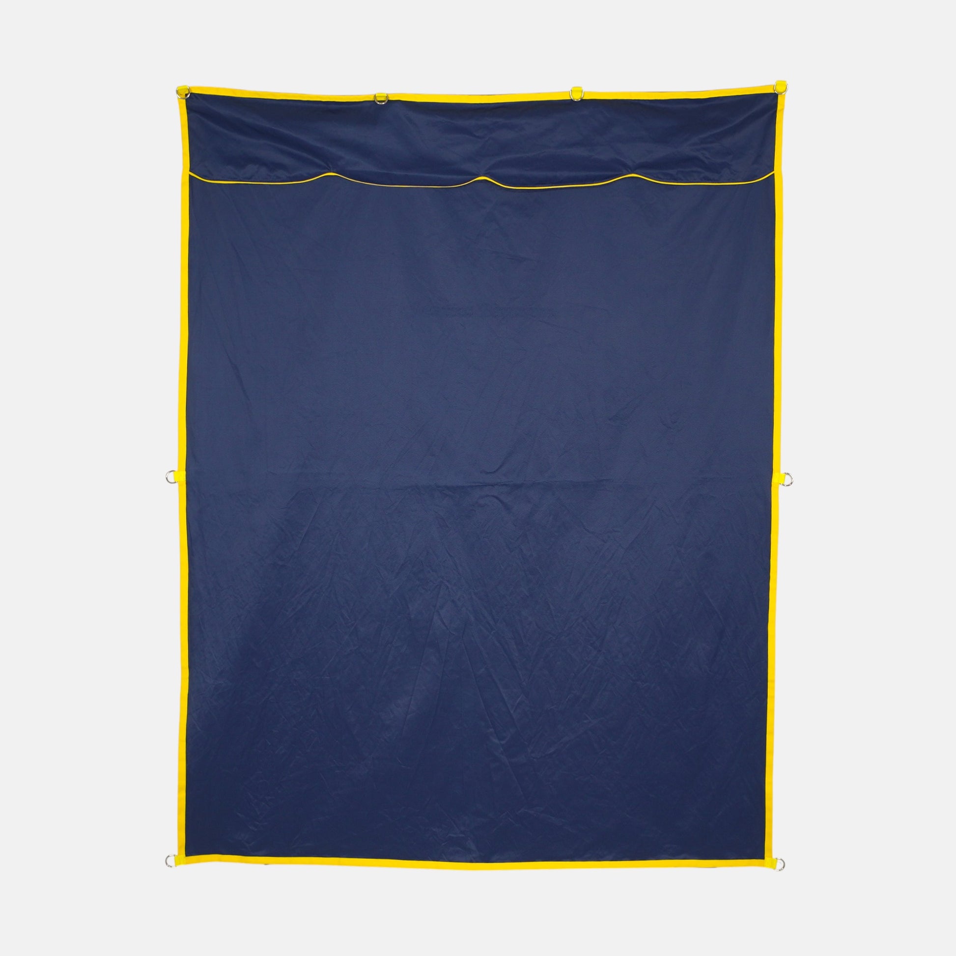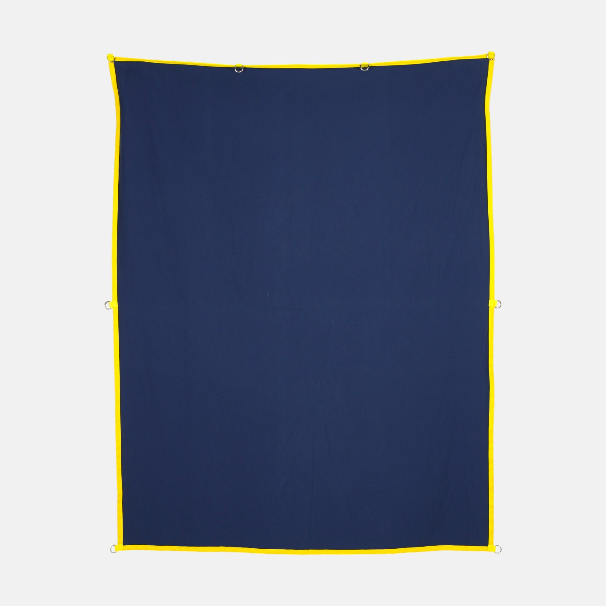 Blå boxgardin med gula kanter och D-ringar i överkanten. Boxgardinen har vart broderad.