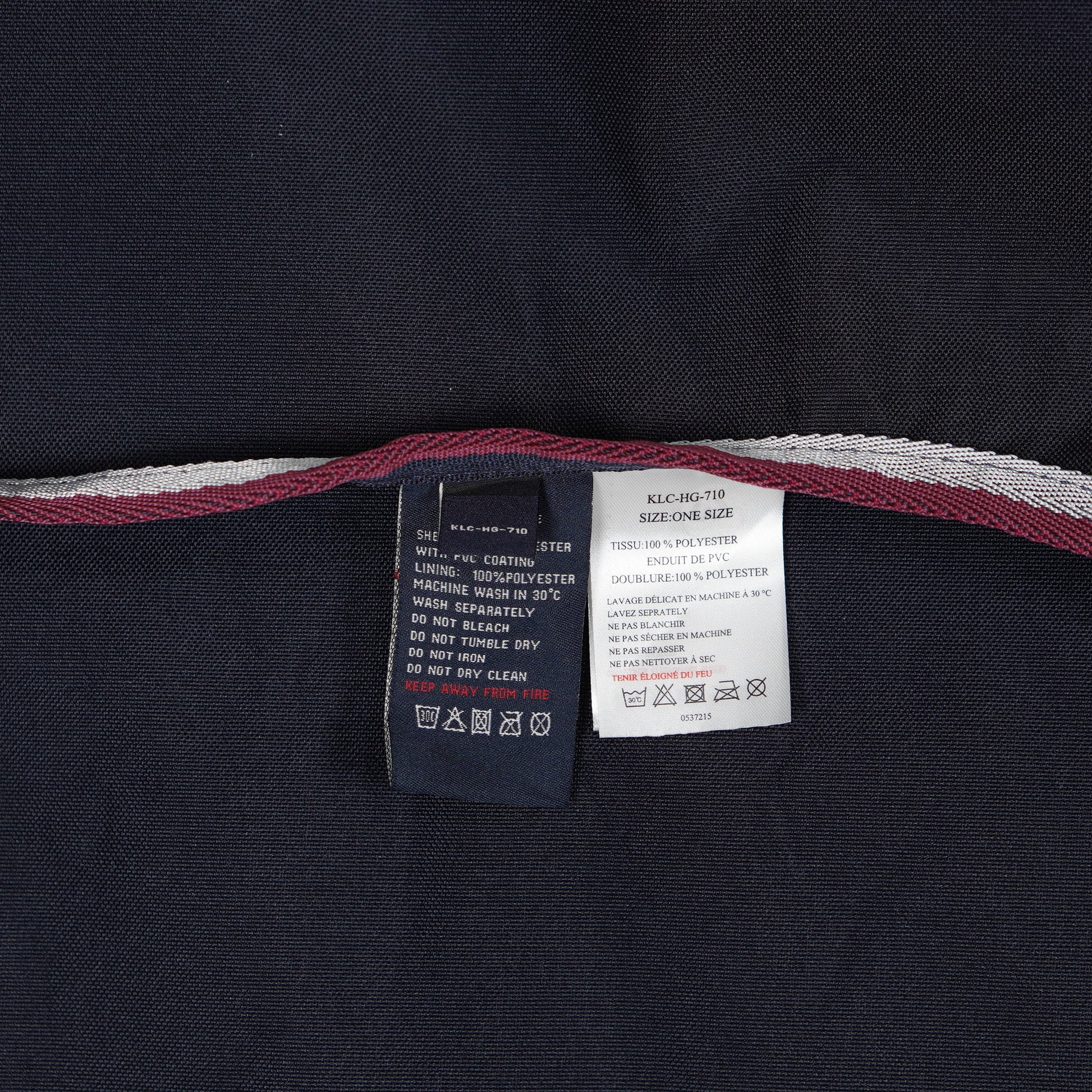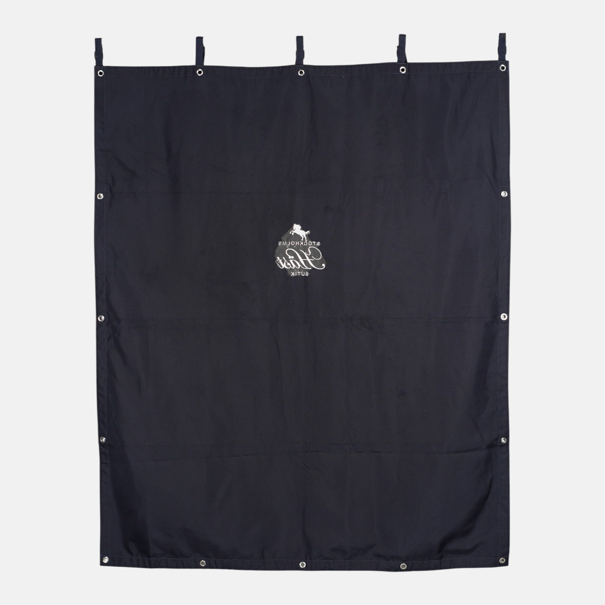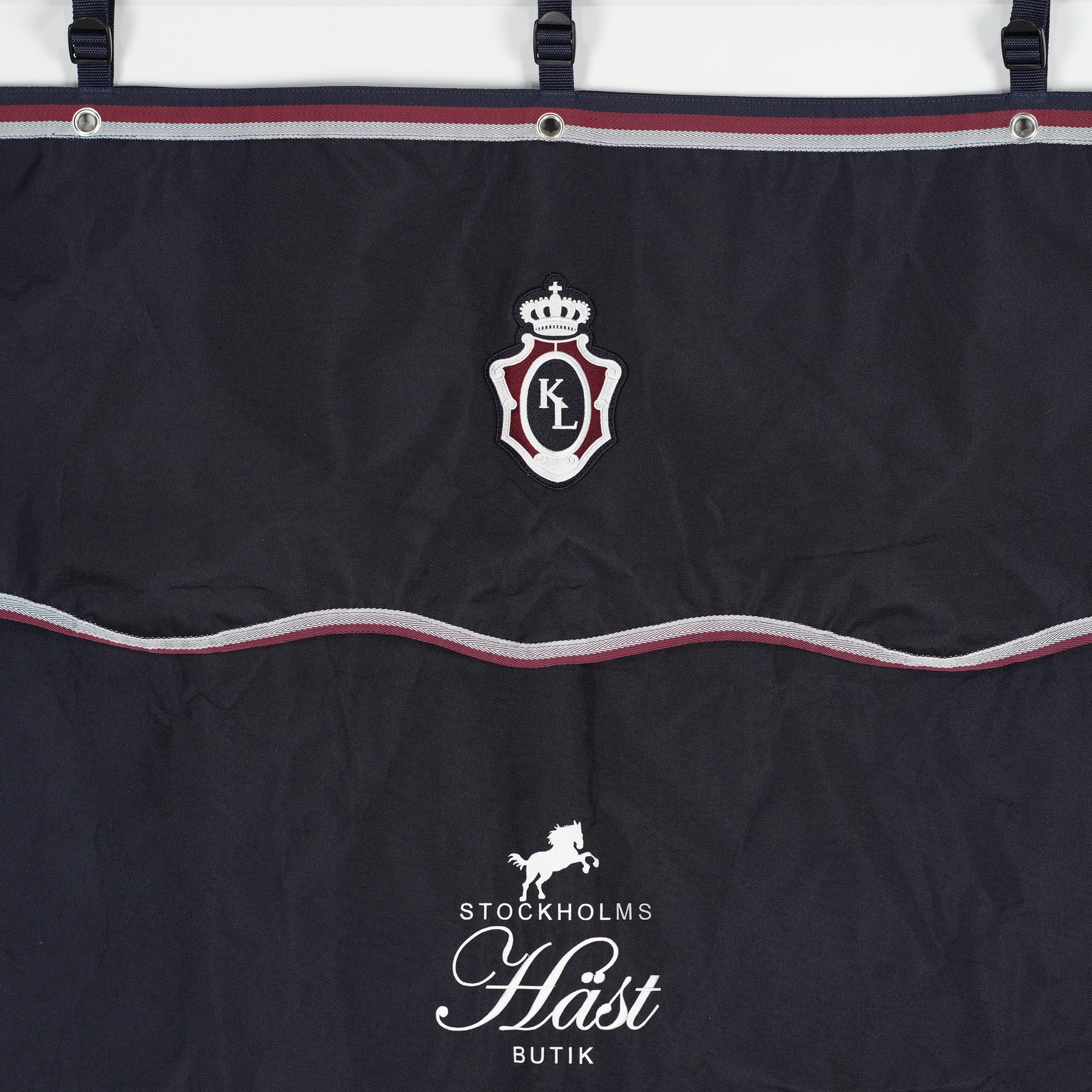 Boxgardin i blå kraftig nylon från Kingsland. Boxgardinen har broderats med "Stockholms Hästbutik", men är i ett sparsamt använt skick!