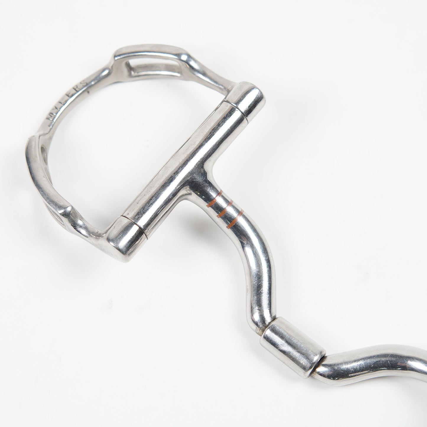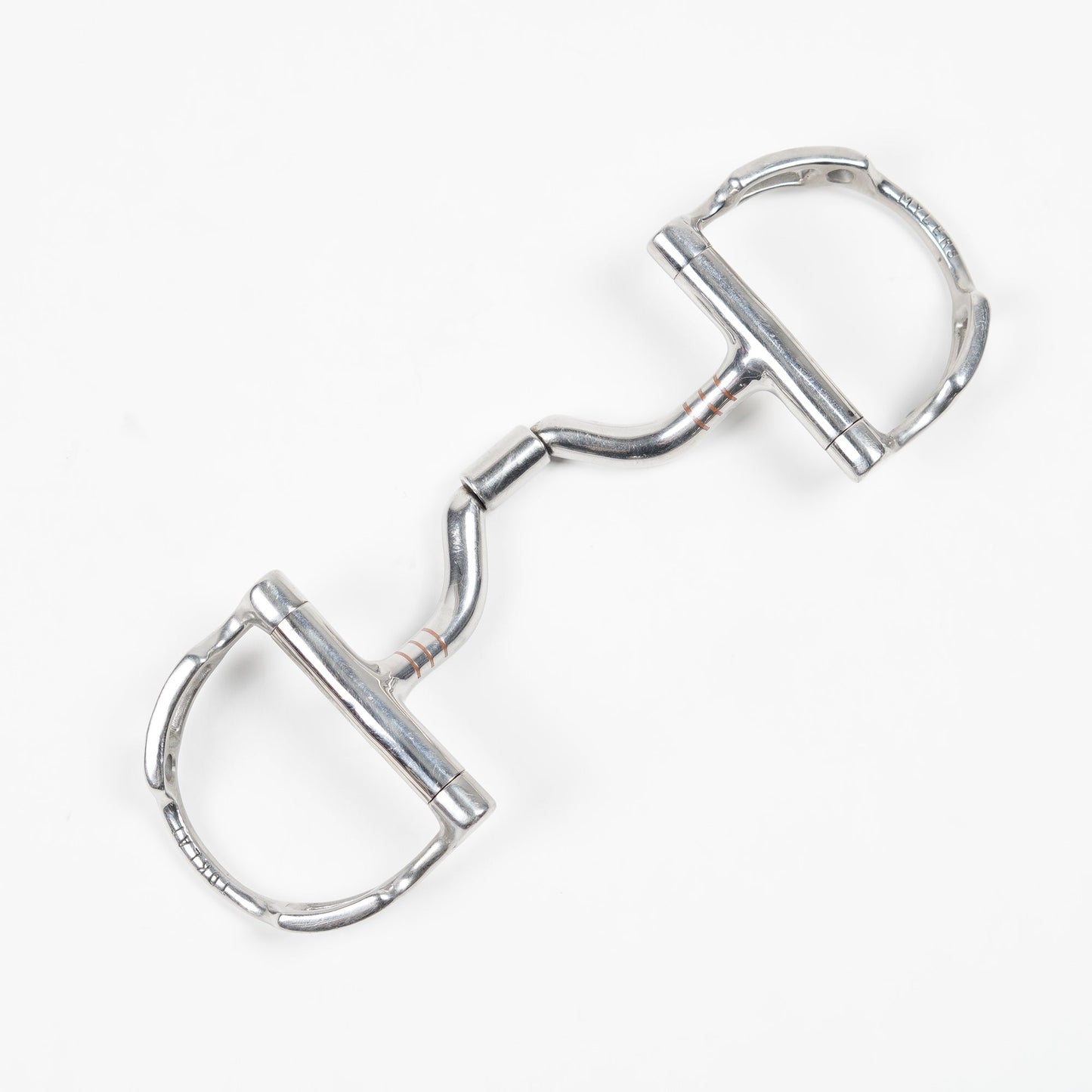 Gagbett med fasta D-ringar och kopparinlägg på insidan från Myler Toklat. Bettet är i ett använt bra skick.