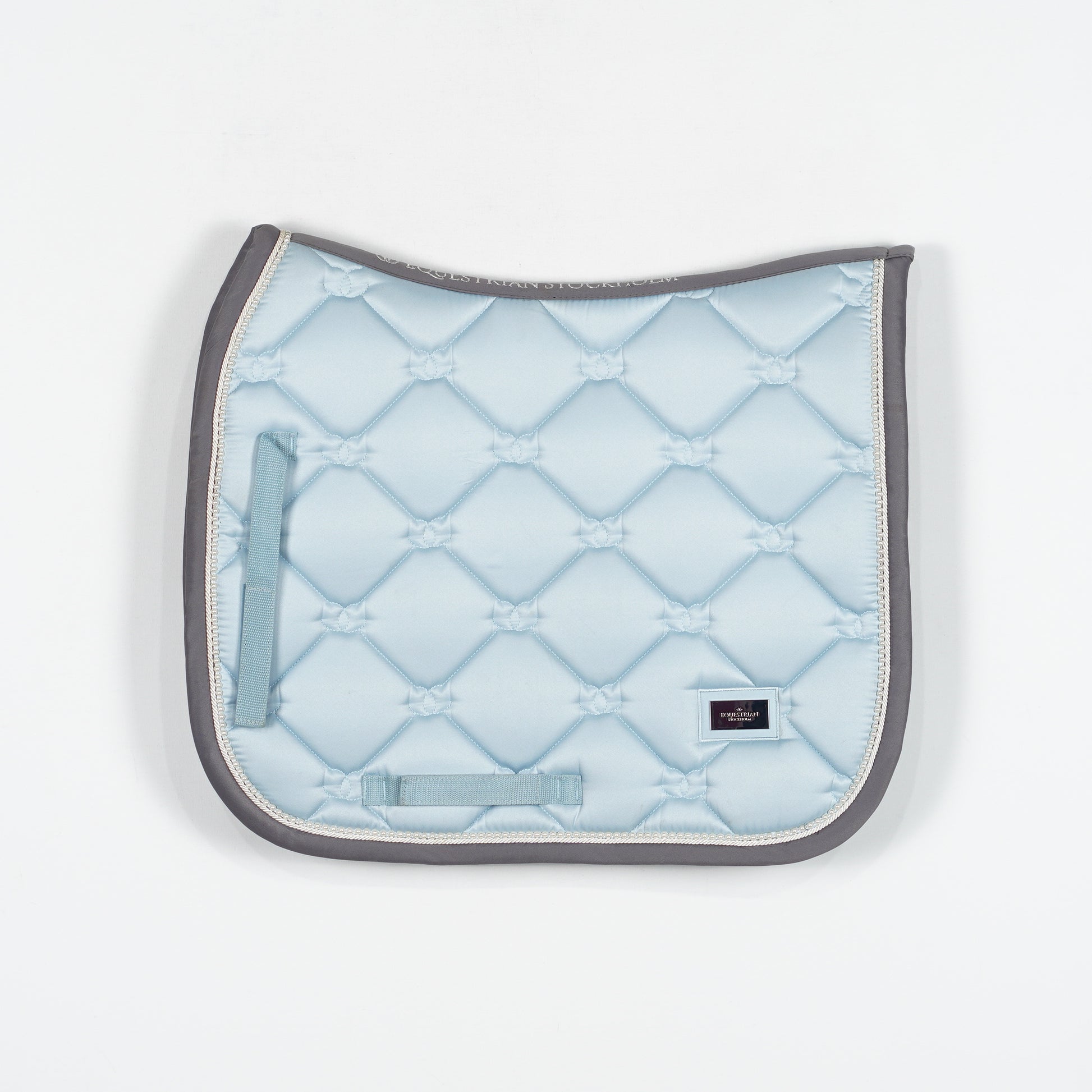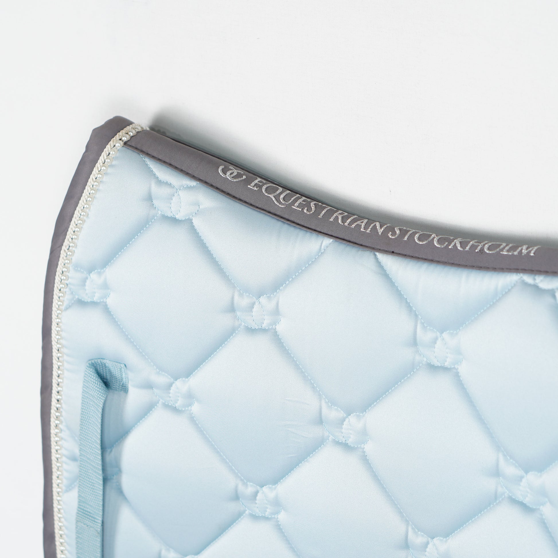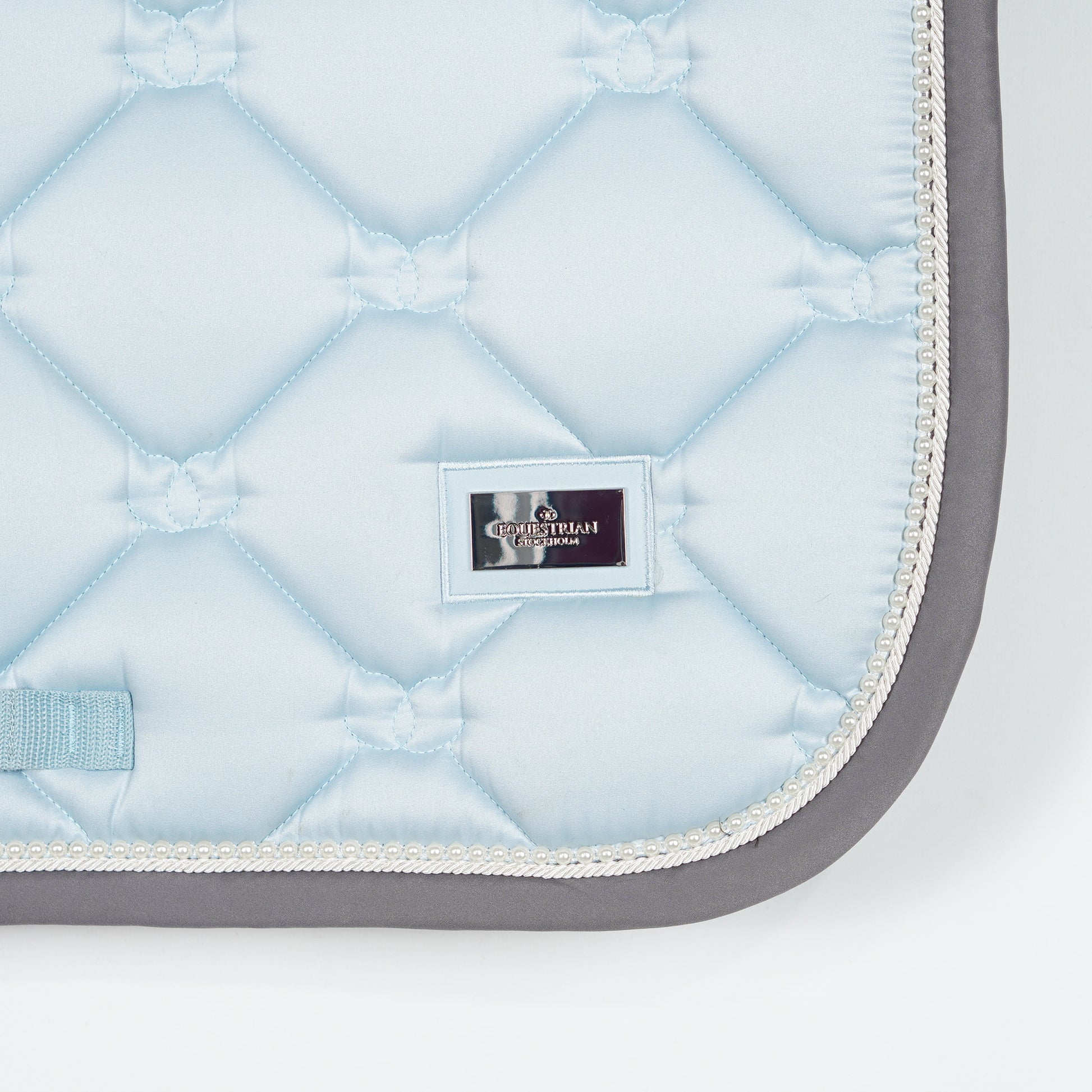 Ljusblått dressyrschabrak med en passpoal av vita pärlor och grå kant från Equestrian Stockholm.
