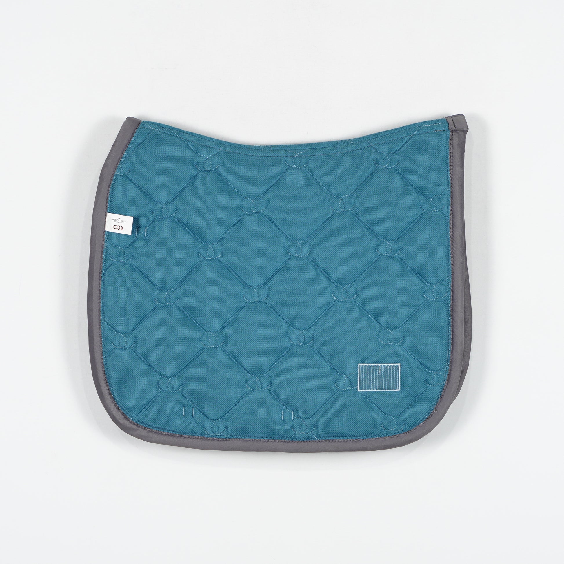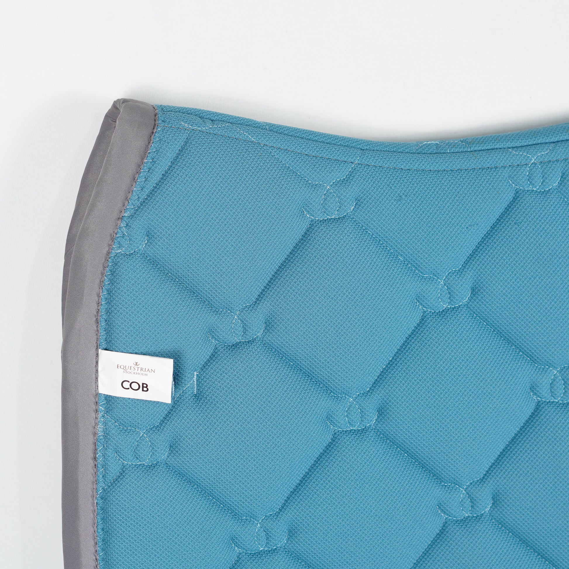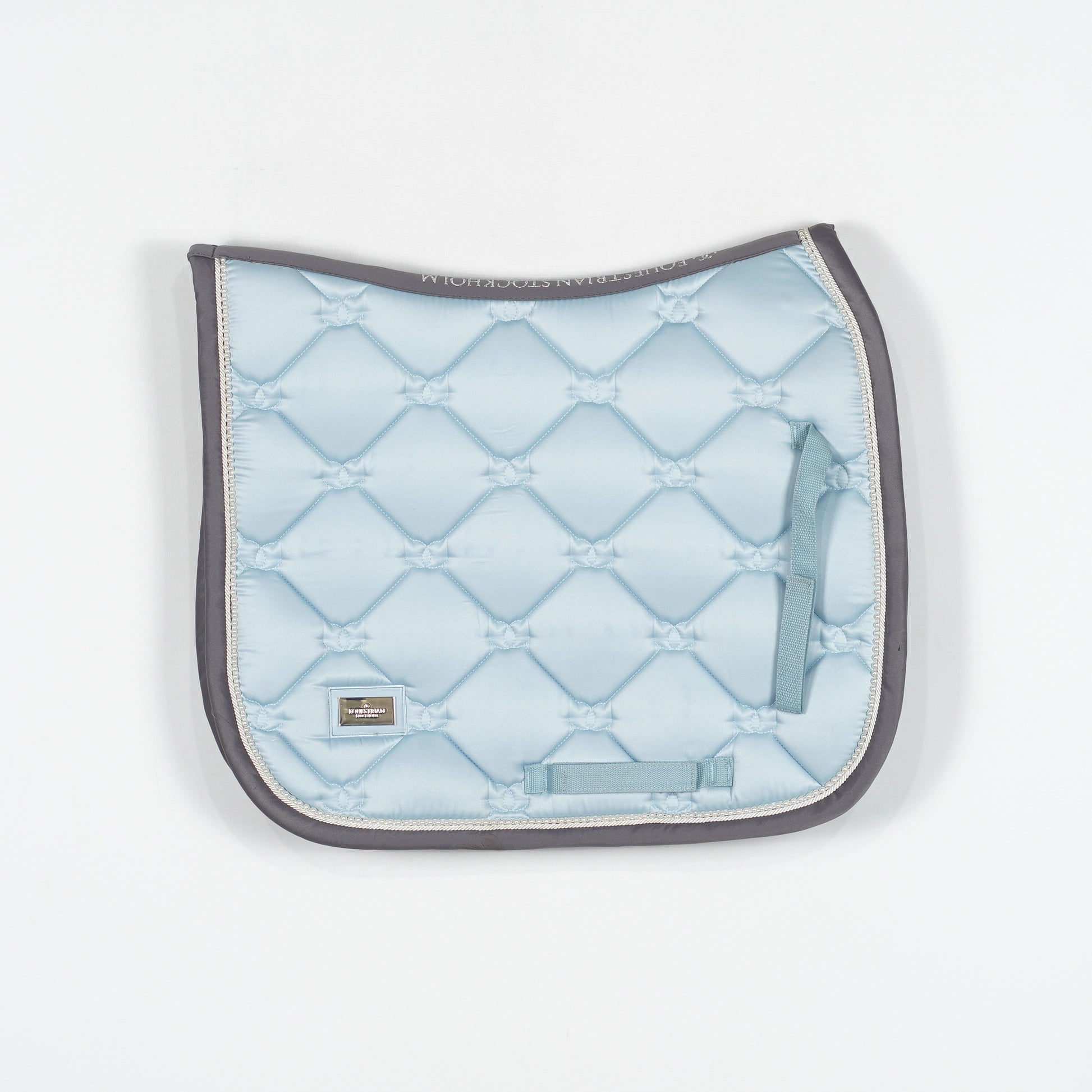 Ljusblått dressyrschabrak med en passpoal av vita pärlor och grå kant från Equestrian Stockholm.