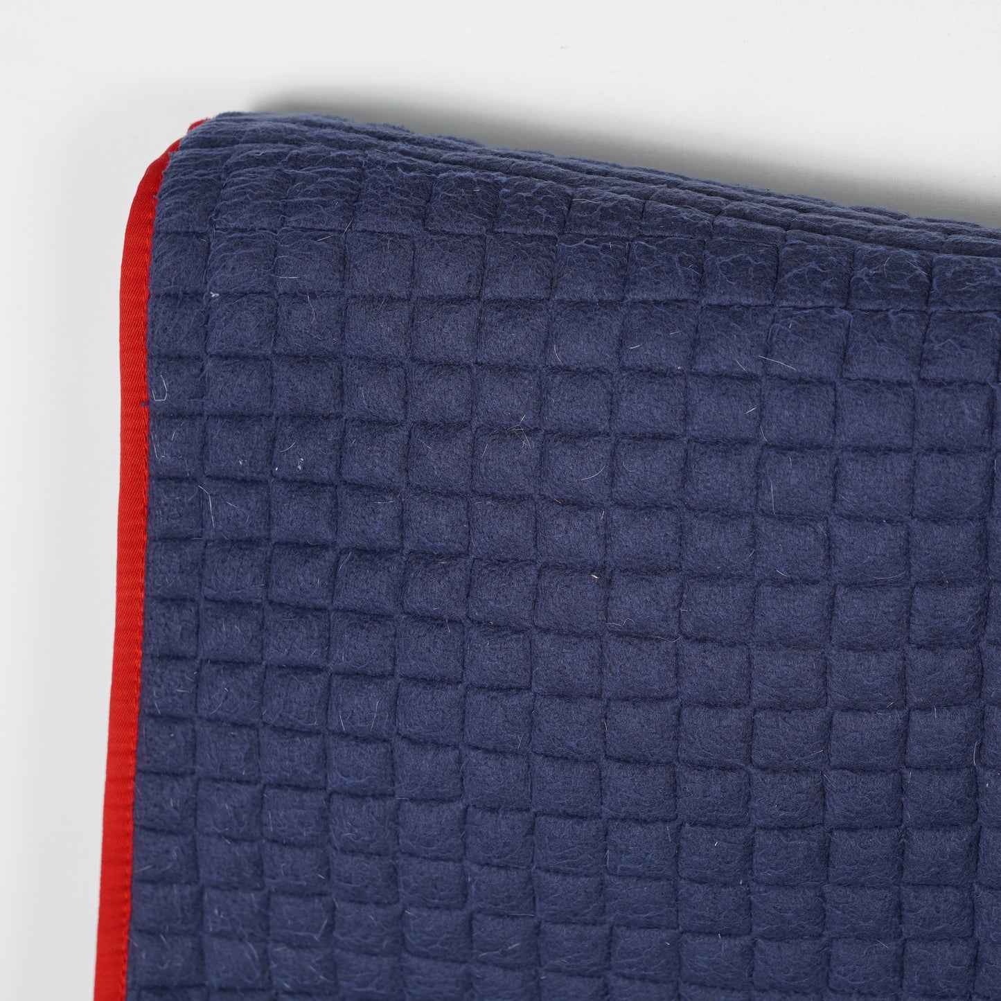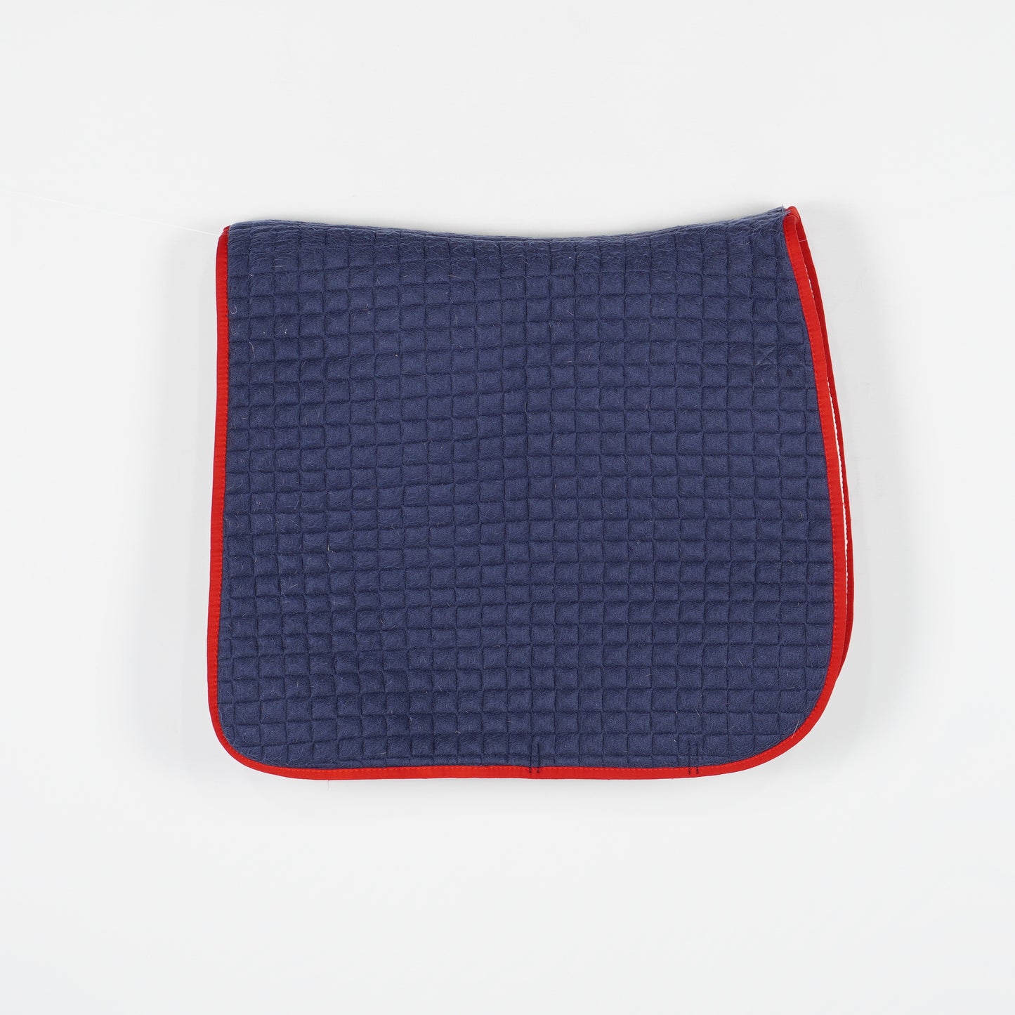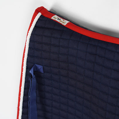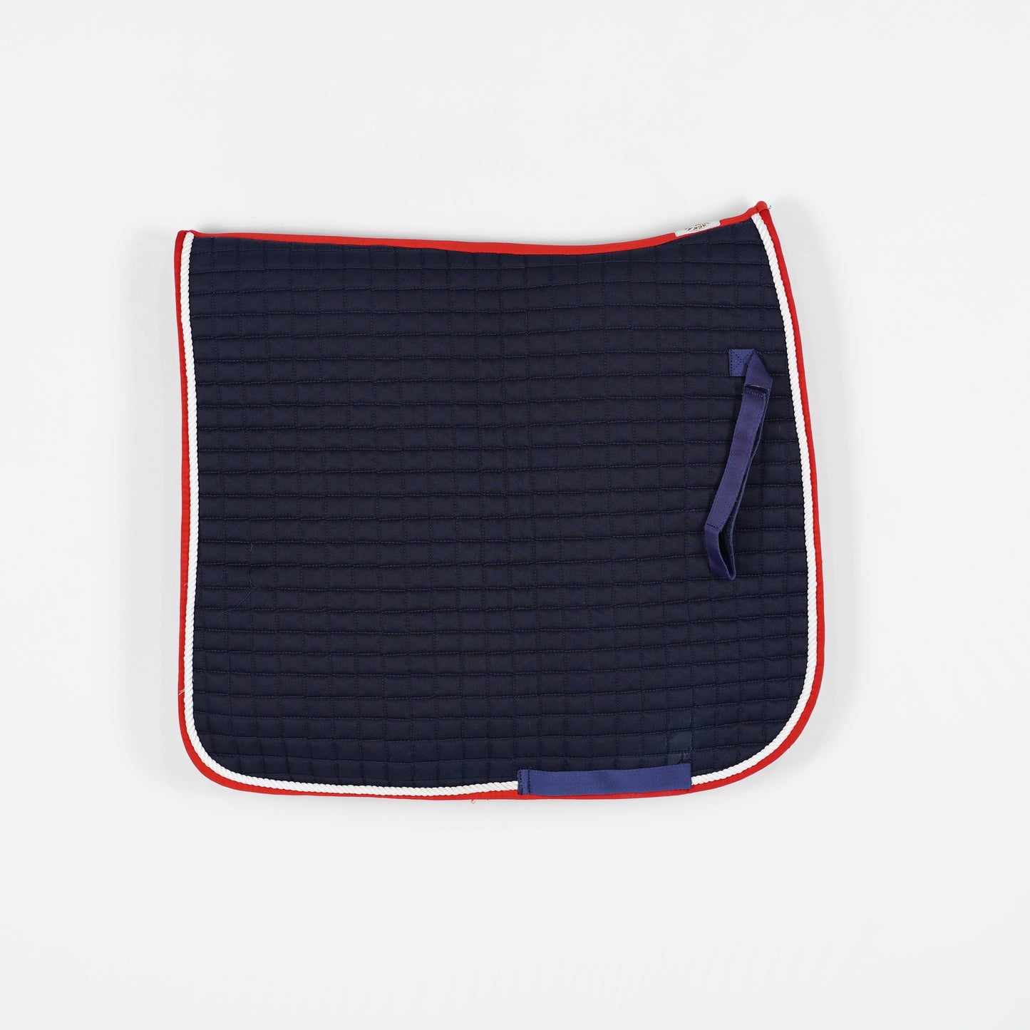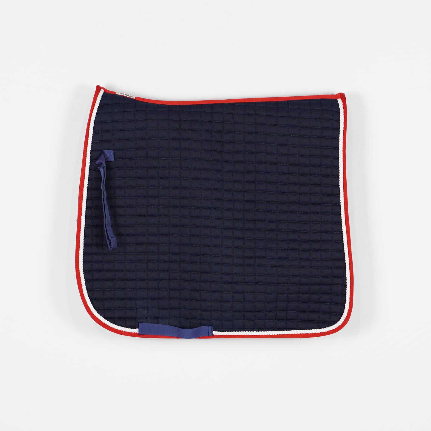 Blått dressyrschabrak med vit passpoal och röd kant från Lyckås Ridsport.