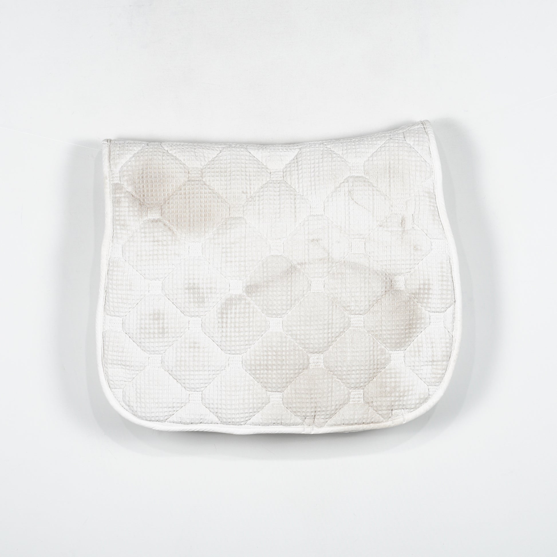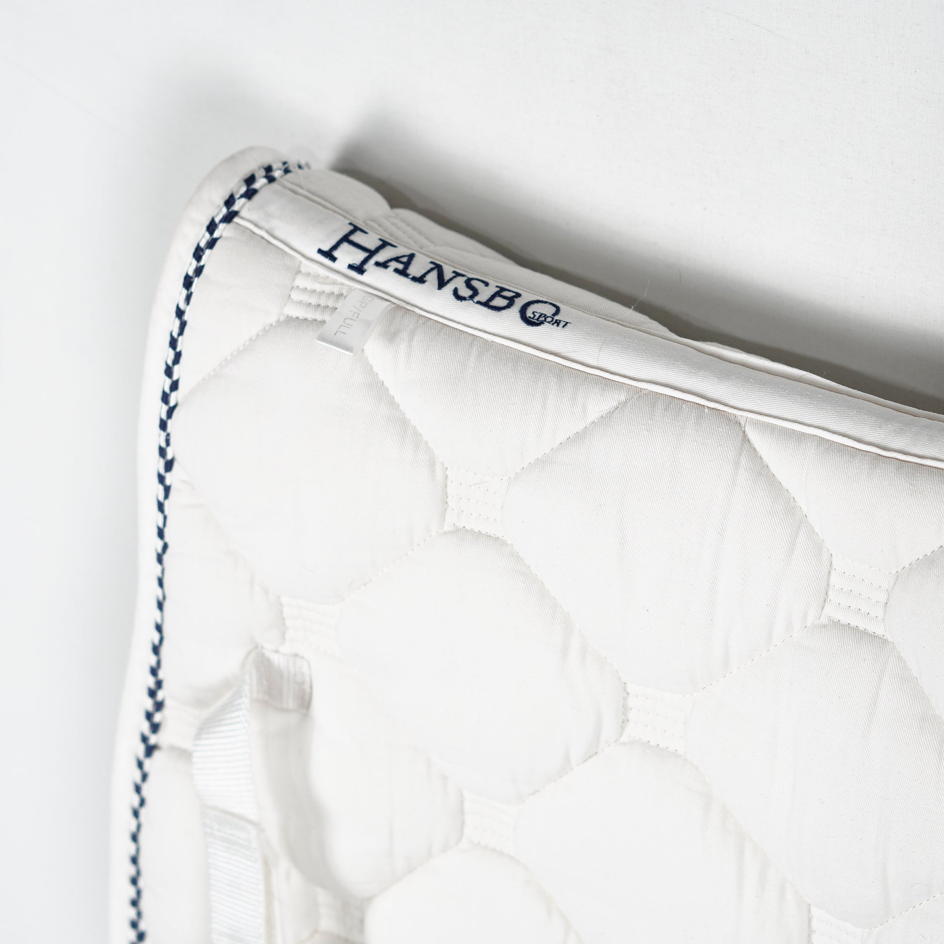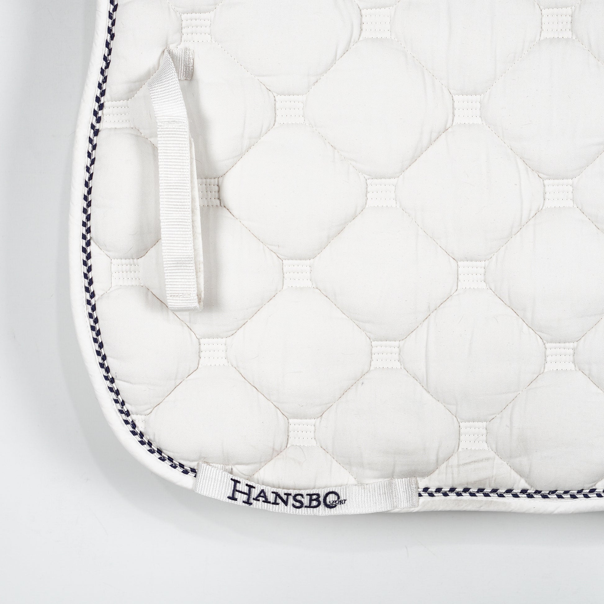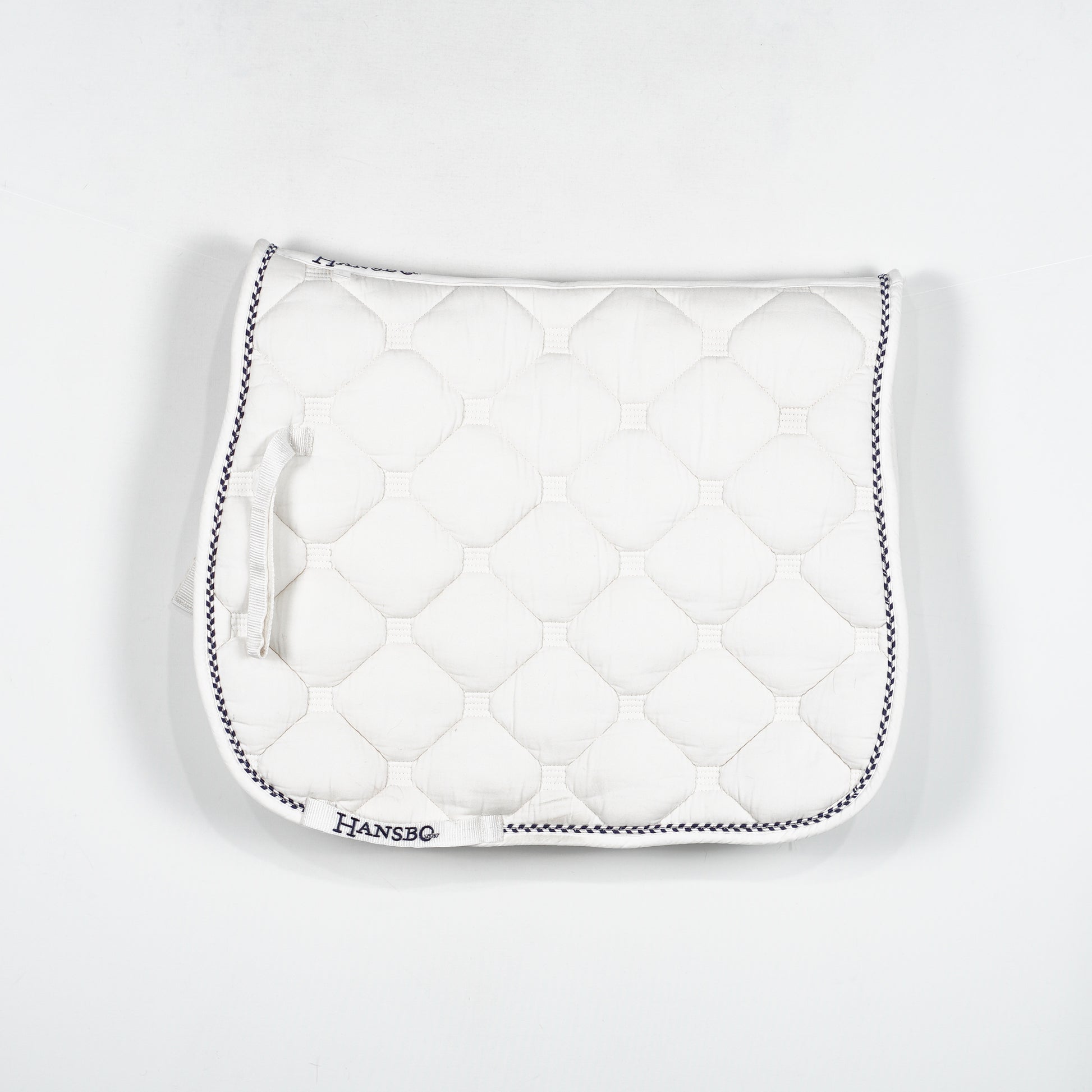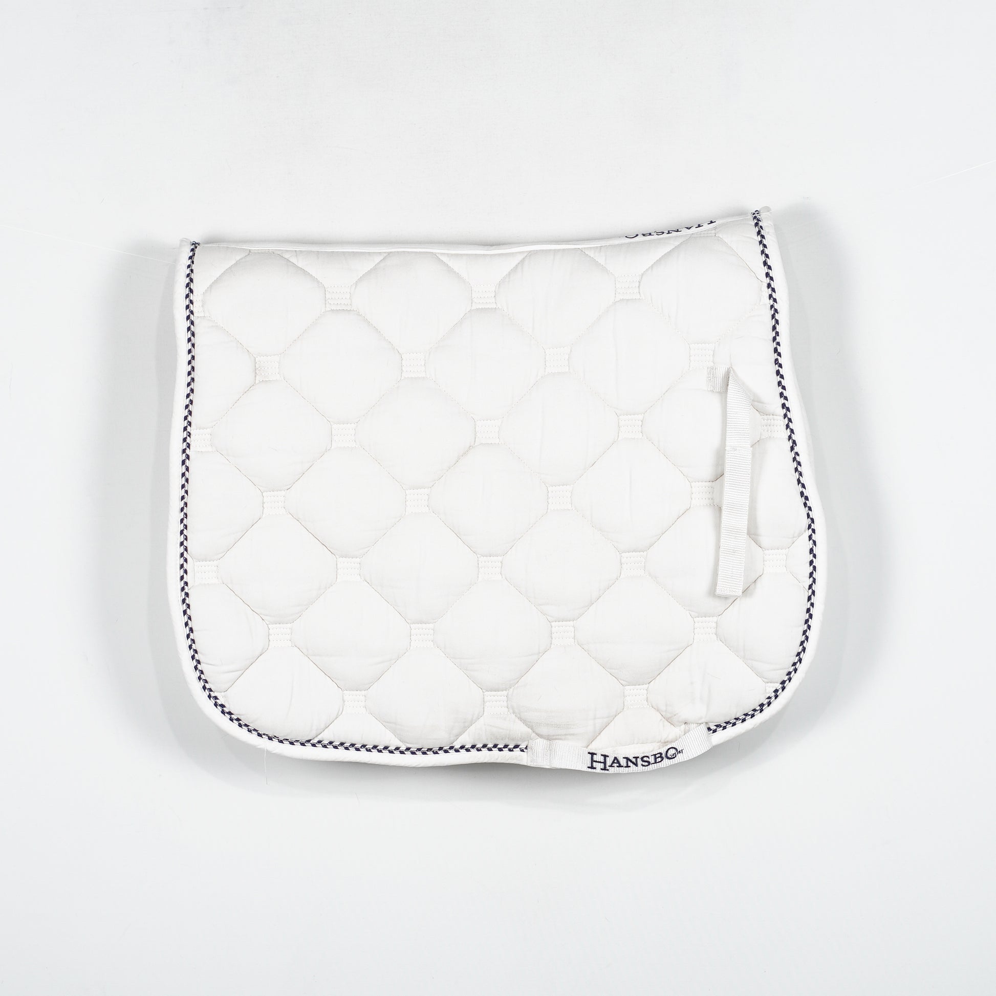 Vitt, välstoppat dressyrschabrak med blå-vit passpoal från Hansbo Sport.
