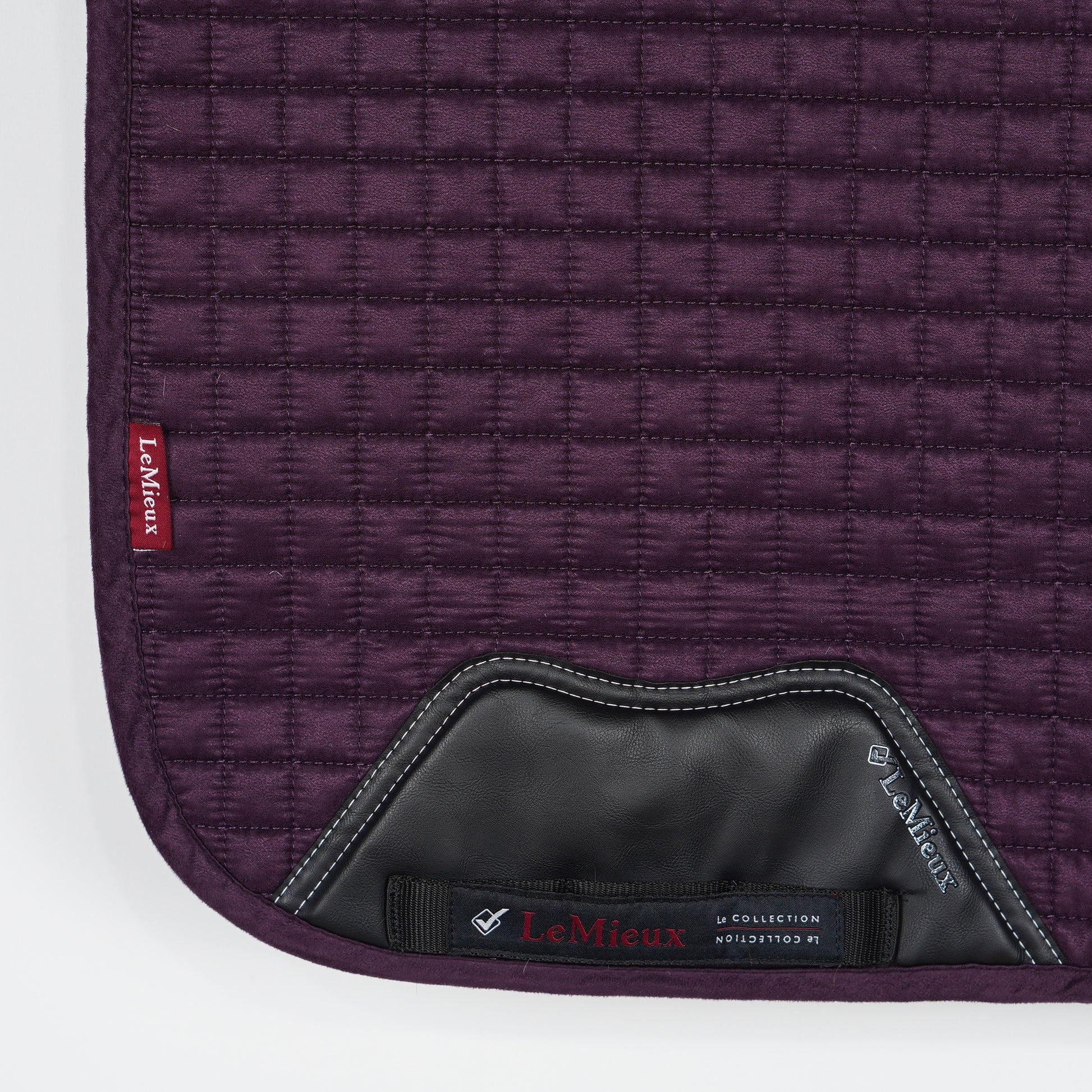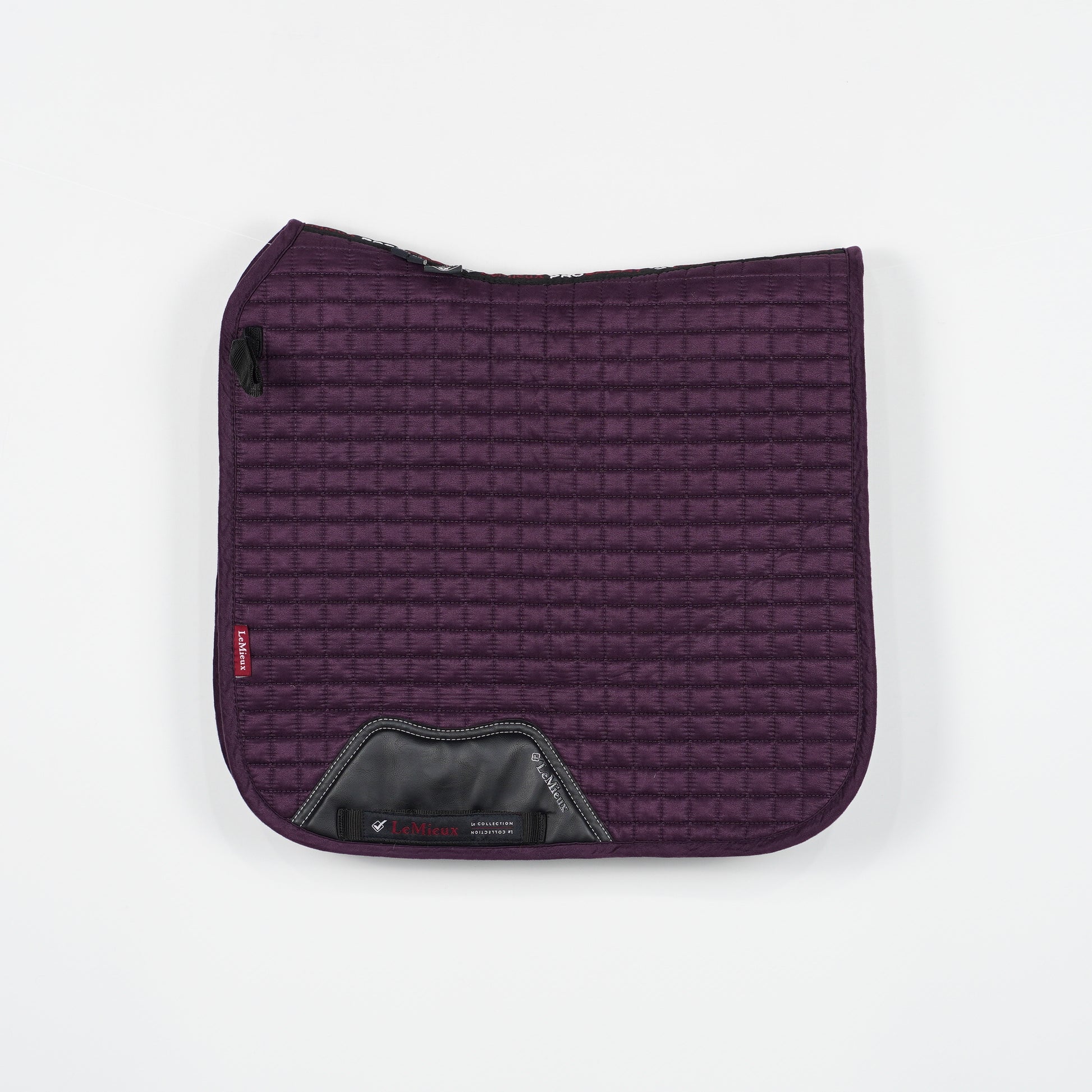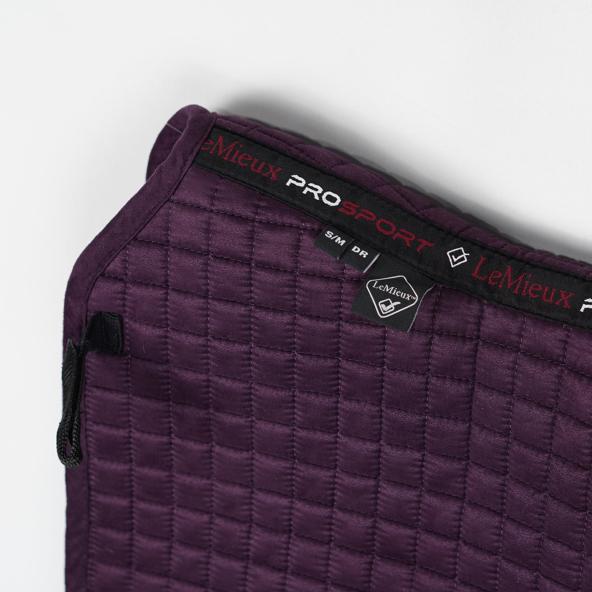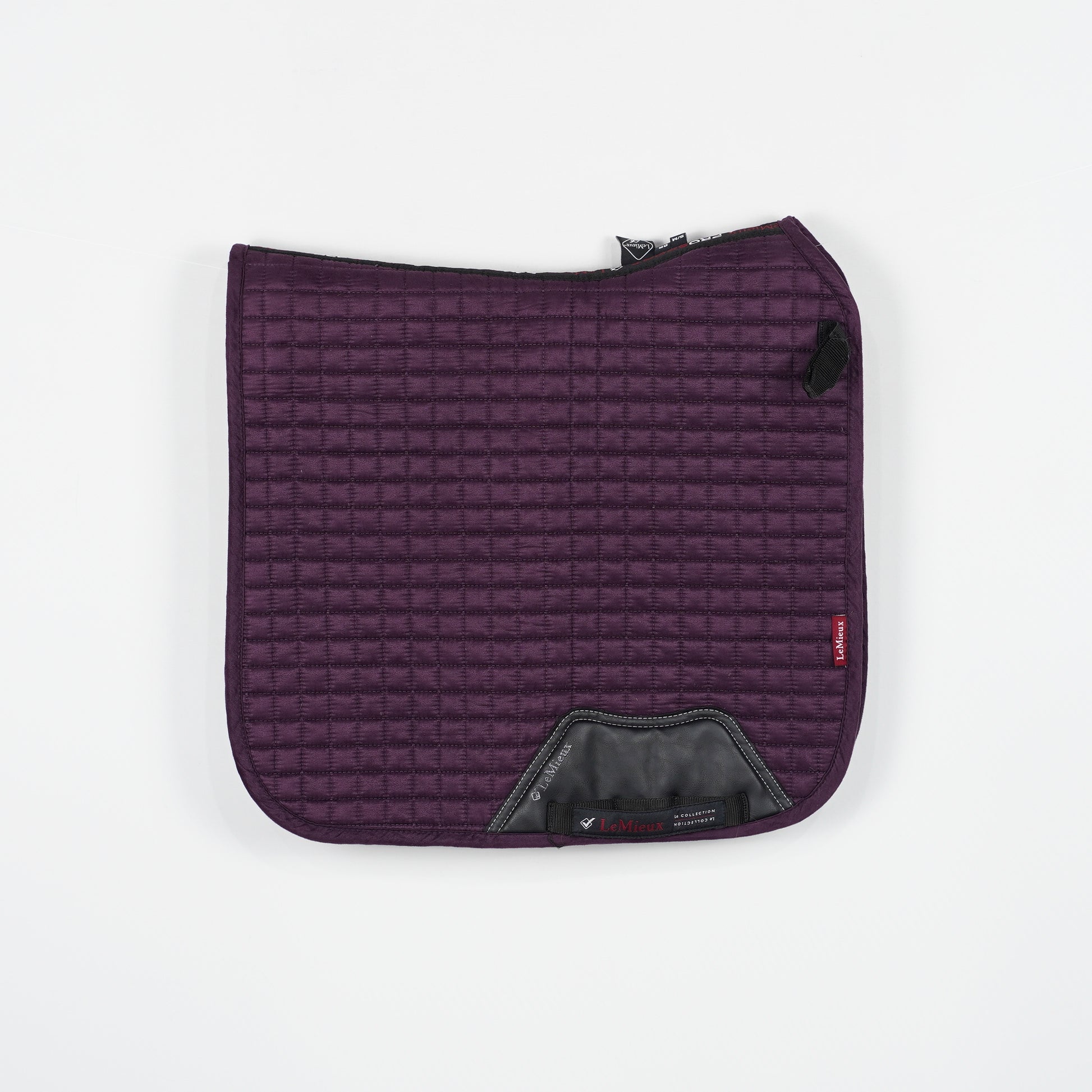 Lila dressyrschabrak med elastiska stroppar och förstärkning i syntetläder vid sadelgjordsöglan från LeMieux.