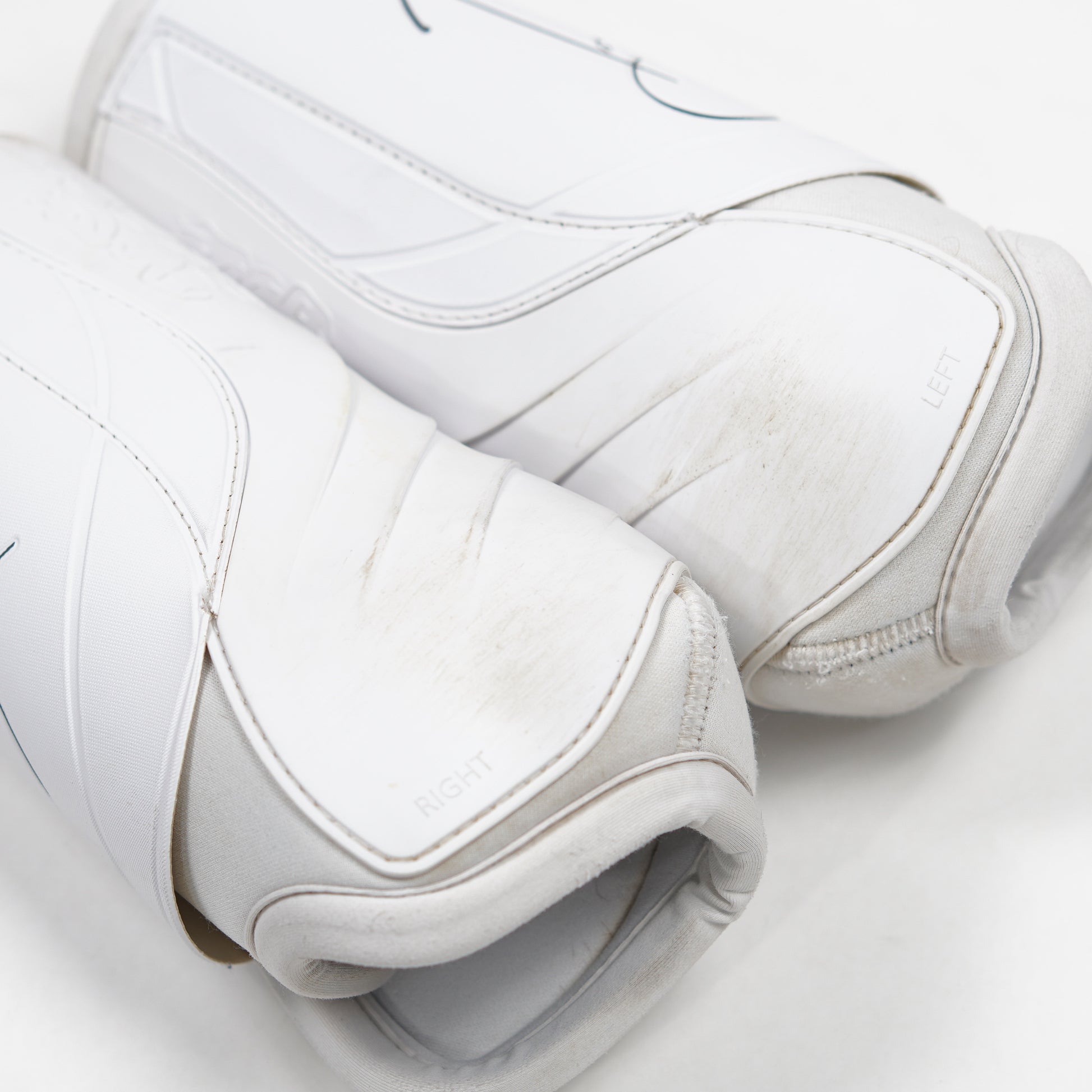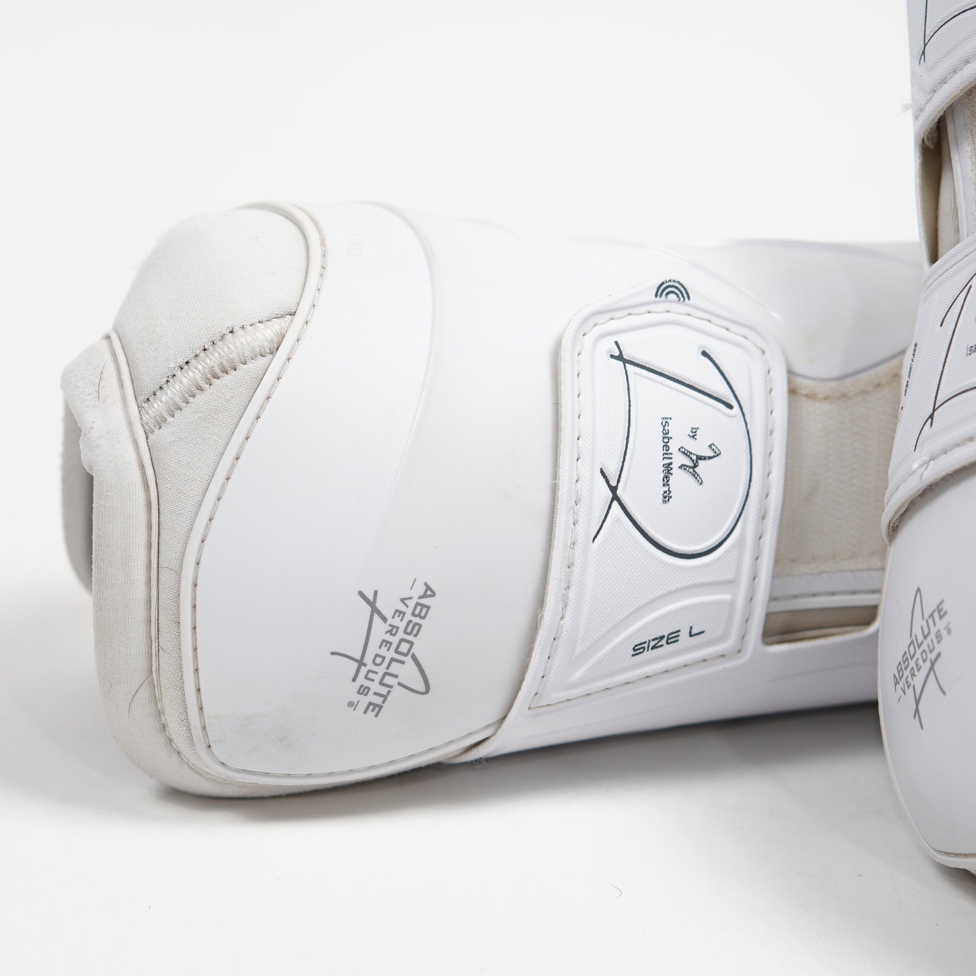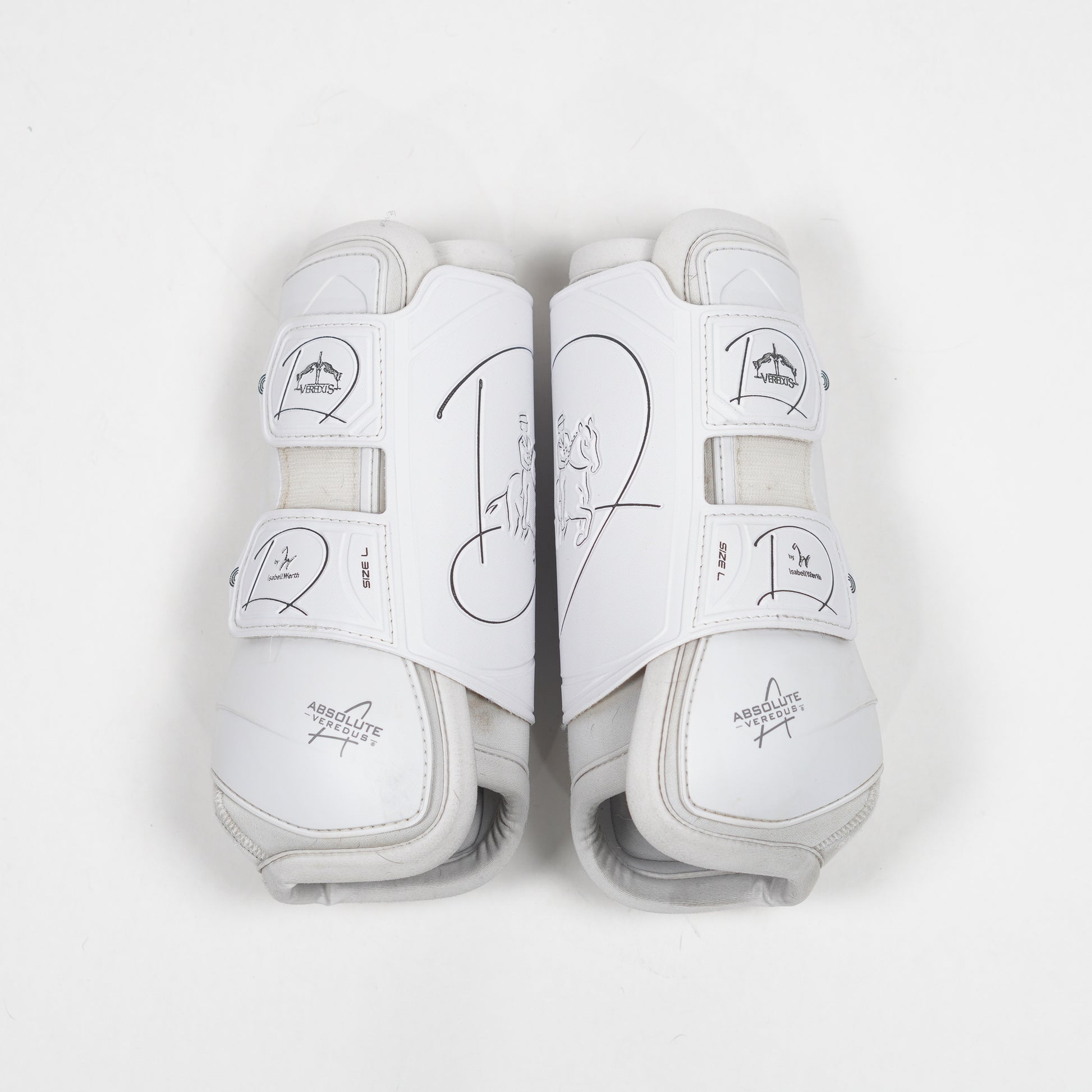 Vita dressyrskydd för framben i mjuk neopren med breda kardborrespännen från Veredus i samarbete med Isabell Werth. Skydden ger optimalt stöd och rörelsefrihet samtidigt som de är superenkla att sätta på och ta av.