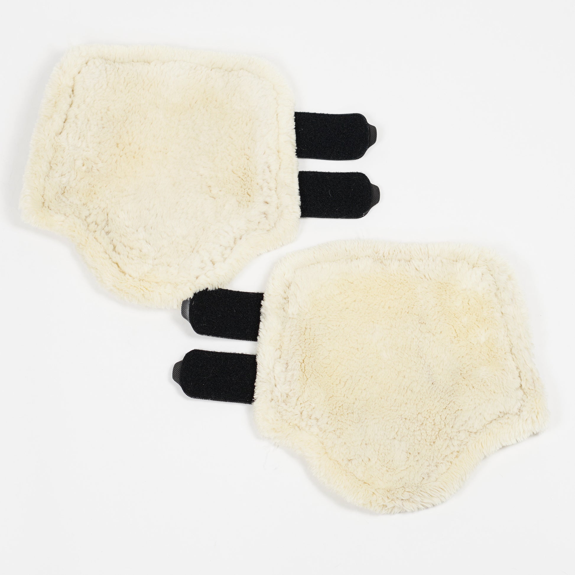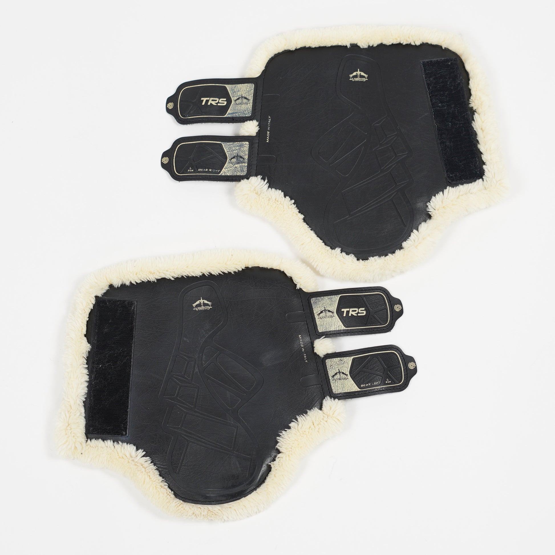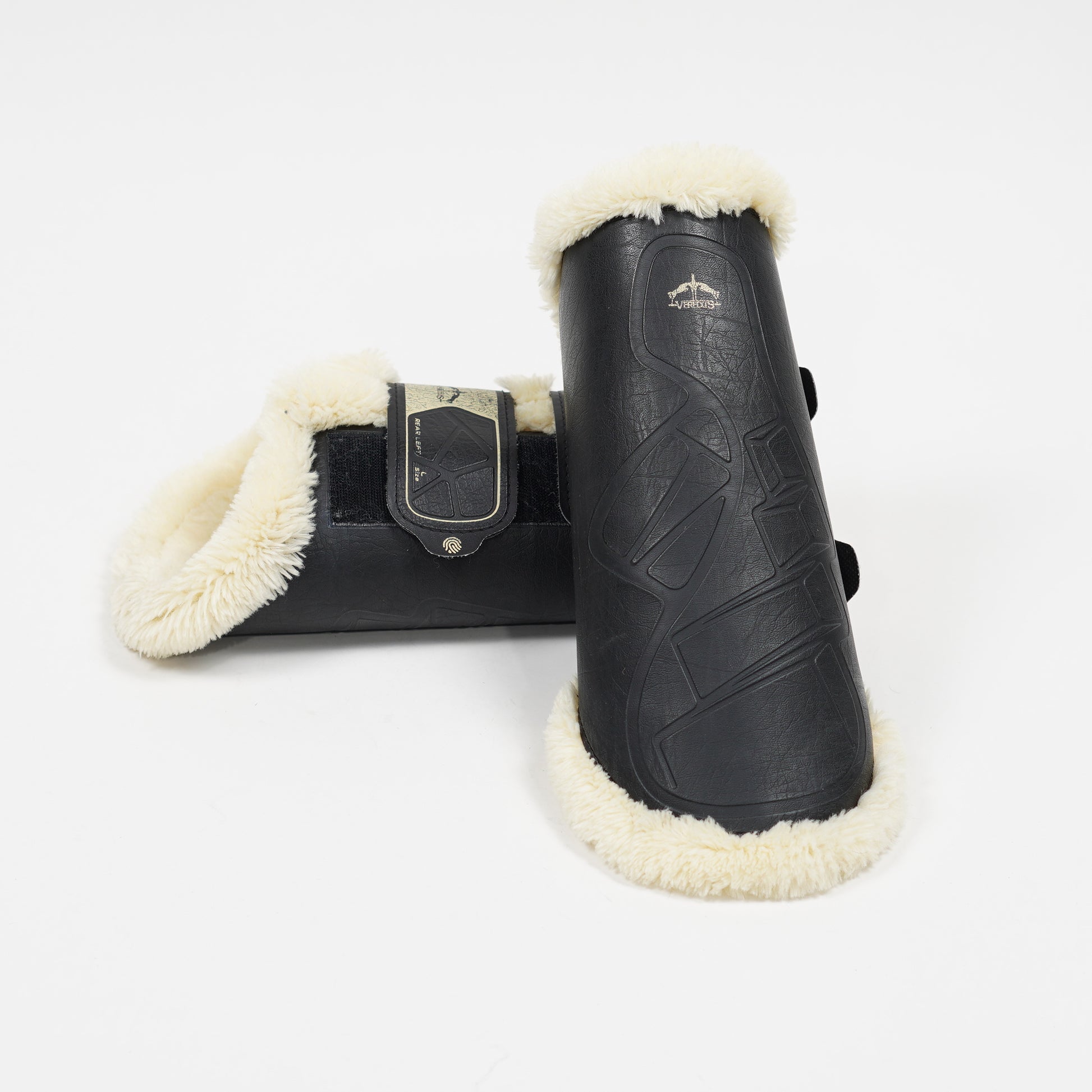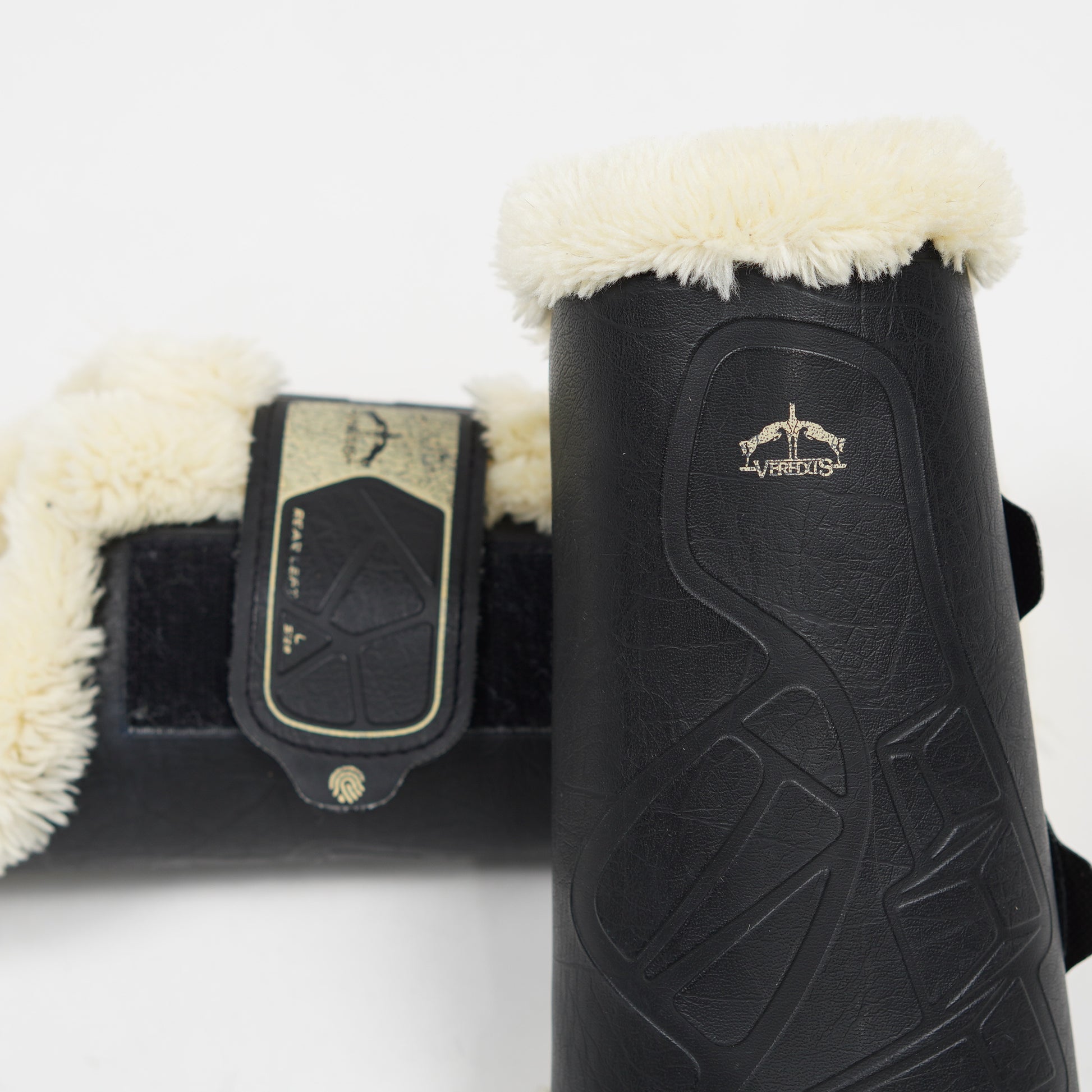 Mjuka dressyrskydd med teddy på insidan och svart syntetläder på utsidan med fasta kardborrespännen från Veredus.