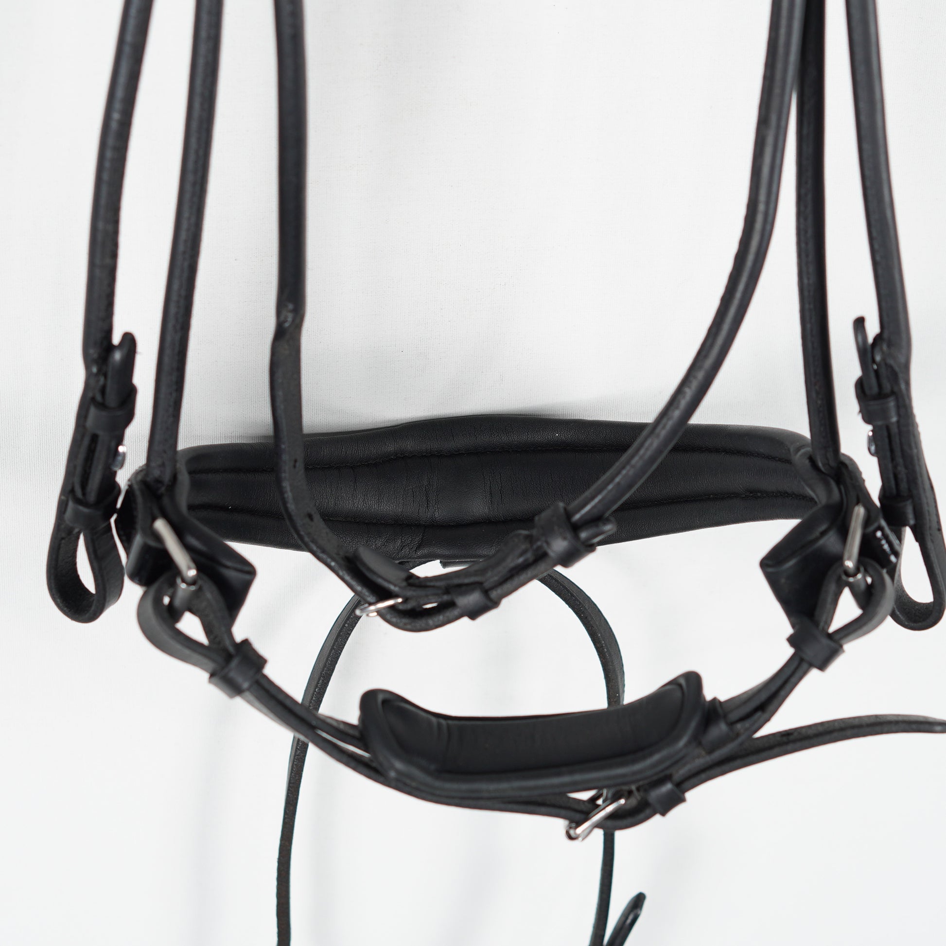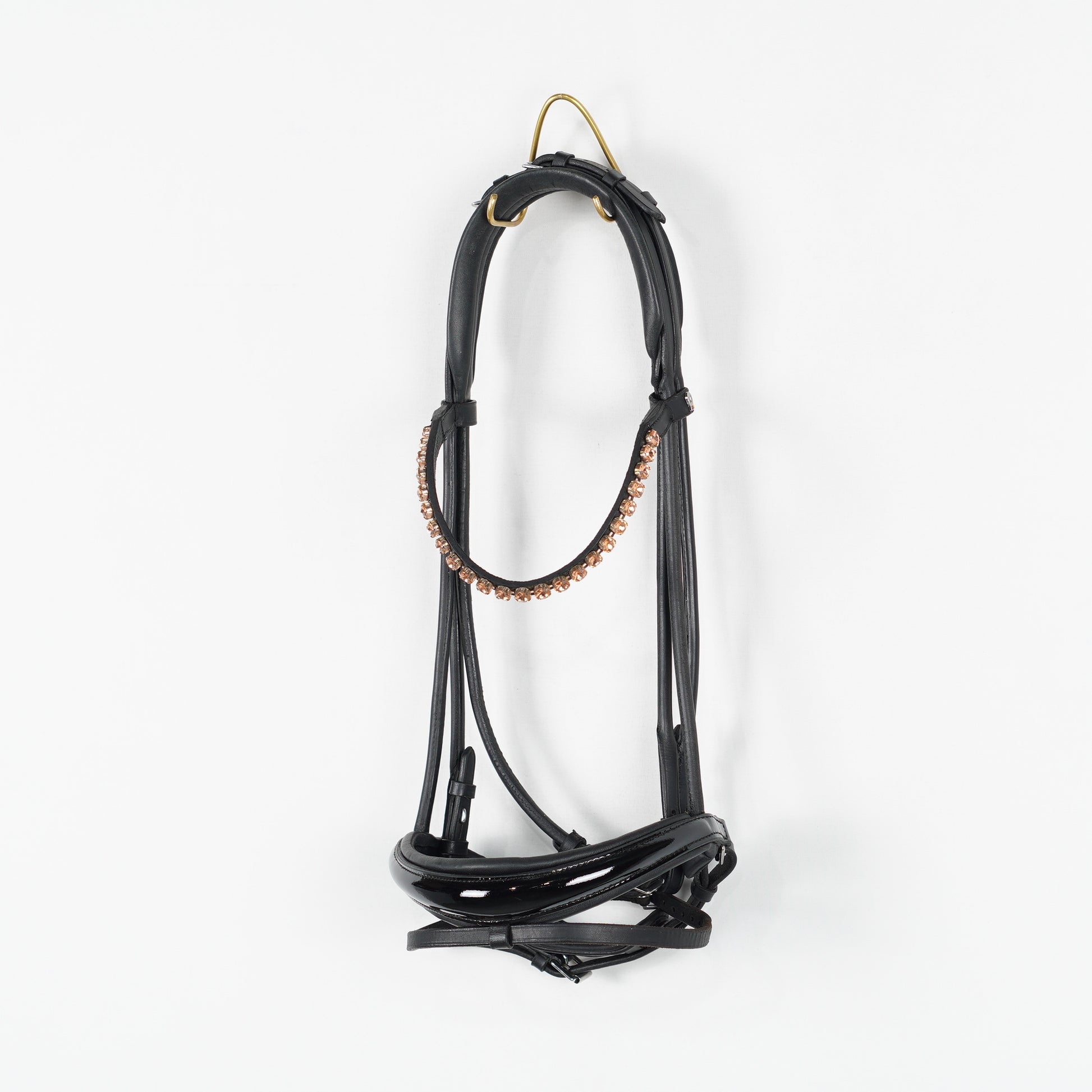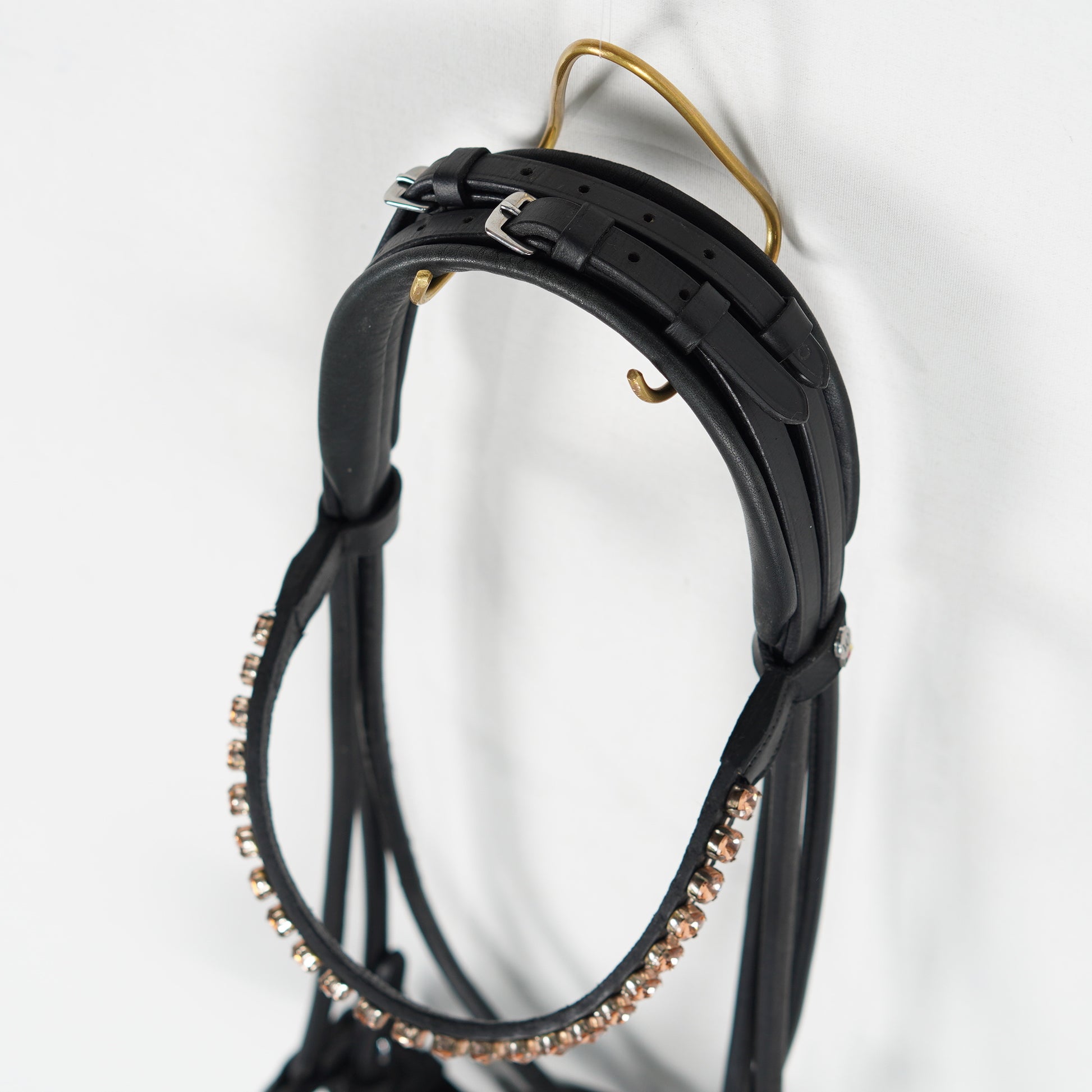 Svart dressyrträns med blank nosgrimma, rundsydda sidostycken och pannband från Waldhausen med stora roséfärgade stenar.