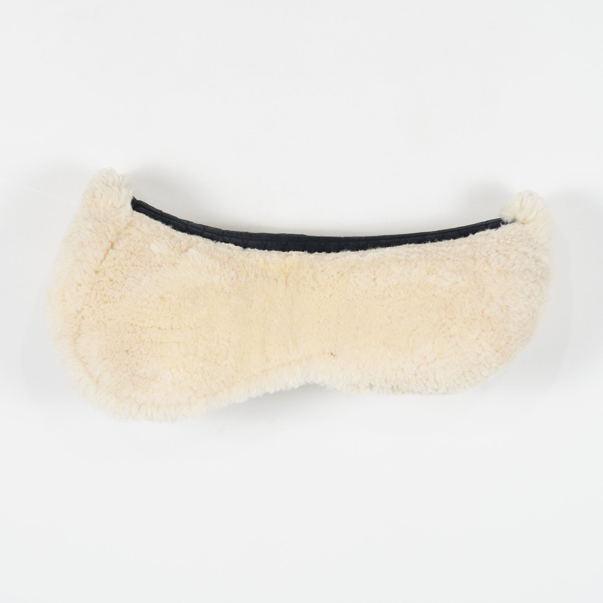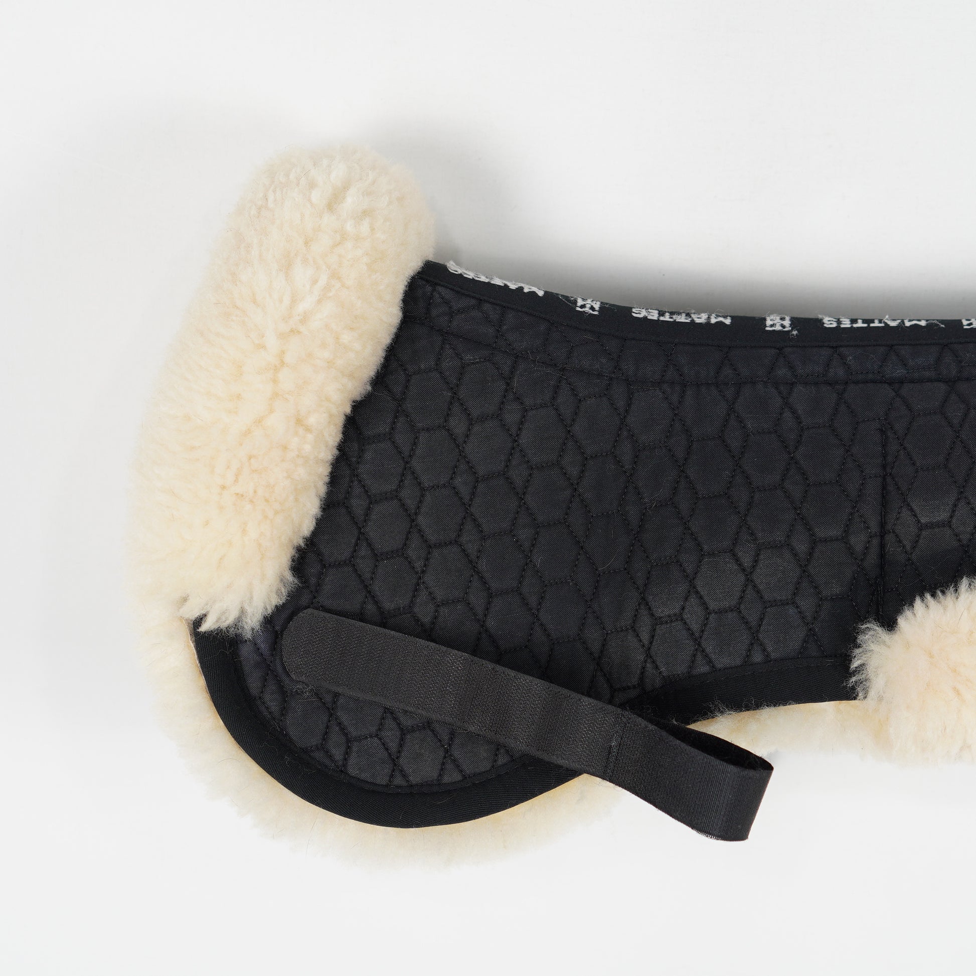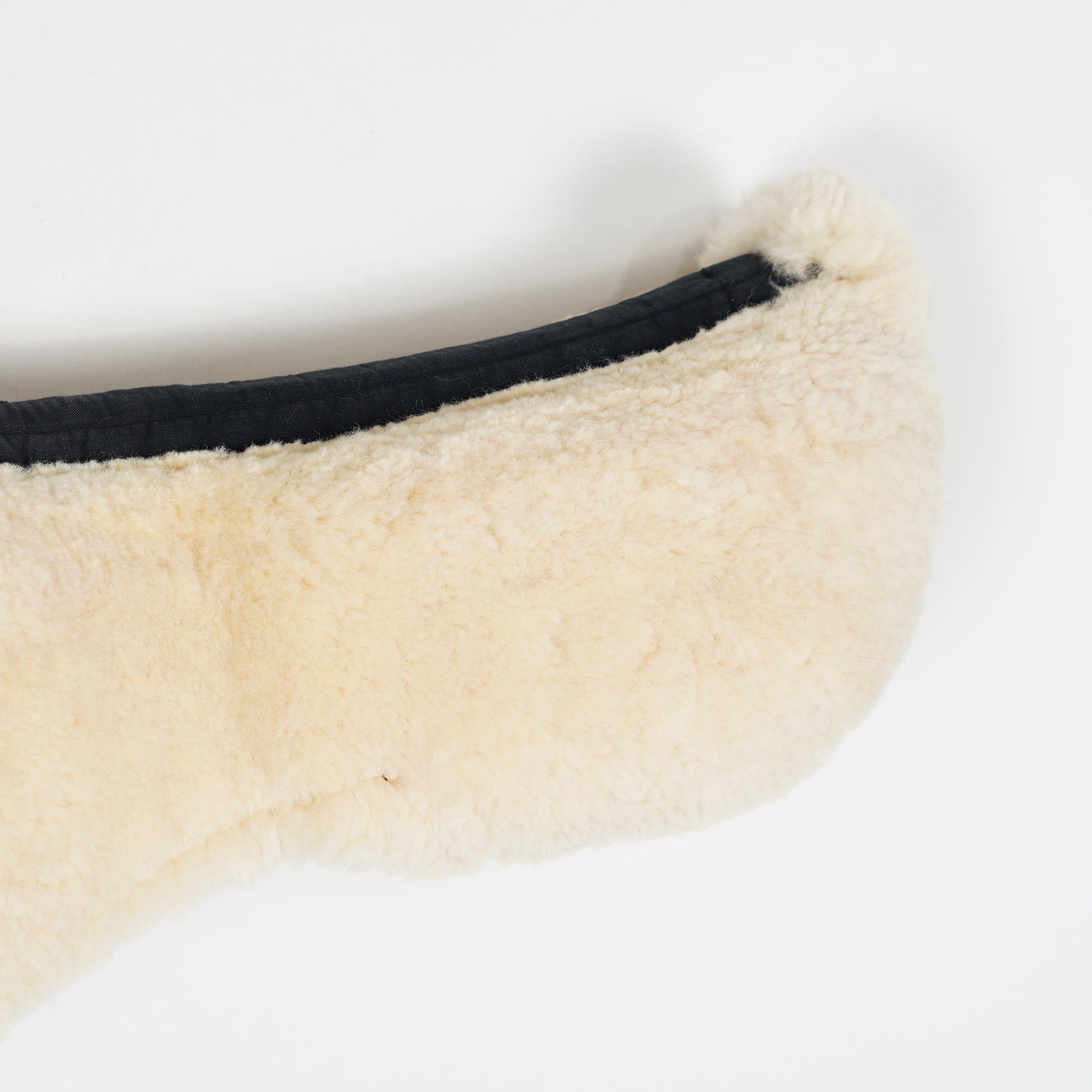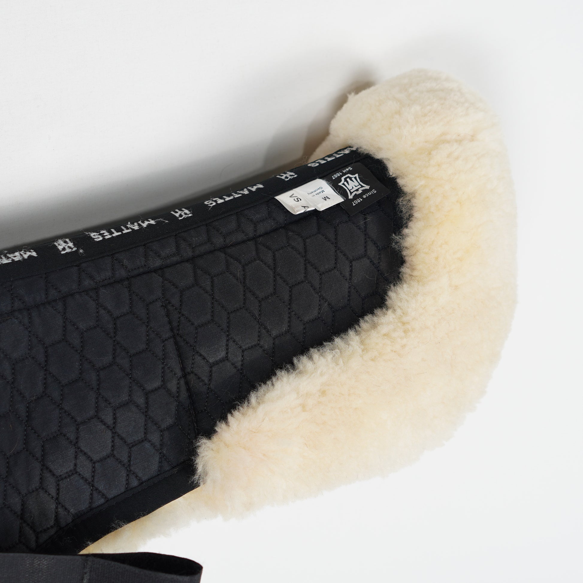 Fårskinnspadd i svart tyg med ljust fårskinn från Mattes. Padden har lite förhöjning bak och stropparna kvar.