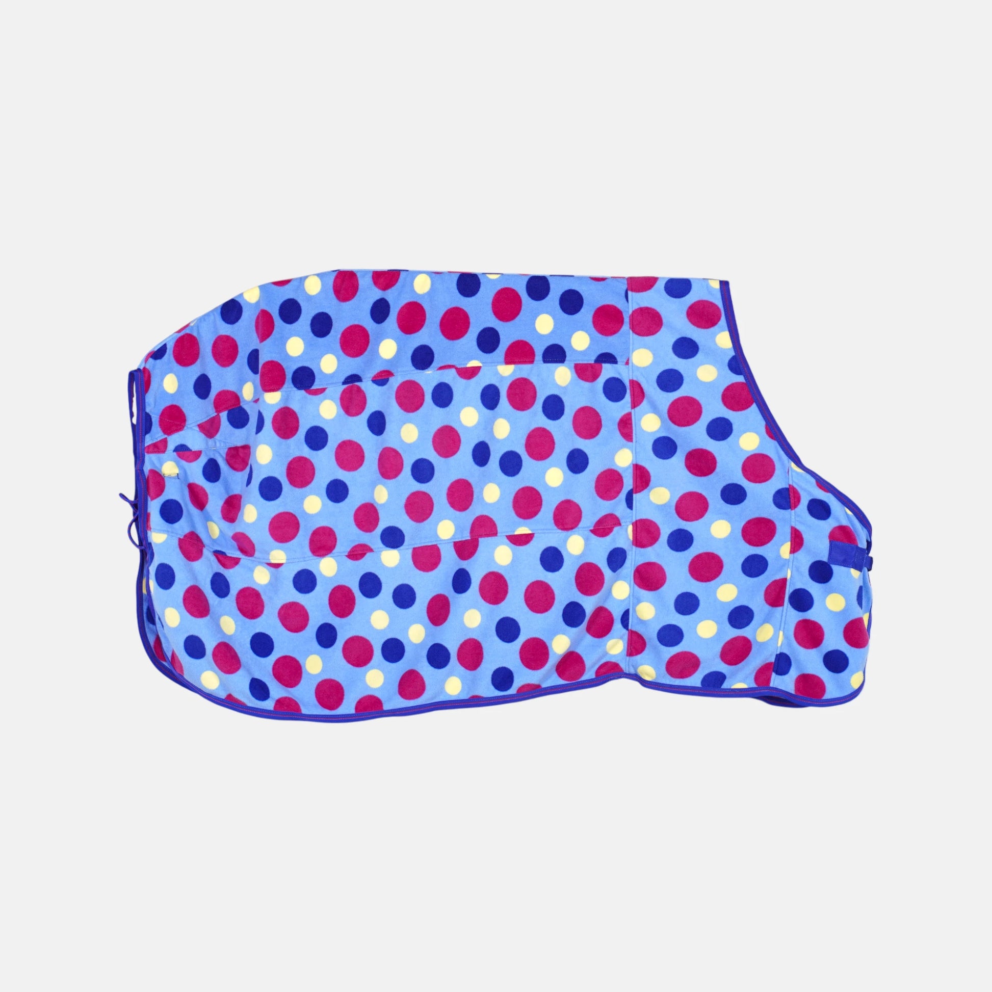 Blått fleecetäcke med prickar i glada färger för den mindre kompisen från WeatherBeeta. Fleecetäcket är i ett mycket bra skick men har ett par hårstrån kvar efter tvätt.