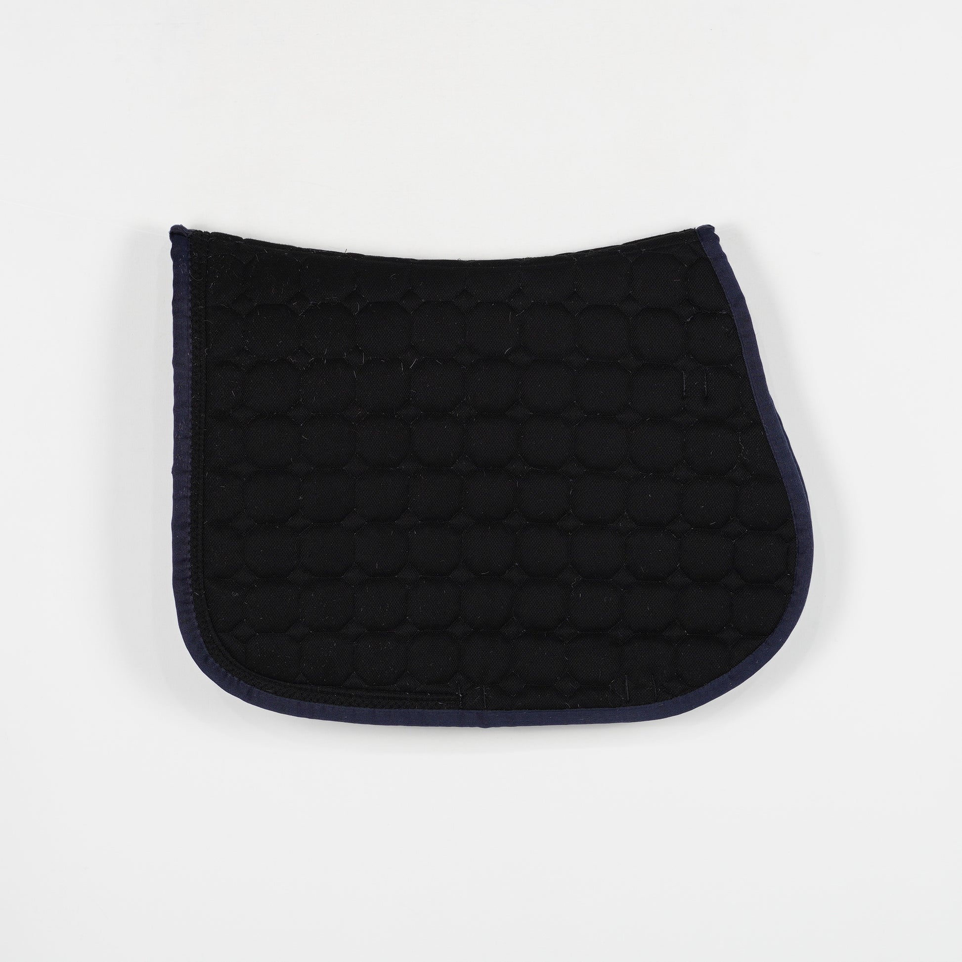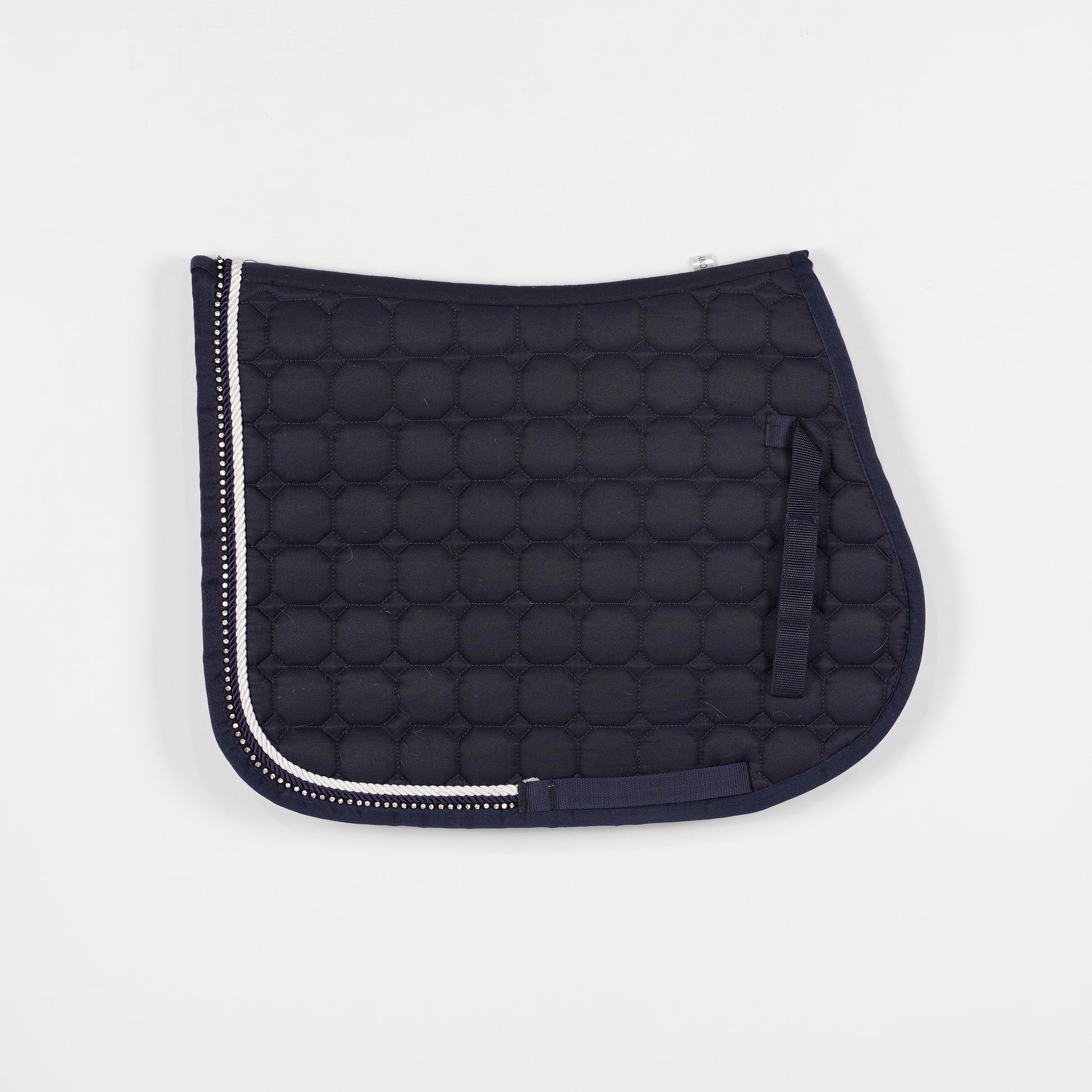 Mörkblått hoppschabrak från okänd tillverkare med bling längs kanten. Schabraket är lite noppigt och det finns en lös söm på quiltningen.
