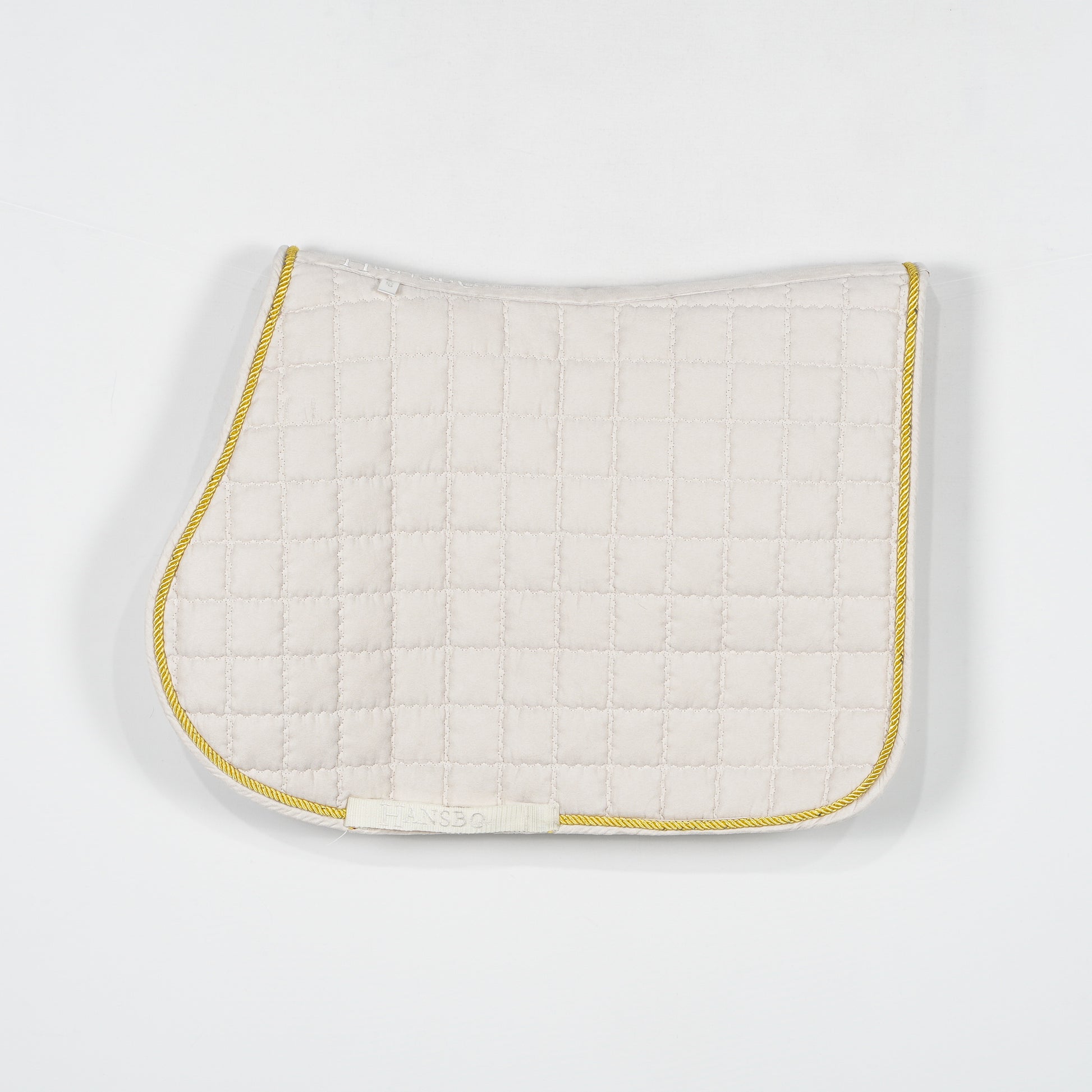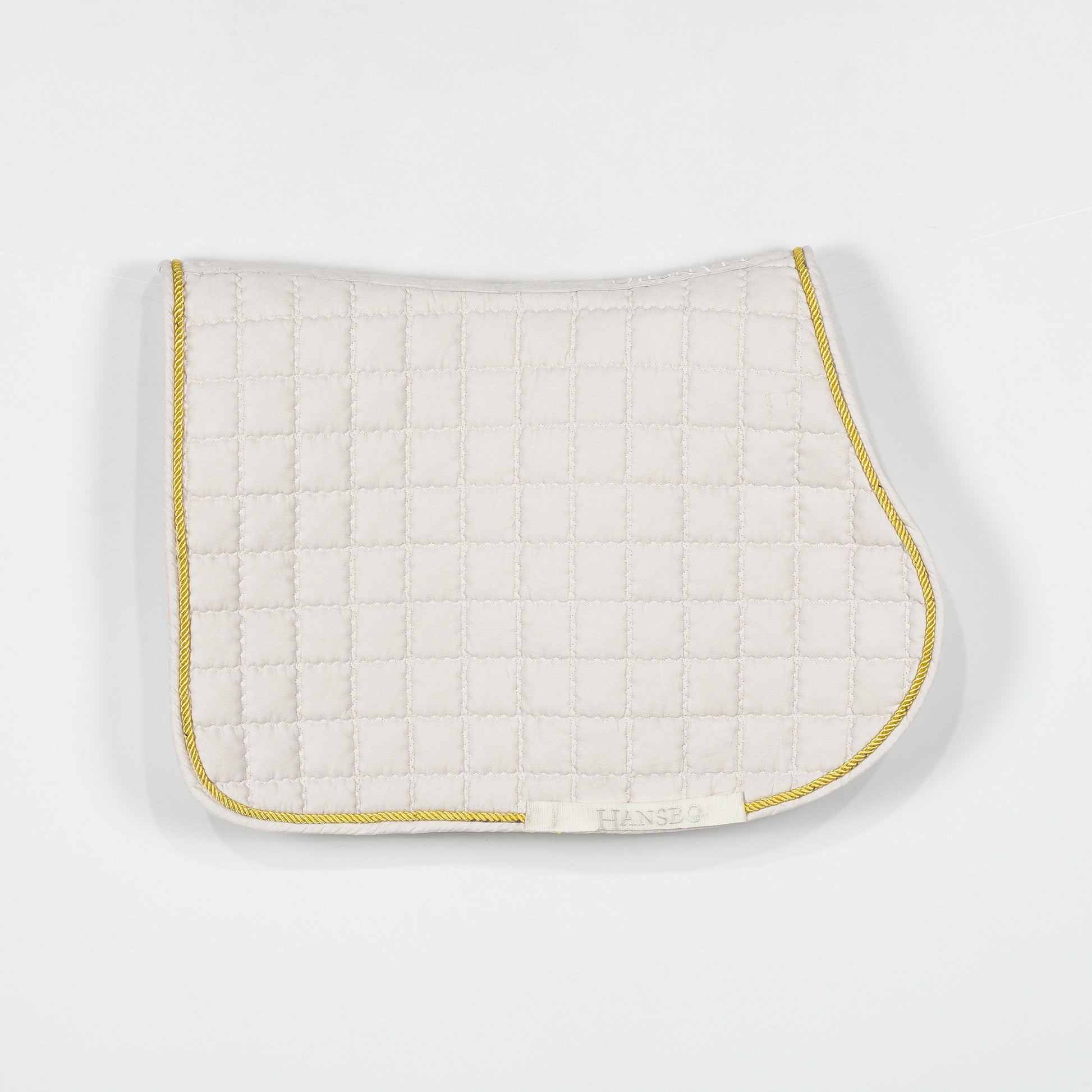 Beige hoppschabrak i syntetmocka med gul passpoal från Hansbo Sport.