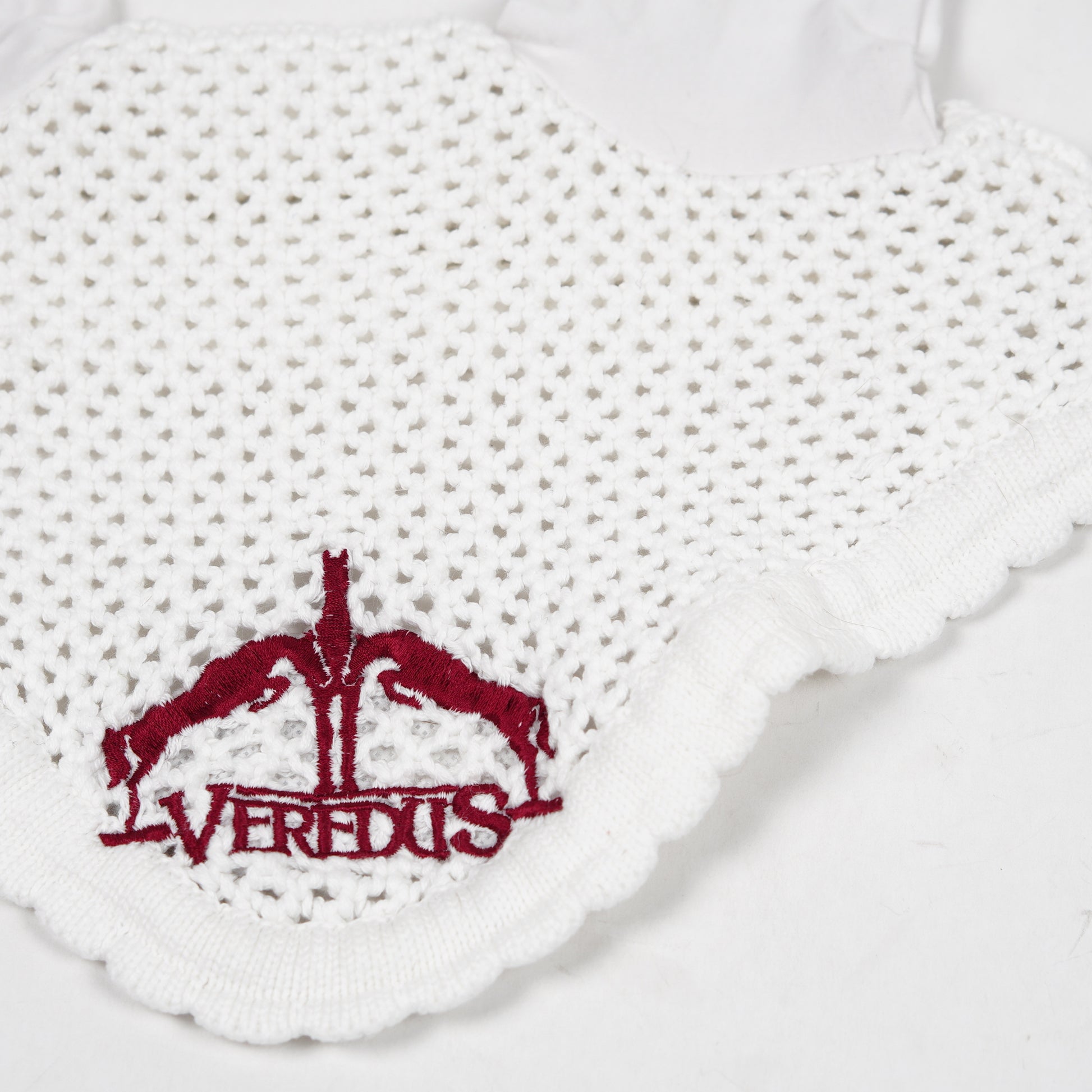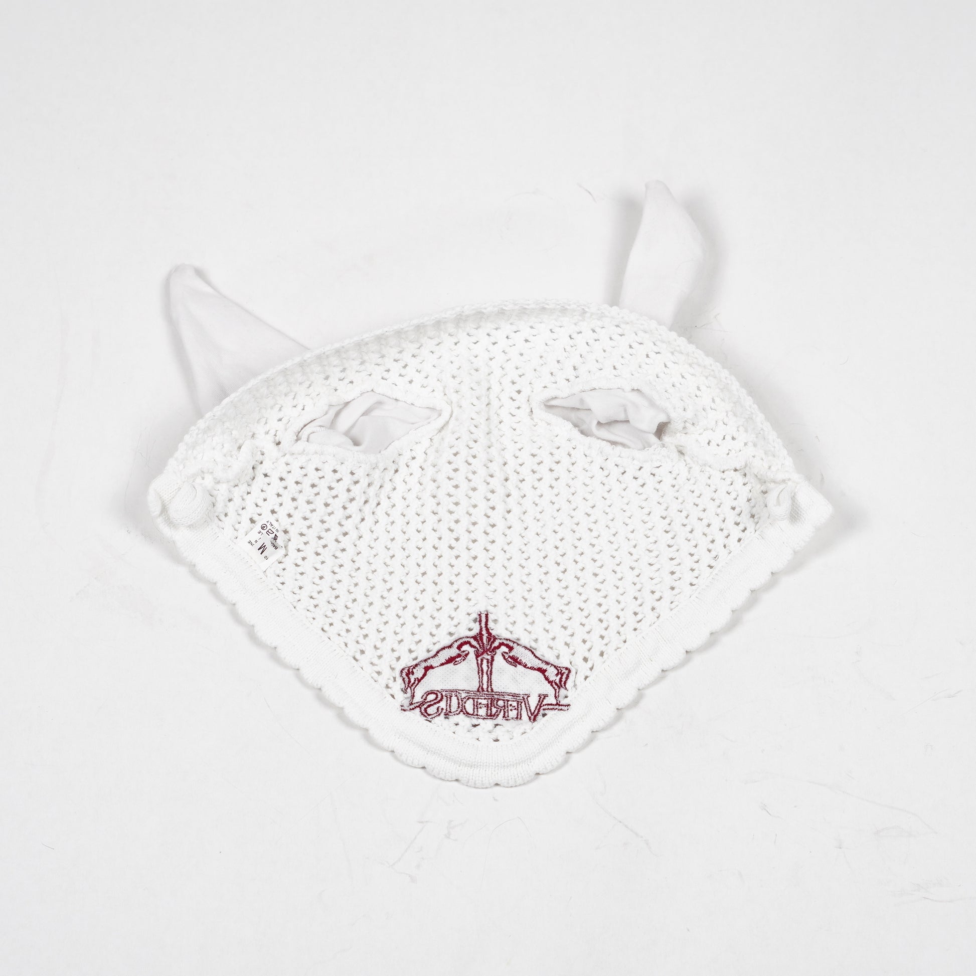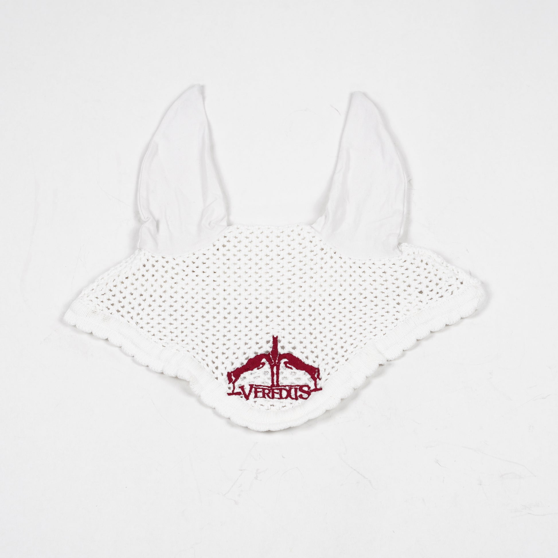 Vit huva med tunna öron från Veredus med vinröd logga i mitten.