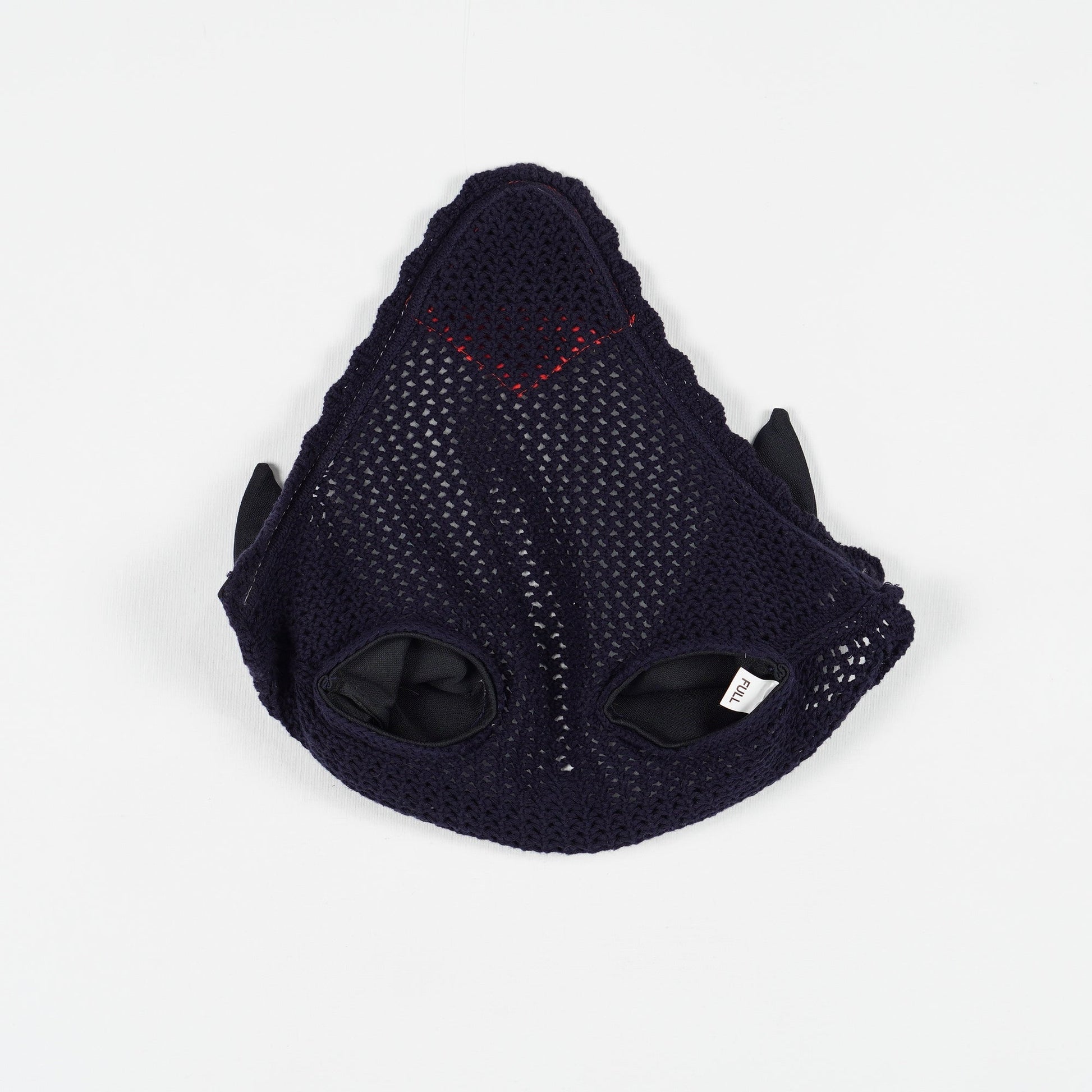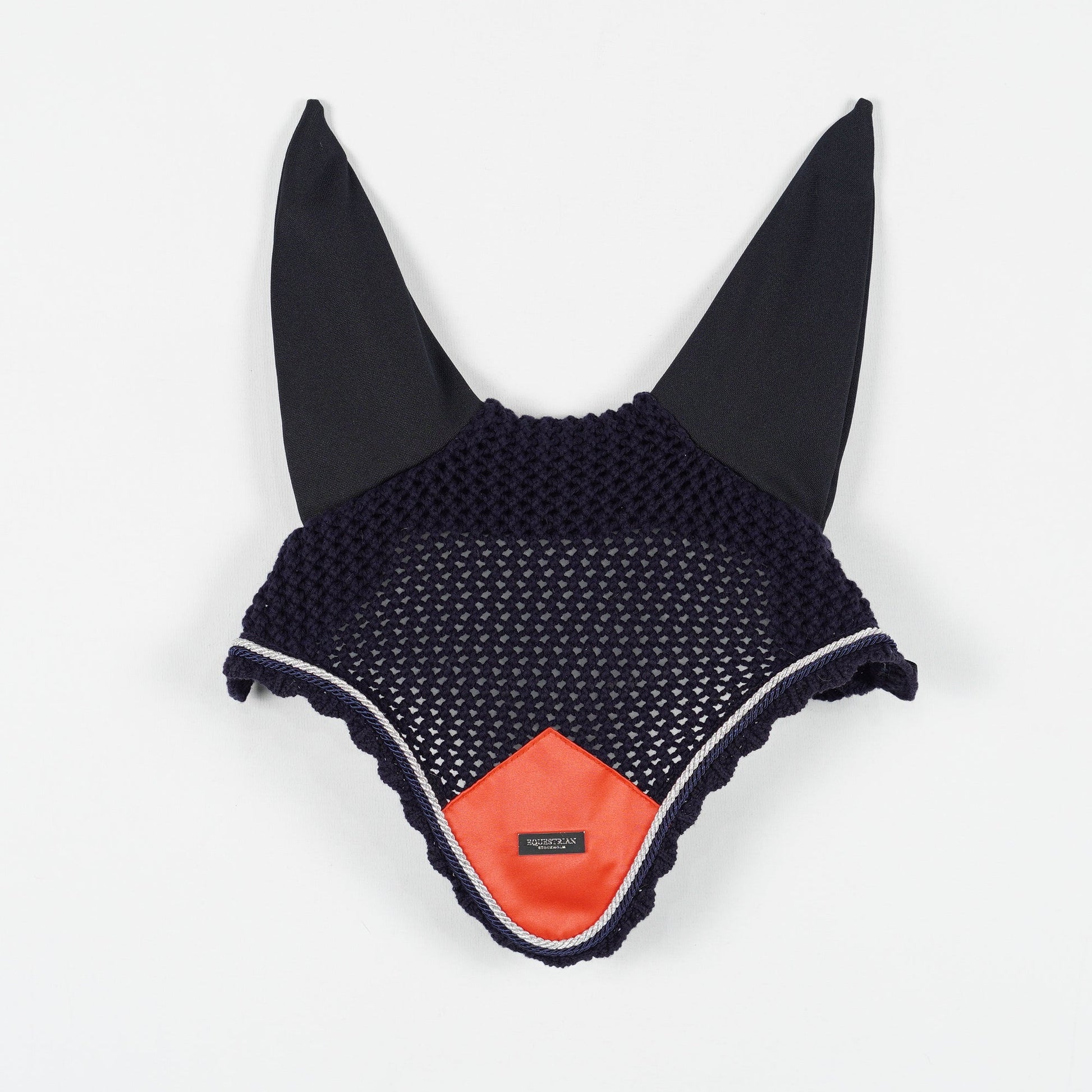 Mörkblå huva med en neon-röd spets och dubbel passpoal från Equestrian Stockholm. Huvan är i ett sparsamt använt skick.