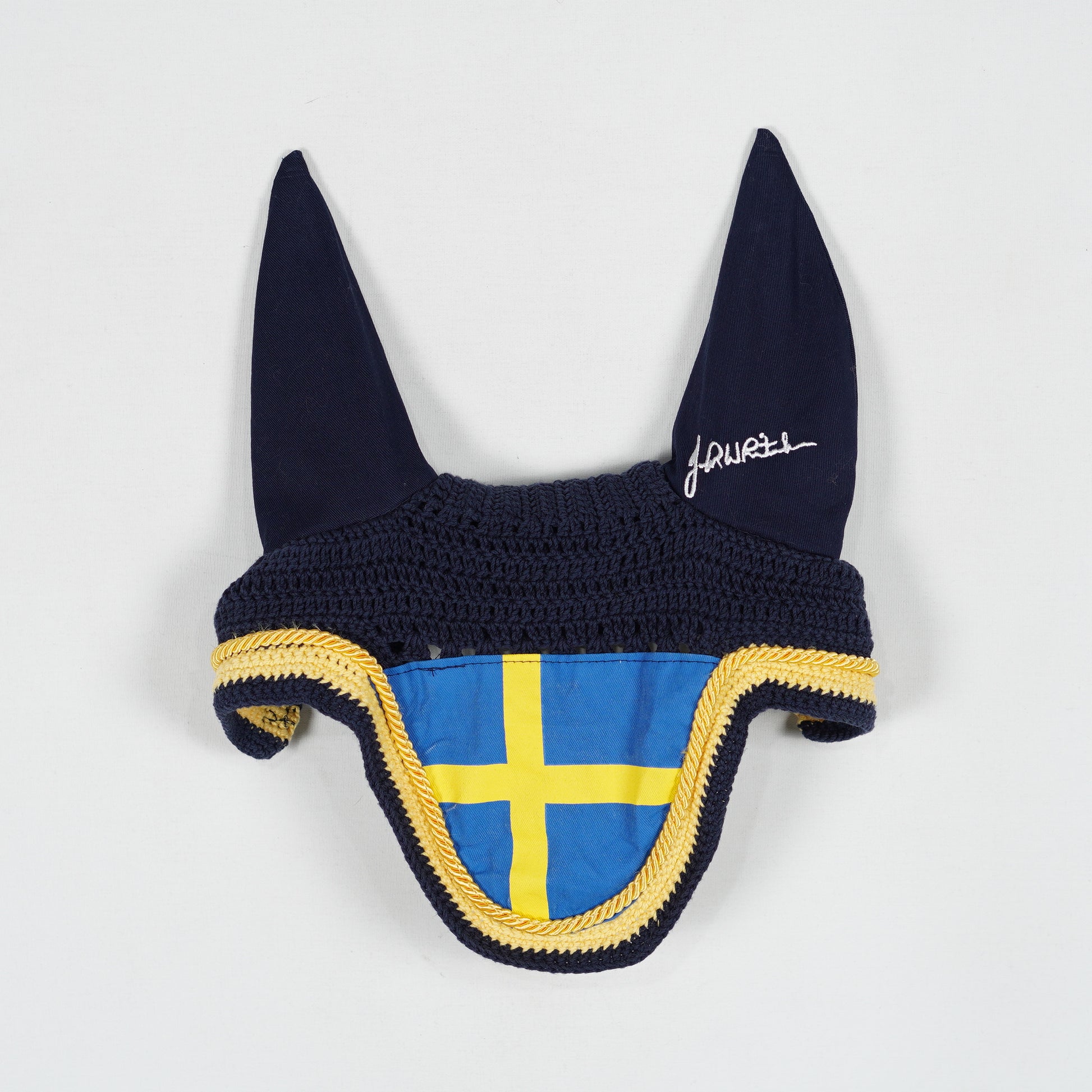 Blå huva med gula detaljer, tunna öron och sverigeflagga i mitten från John Whitaker.