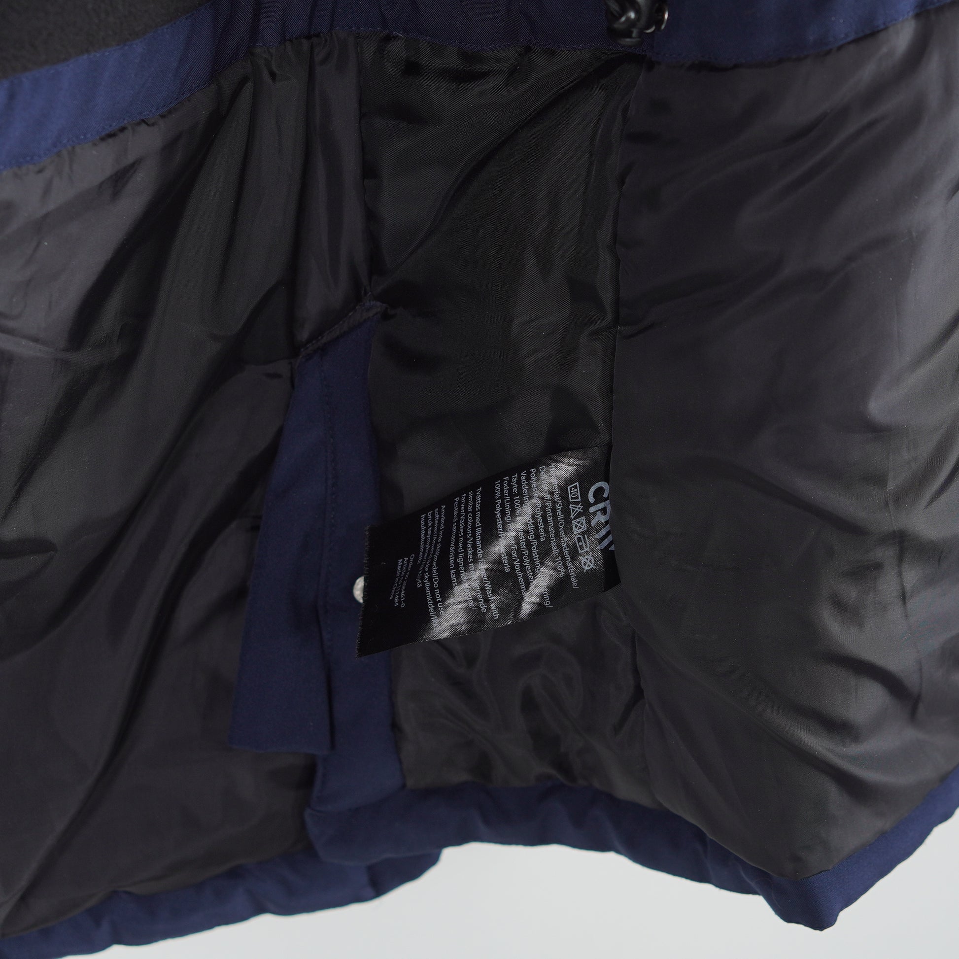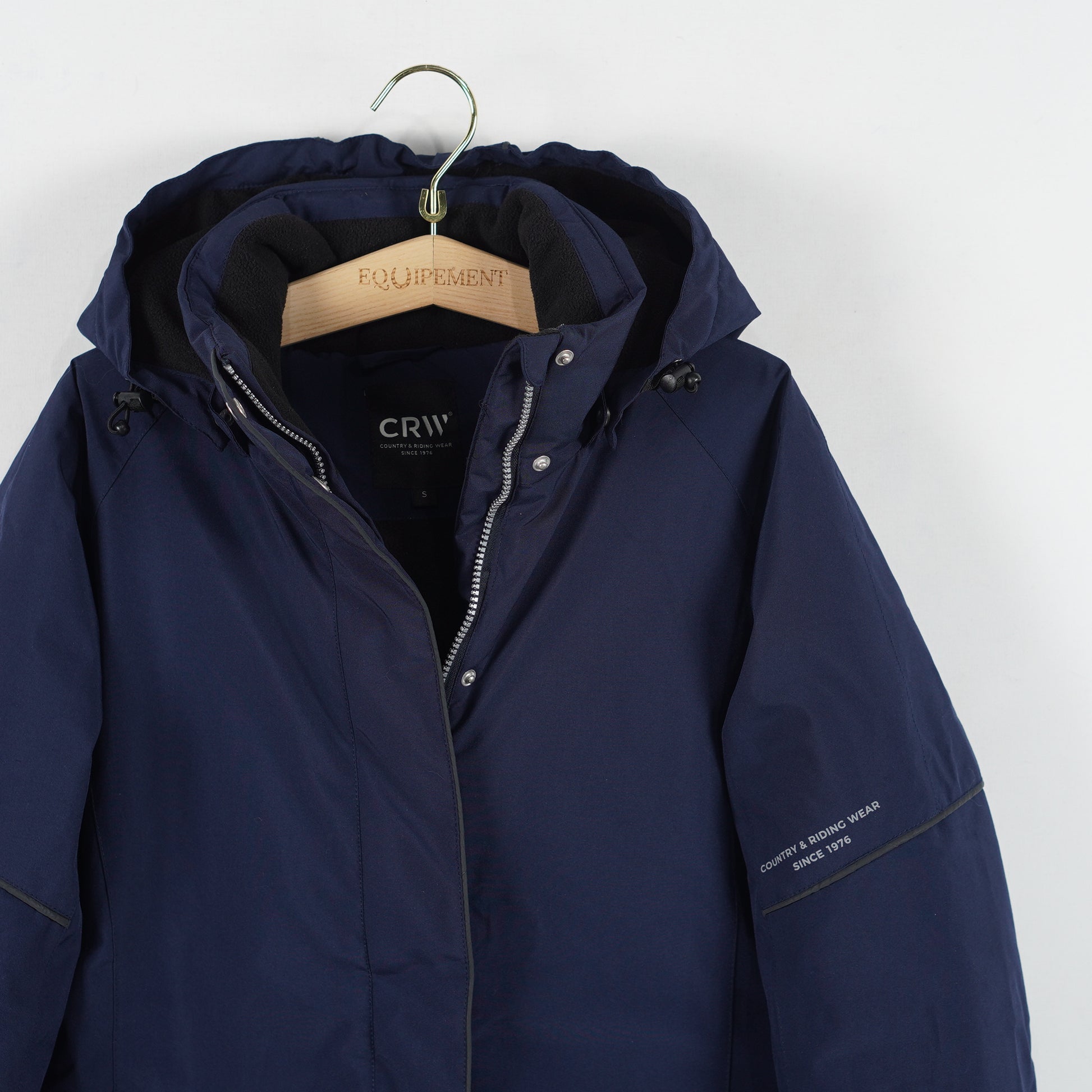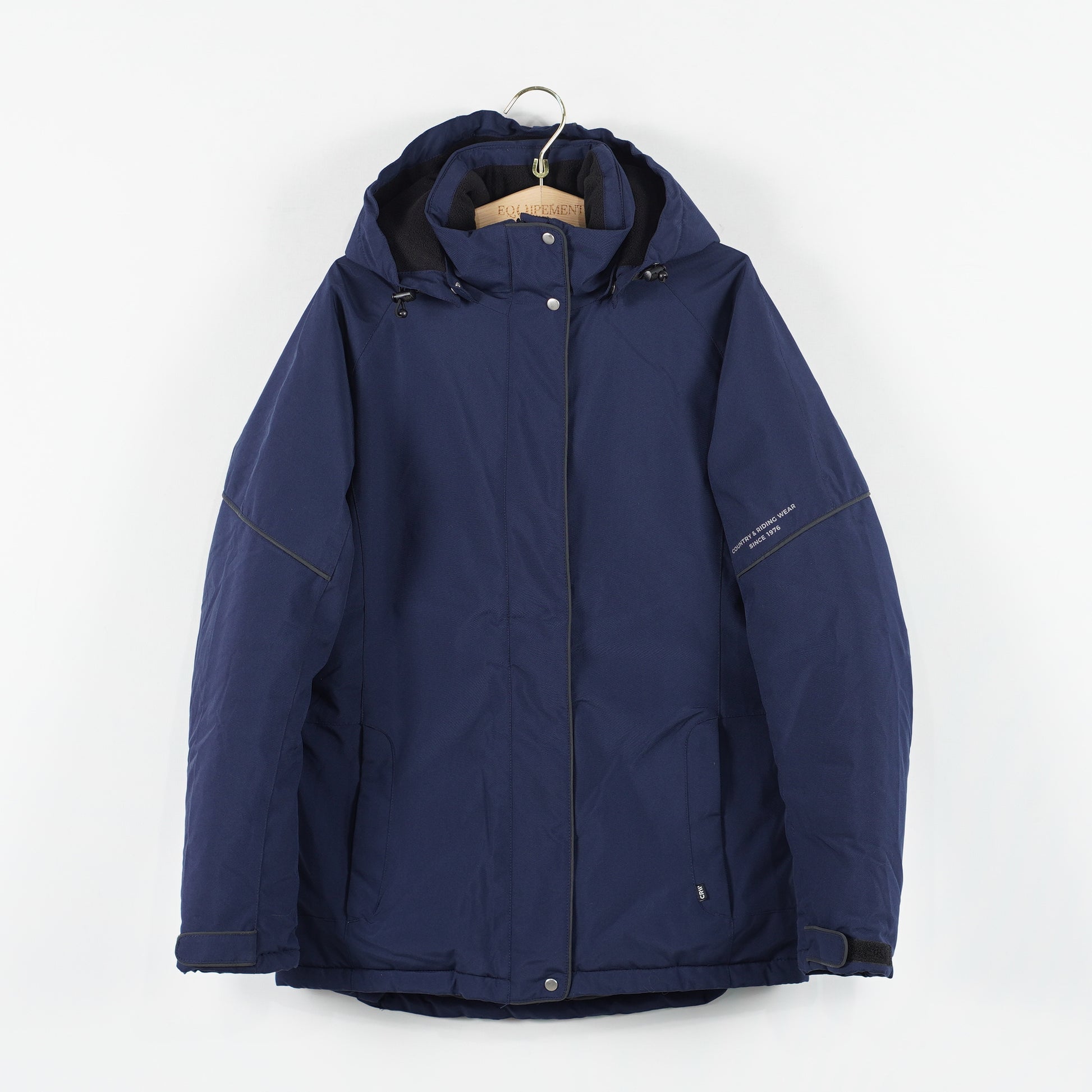 Marinblå fodrad jacka med avtagbar luva, flera dragkedjefickor och en insida i mysig borstad fleece från CRW.