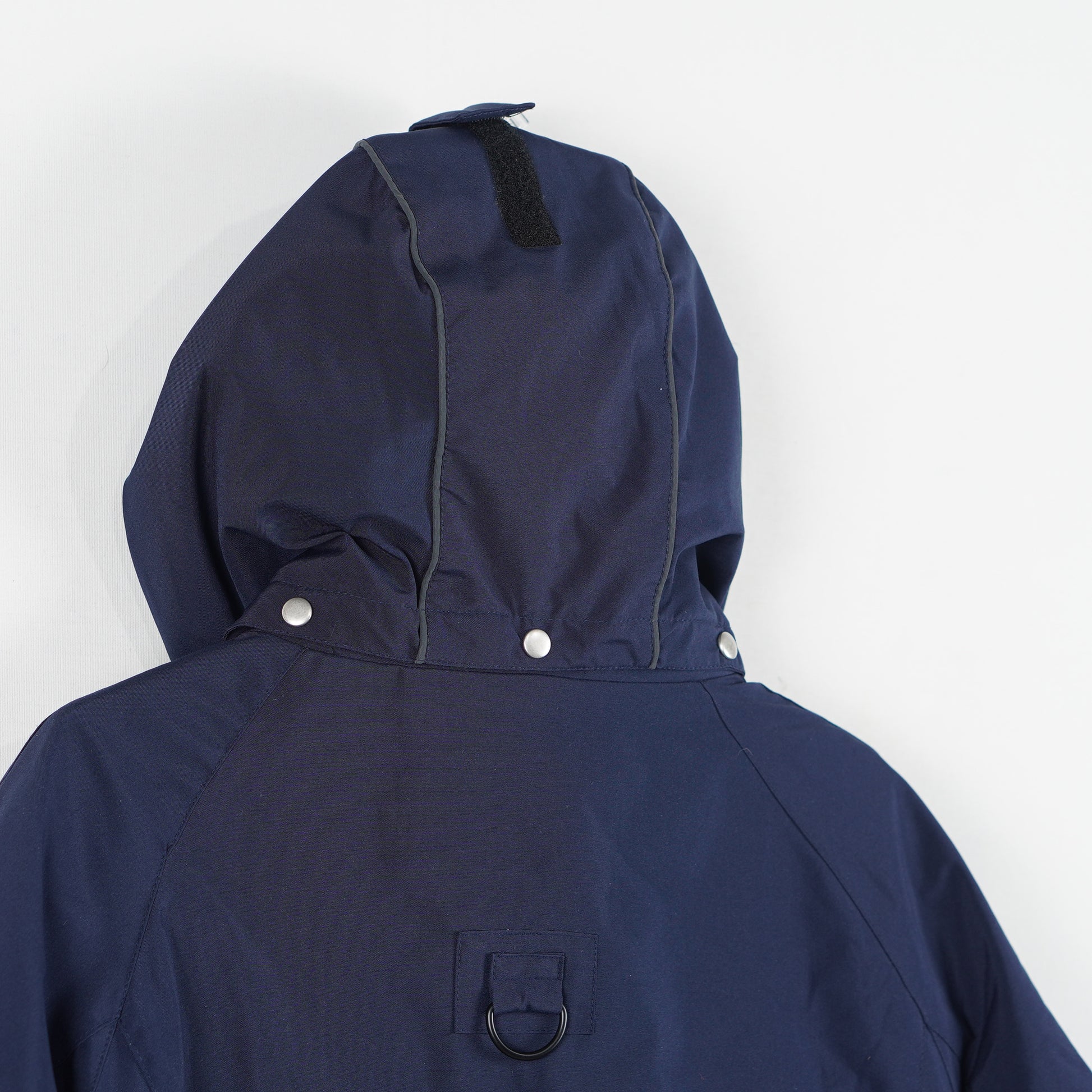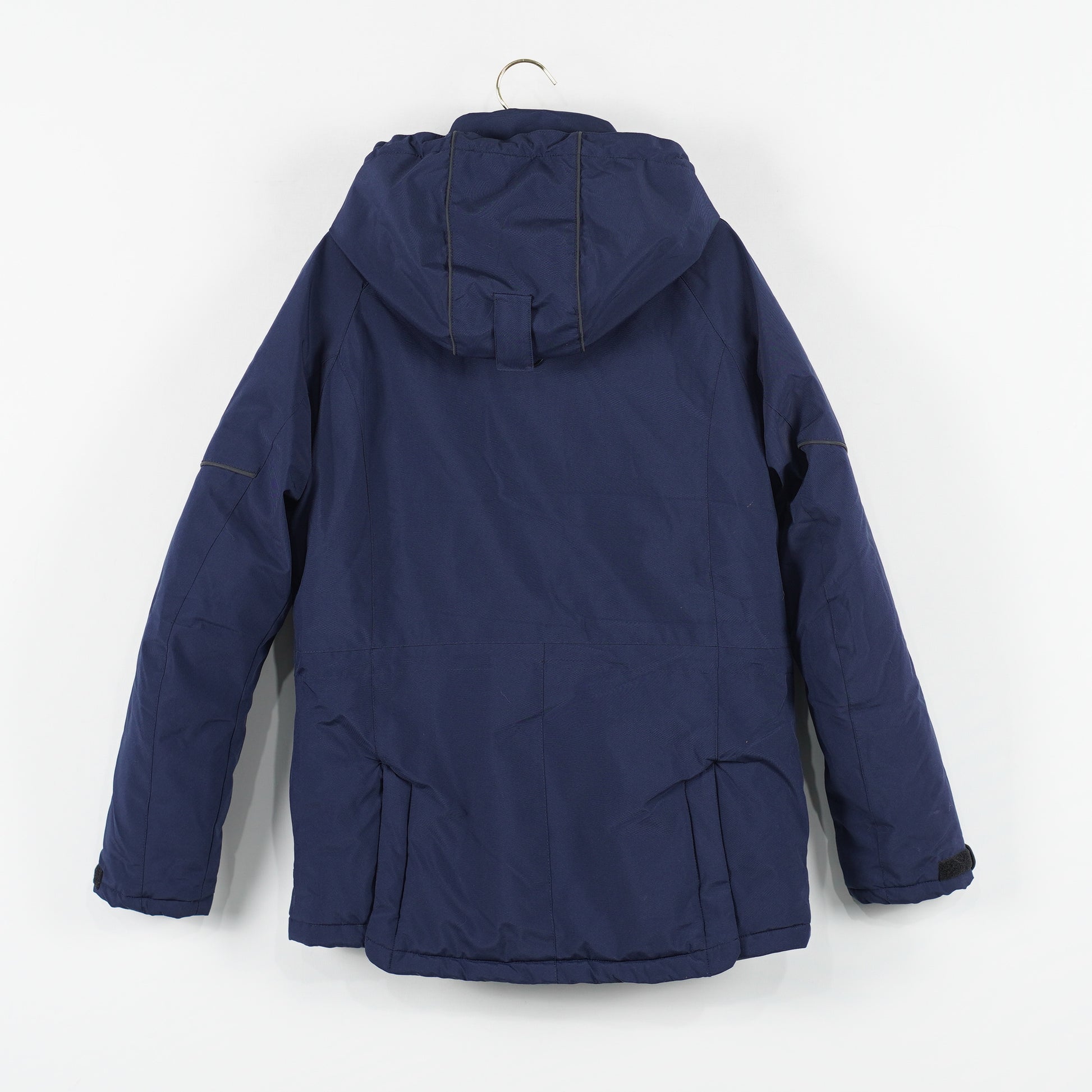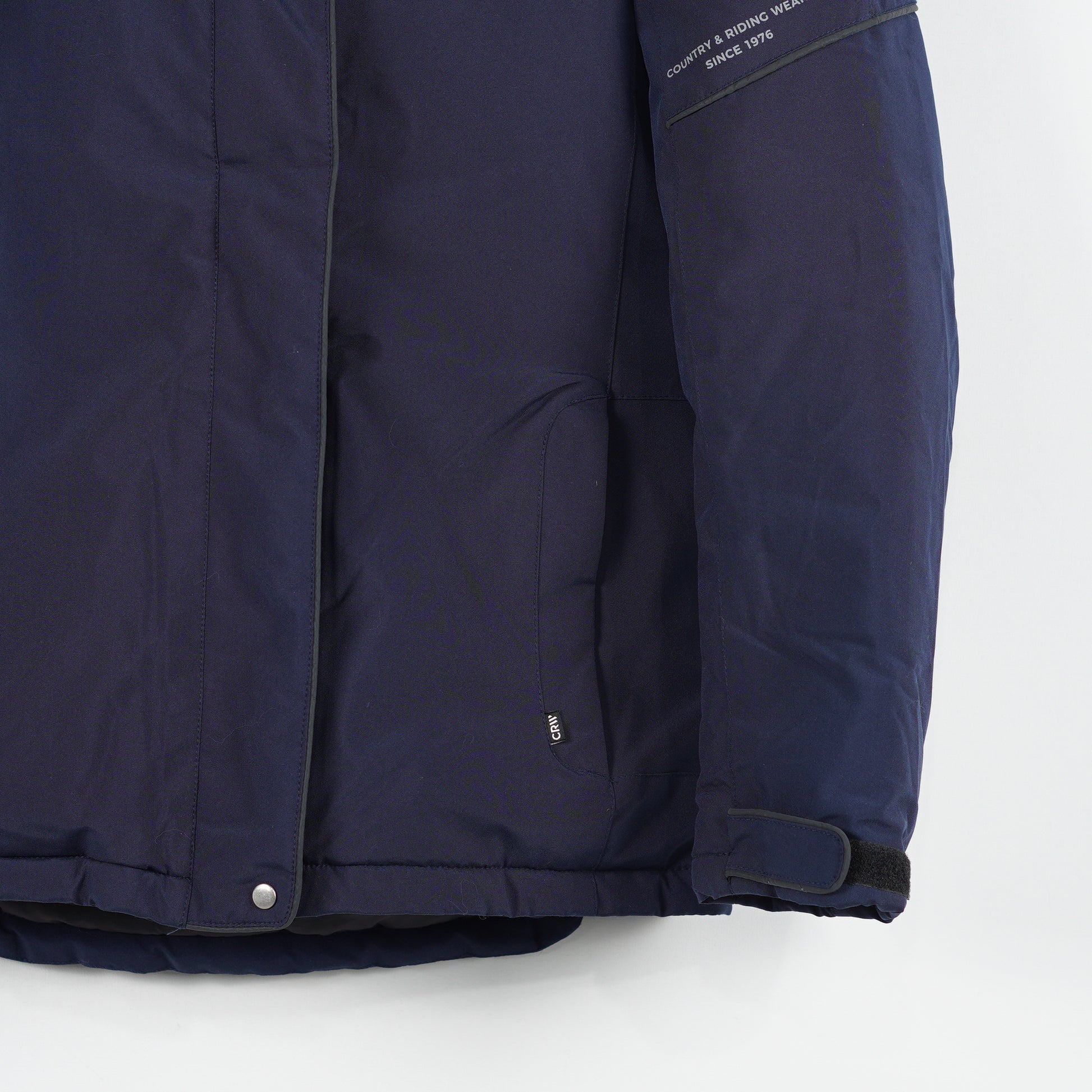 Marinblå fodrad jacka med avtagbar luva, flera dragkedjefickor och en insida i mysig borstad fleece från CRW.