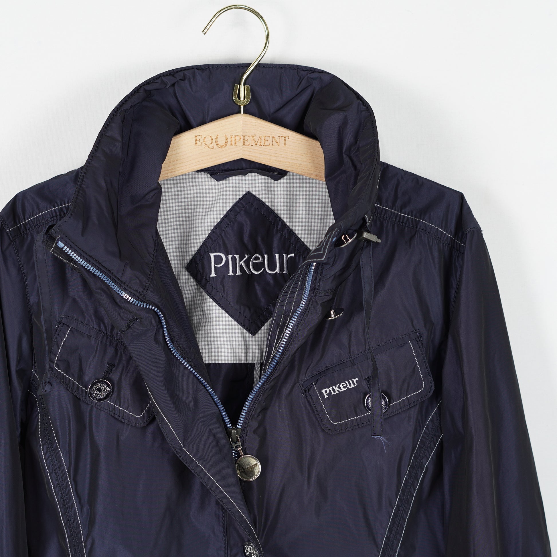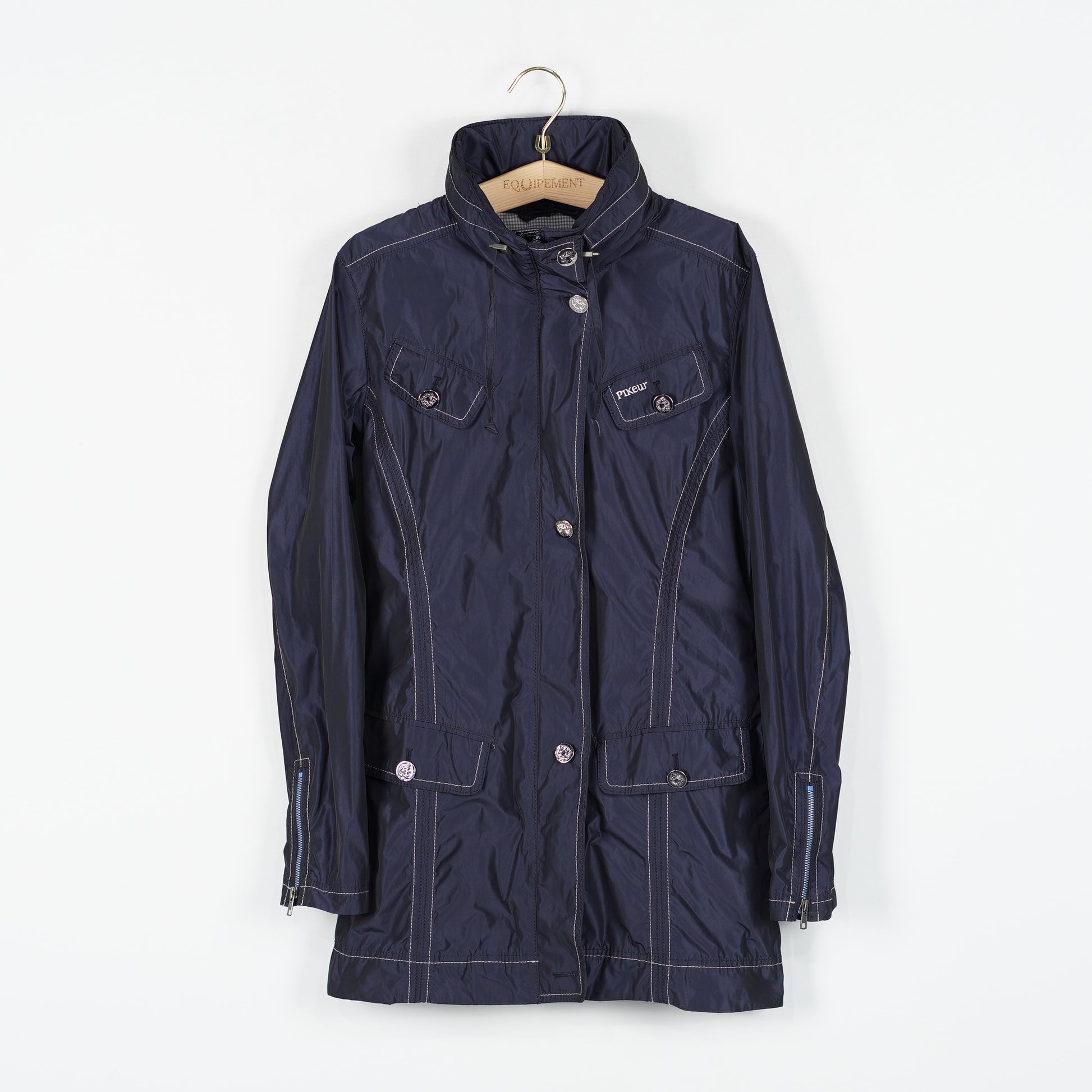 Ofodrad jacka i blått, "Latessa" från Pikeur. Jackan är en något längre modell och har många fickor samt ett band bak på ryggen som går att spänna åt för att få mer form på jackan. Några knappar sitter lite löst.