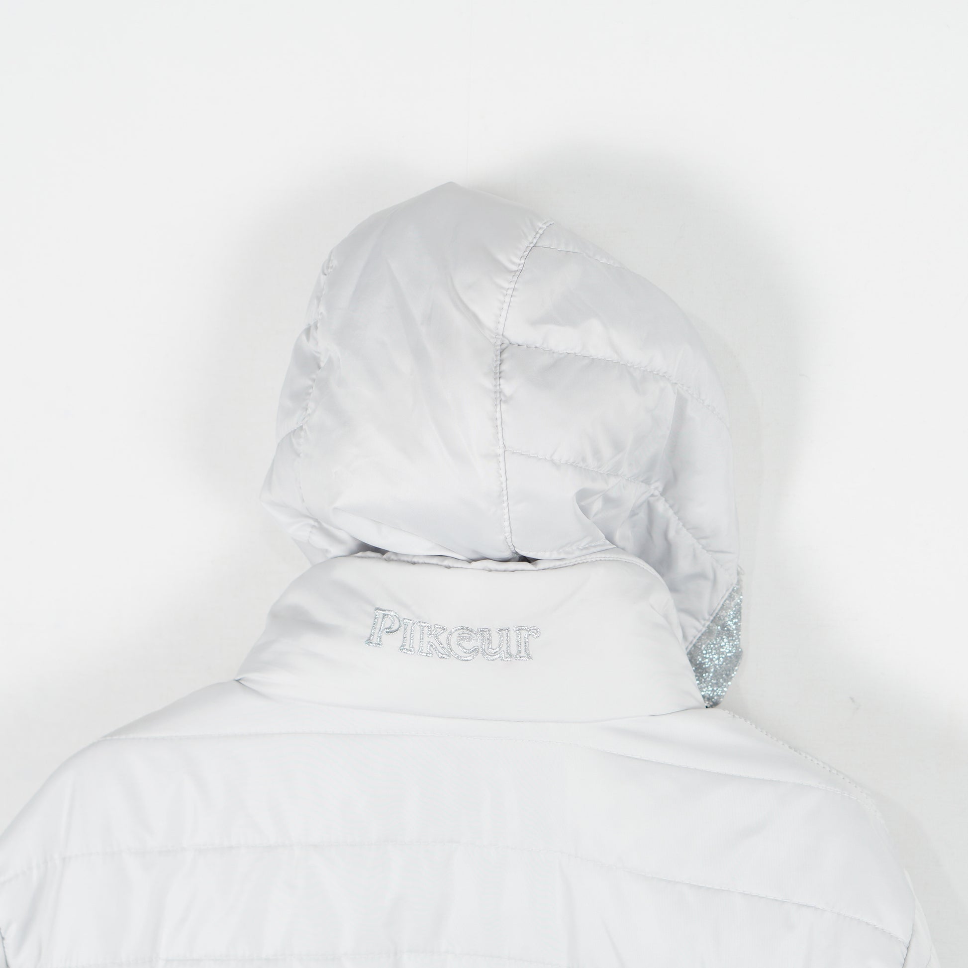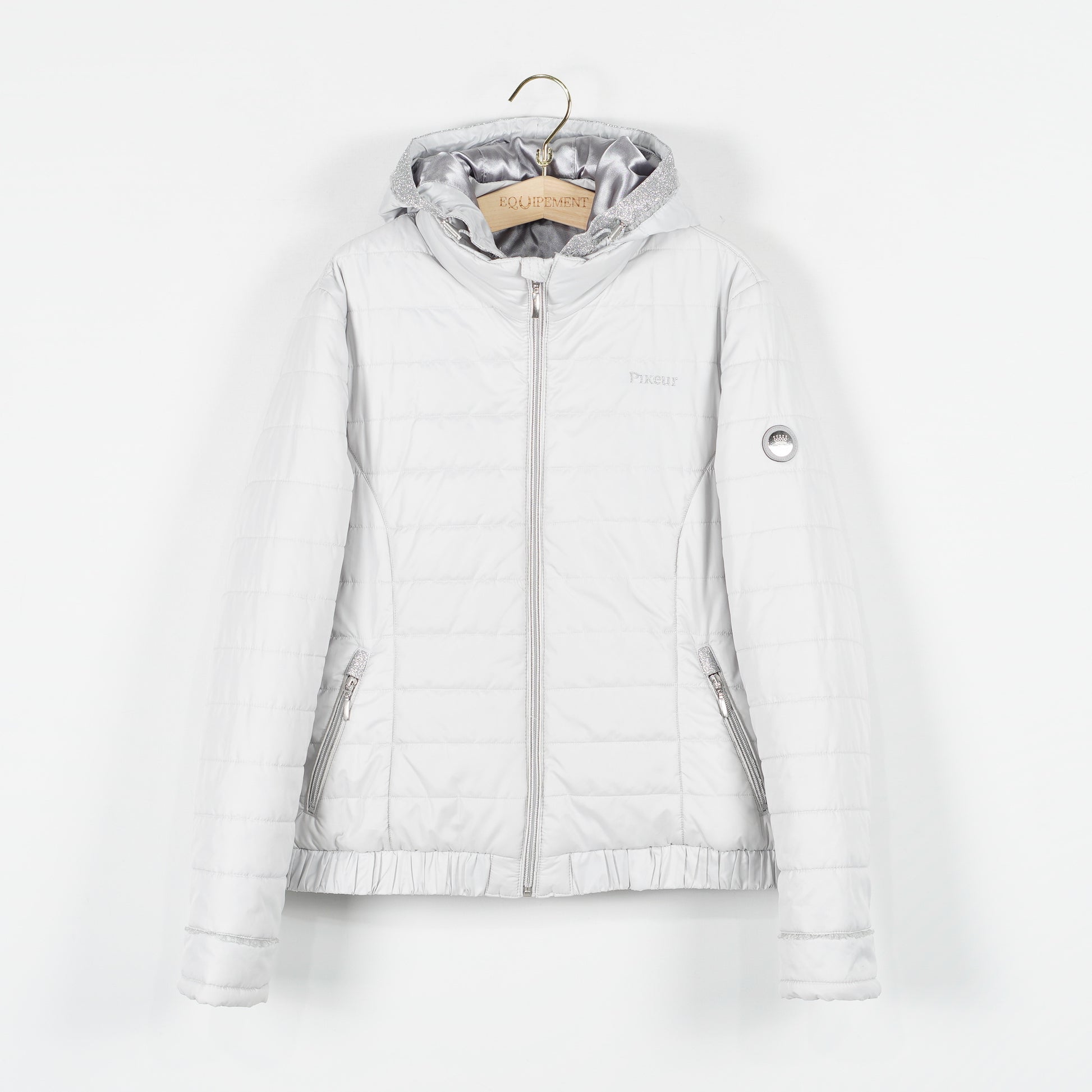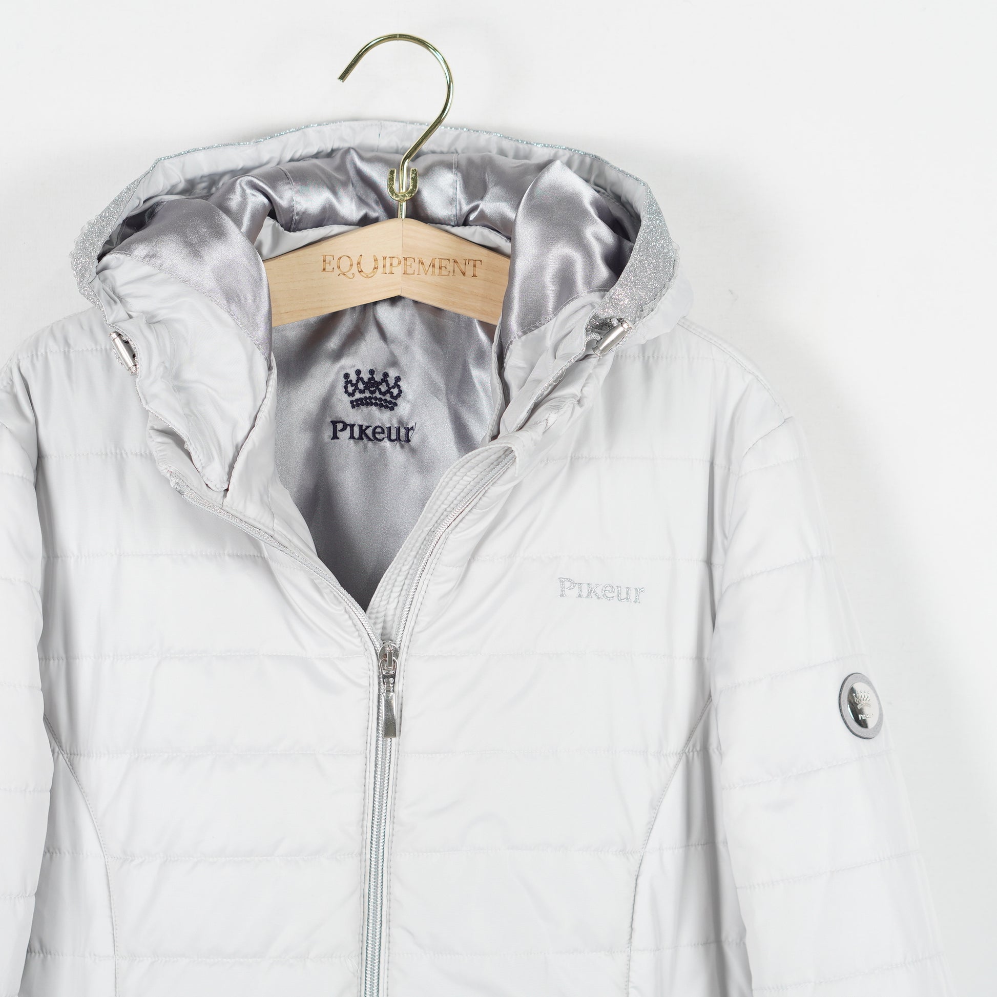 Supersnygg jacka "Unabell" från Pikeur. Jackan är i en ljusgrå/silverfärg med glittriga detaljer och har en avtagbar luva.