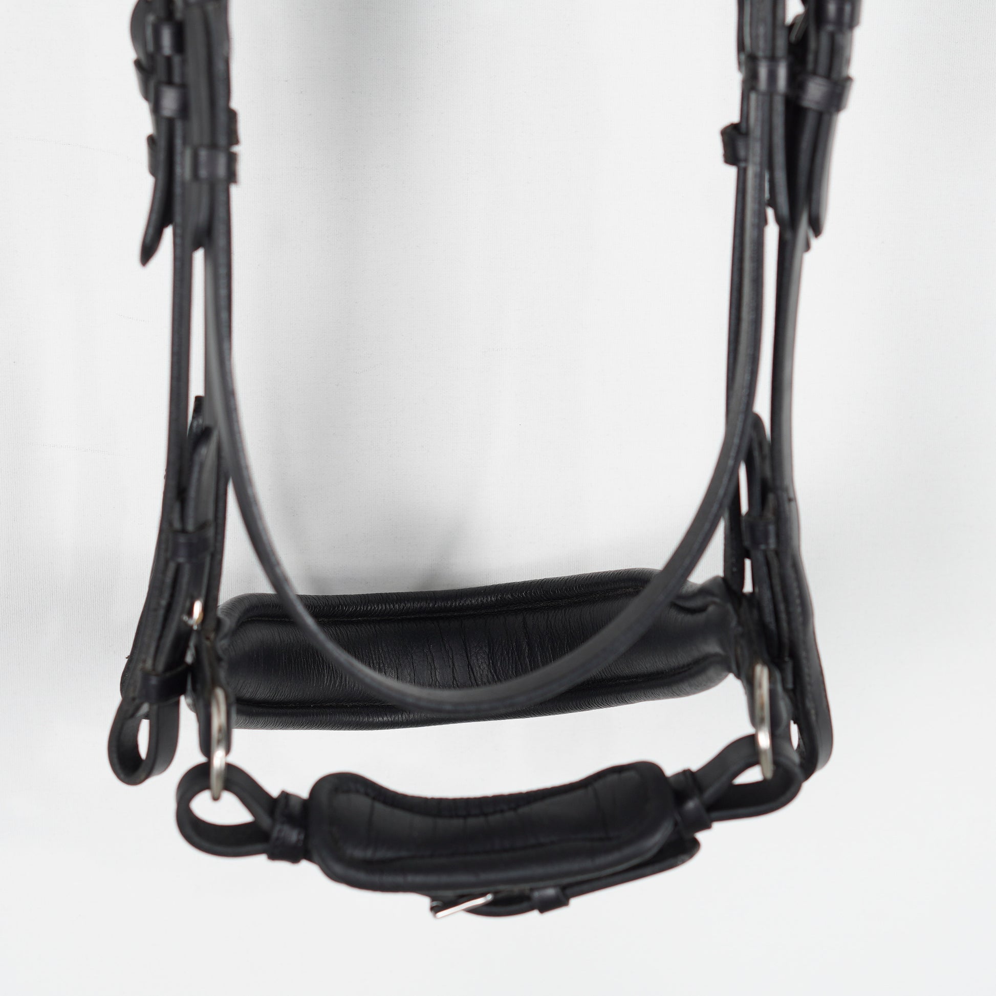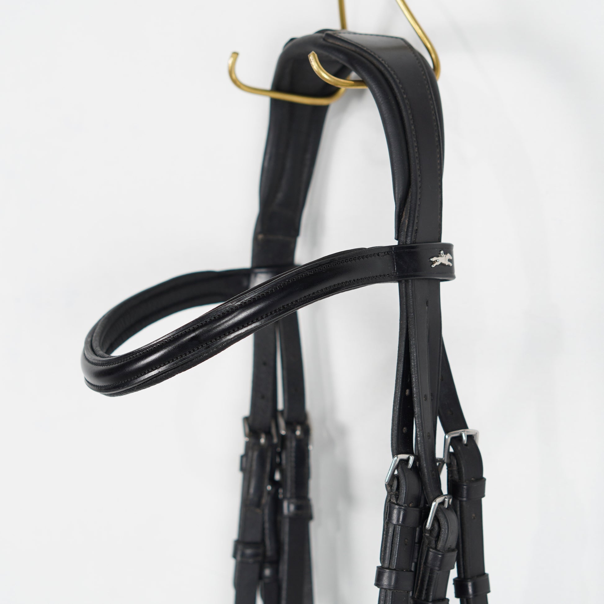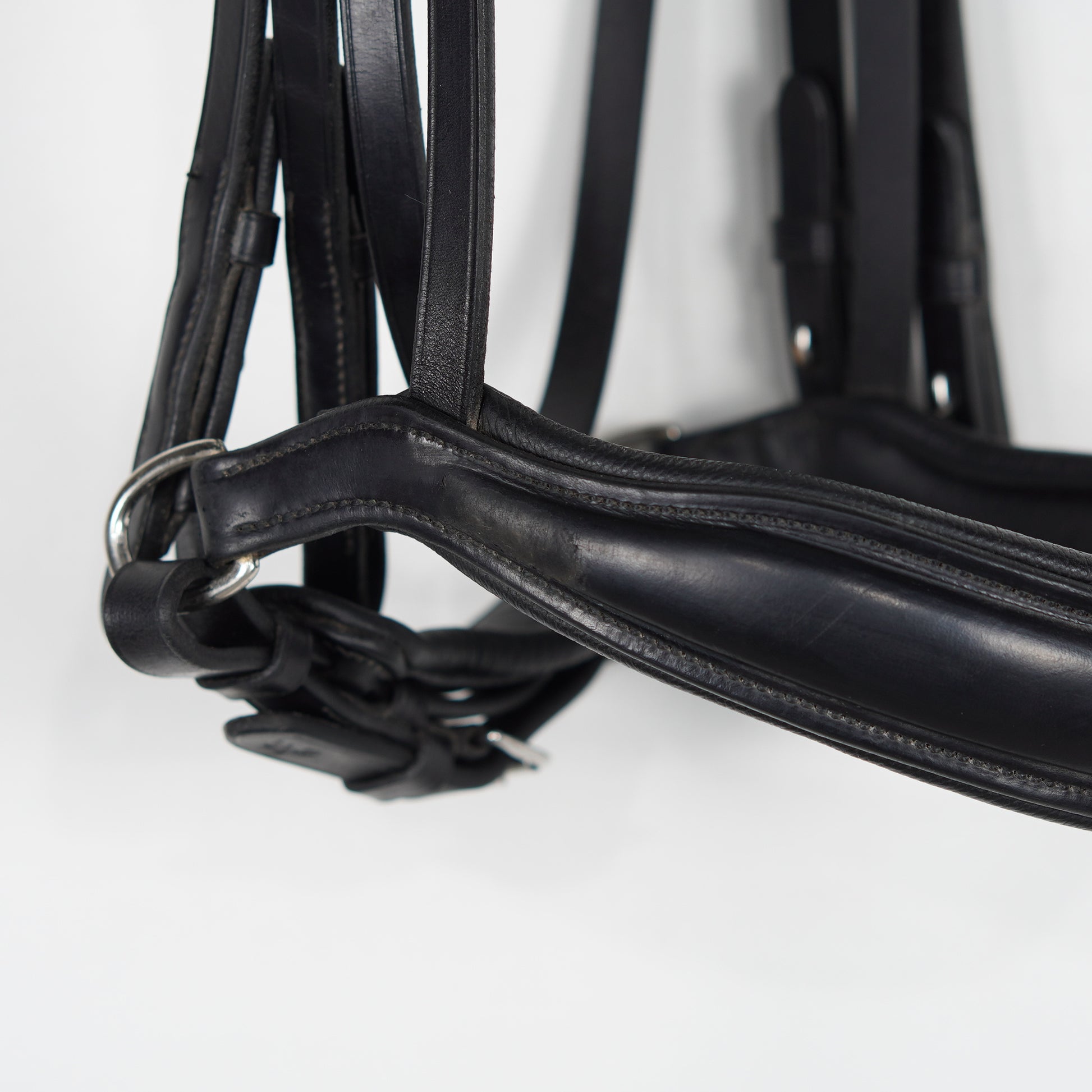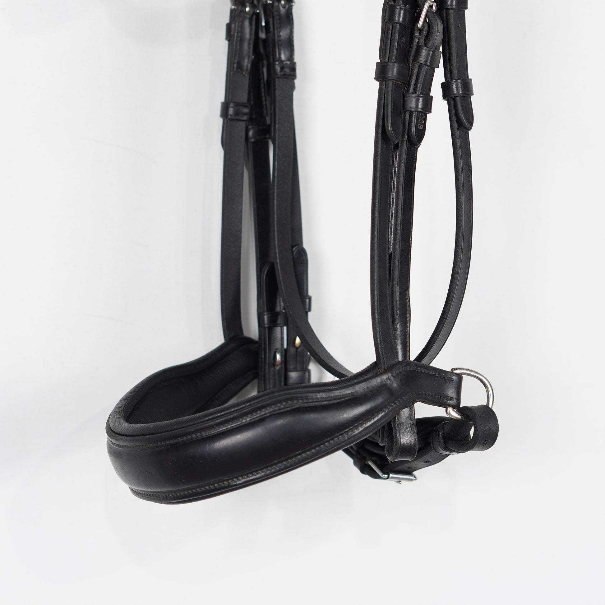 Stilrent kandarträns "Milan" i svart läder från Schockemöhle. Tränset har vadderat nack- och nosstycke samt pullback och är i ett använt men bra skick. Ett litet märke i lädret finns på nosgrimman, se bild. Tränset kommer även med matchande bridongtygel i svart läder.