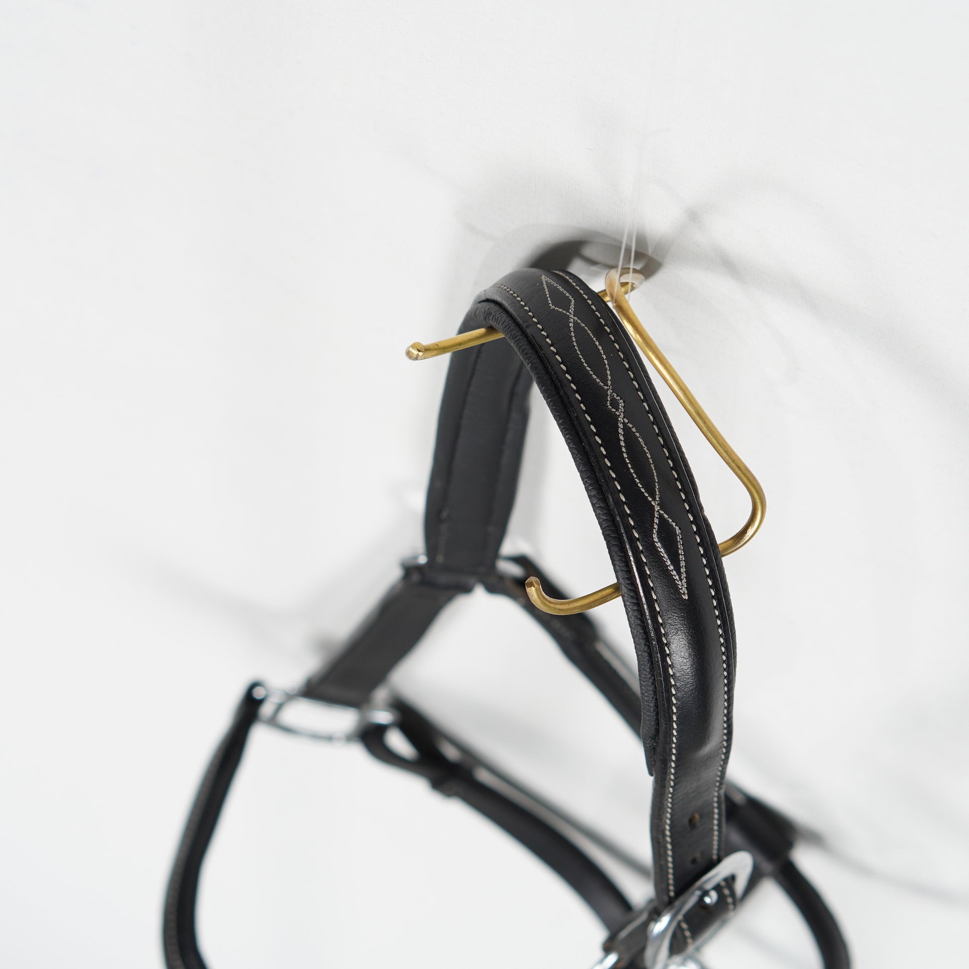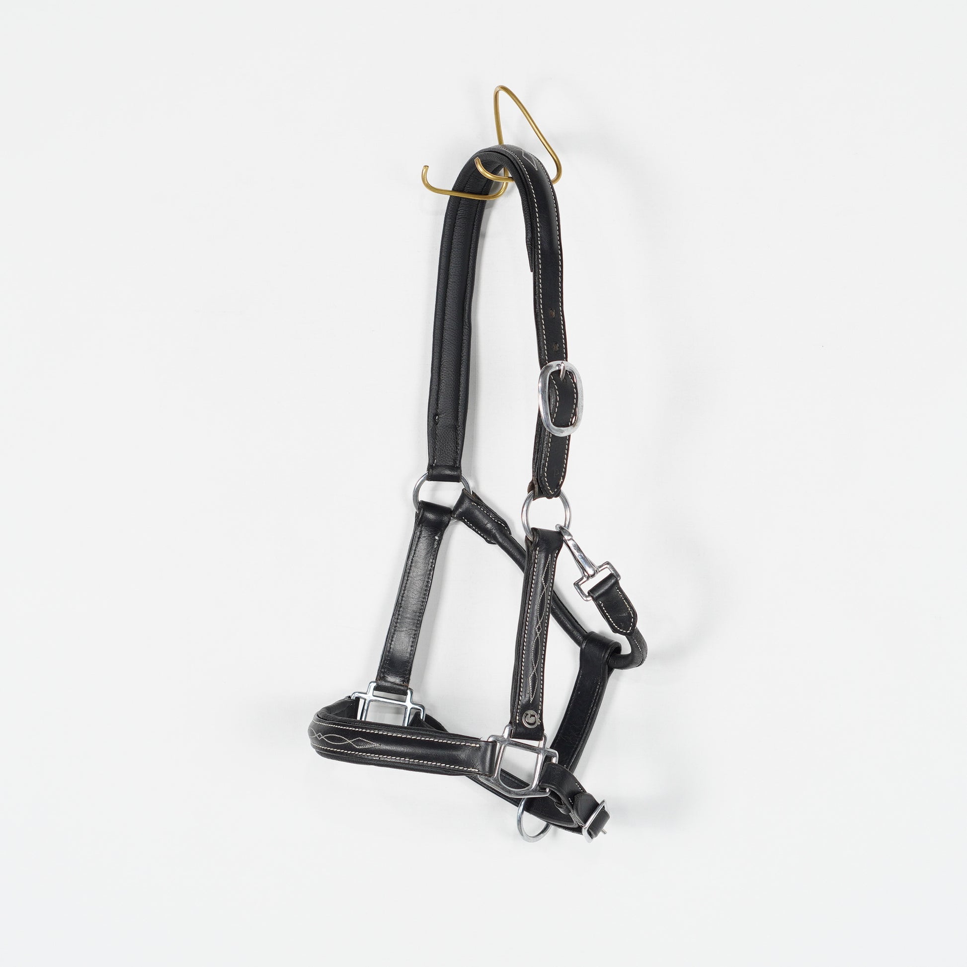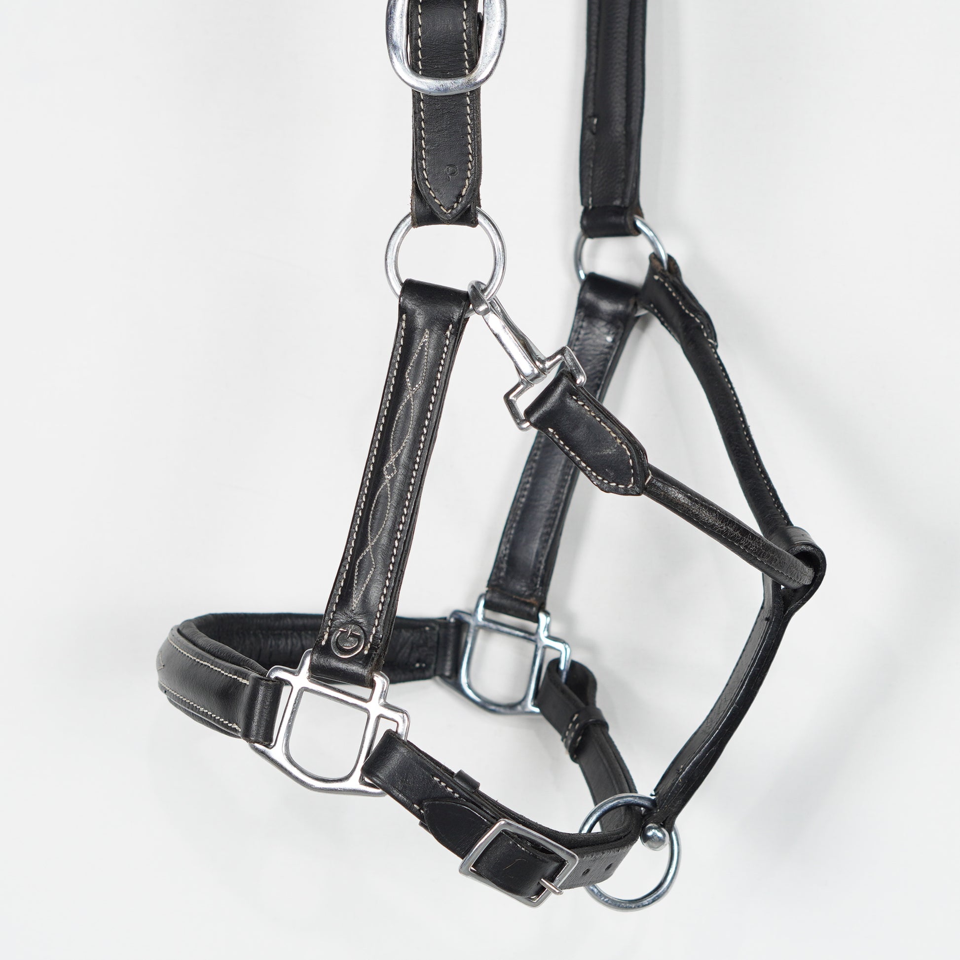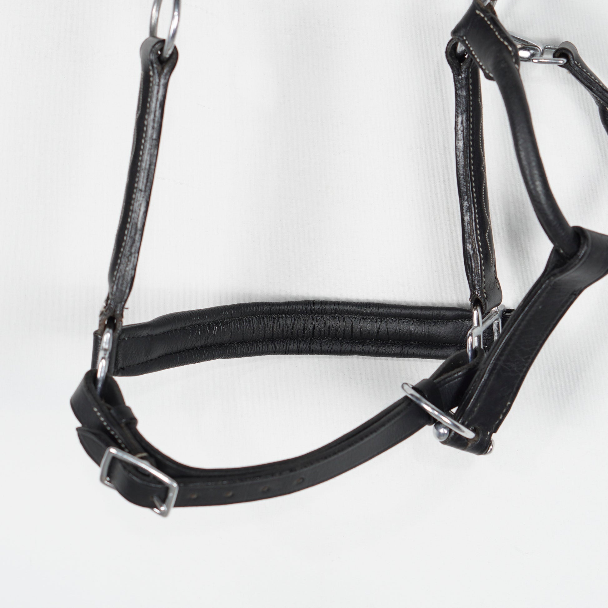 Svart lädergrimma dekorerad med vita stygn på både nos- och nackstycke.