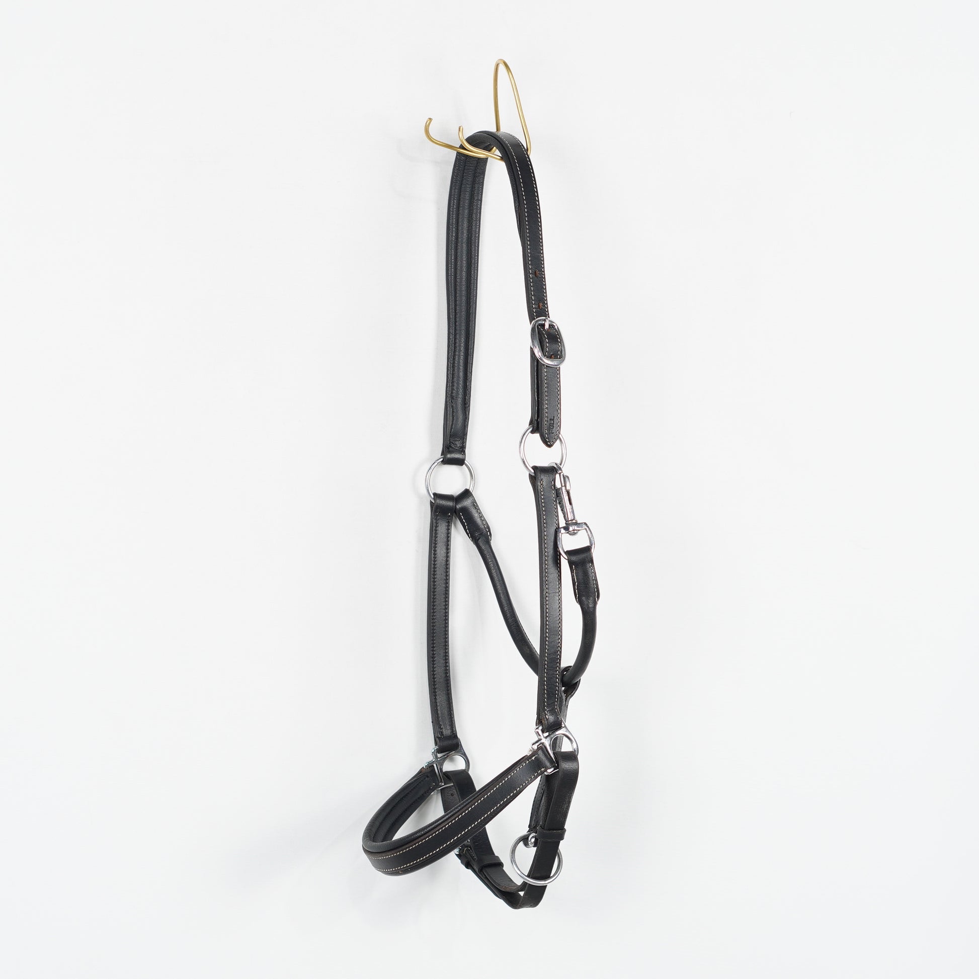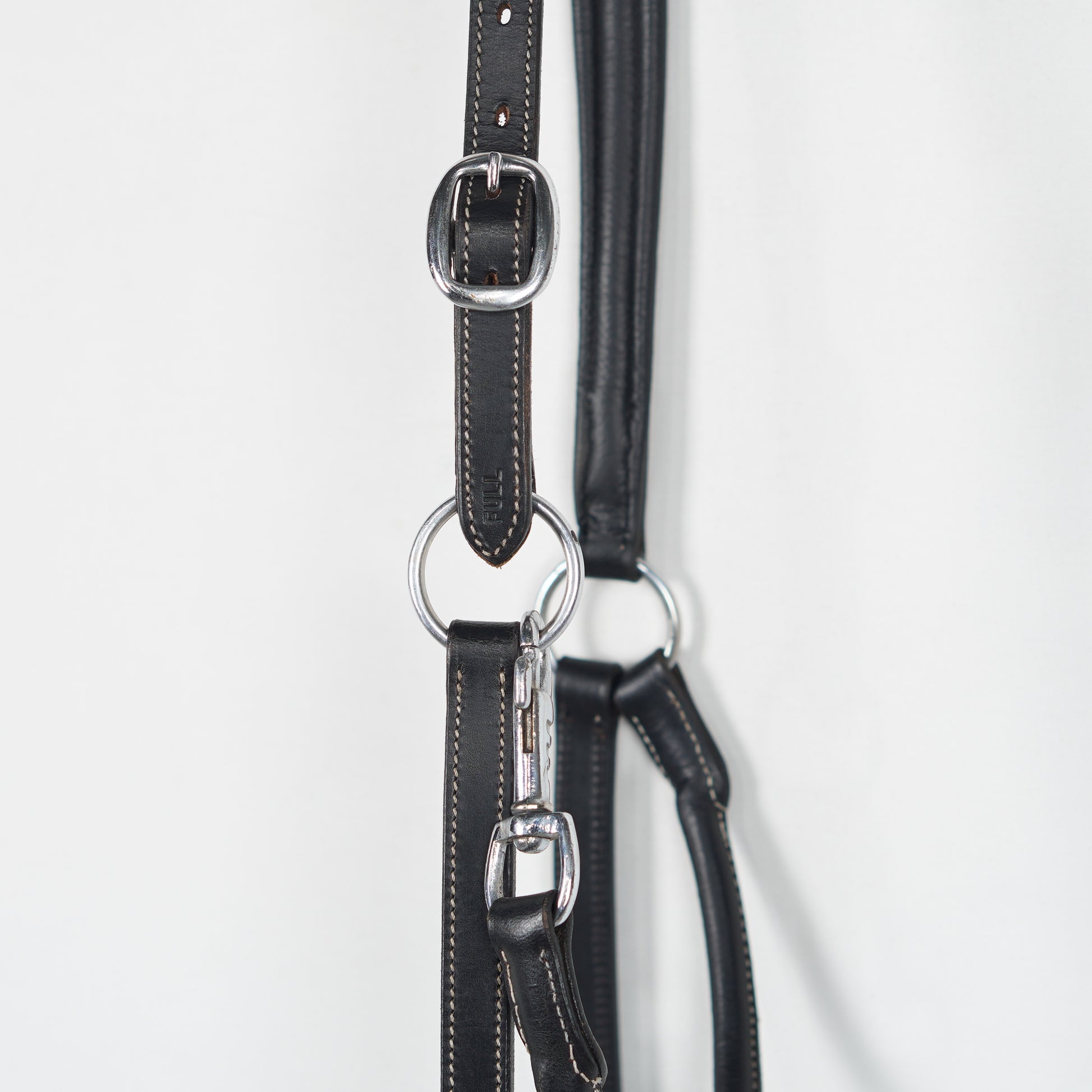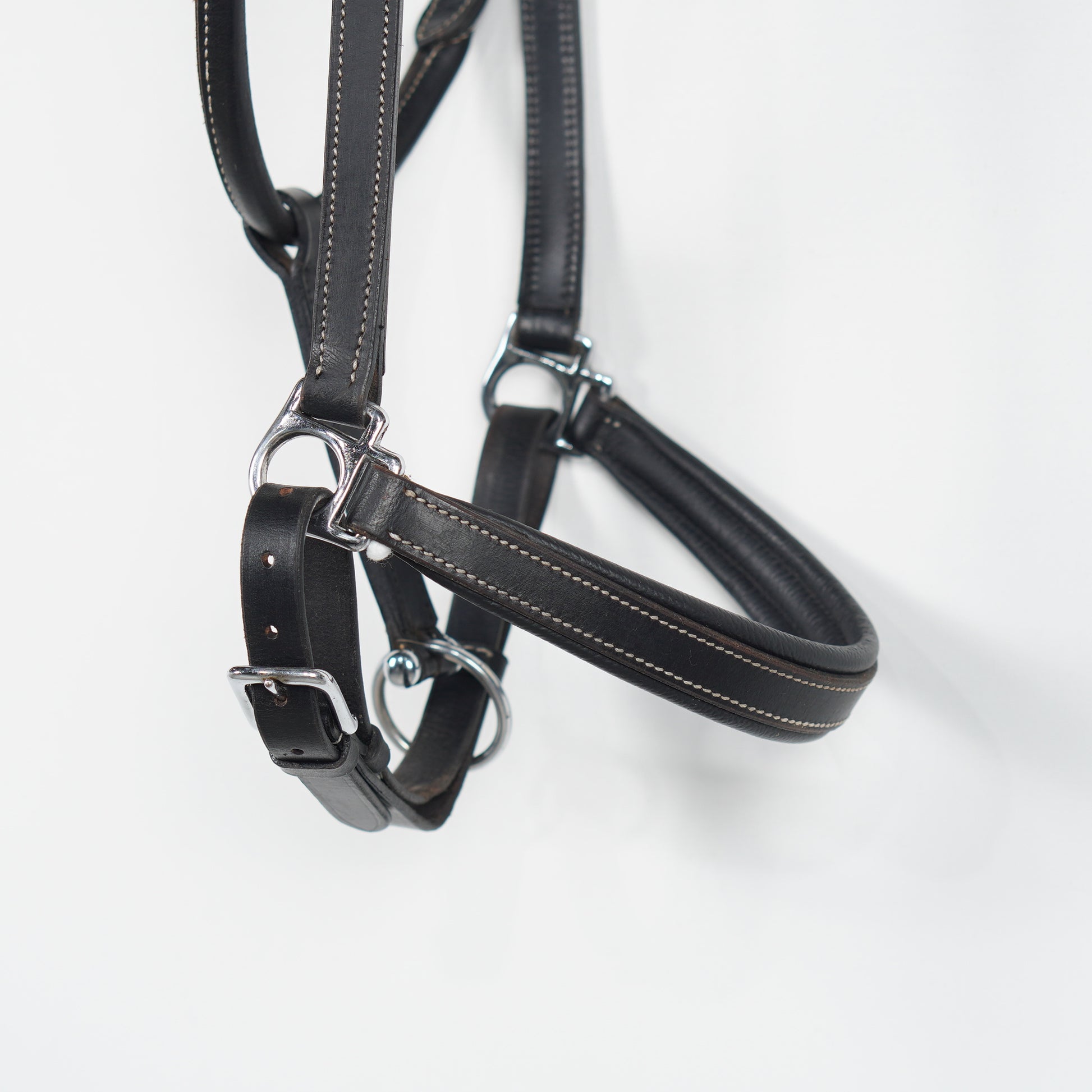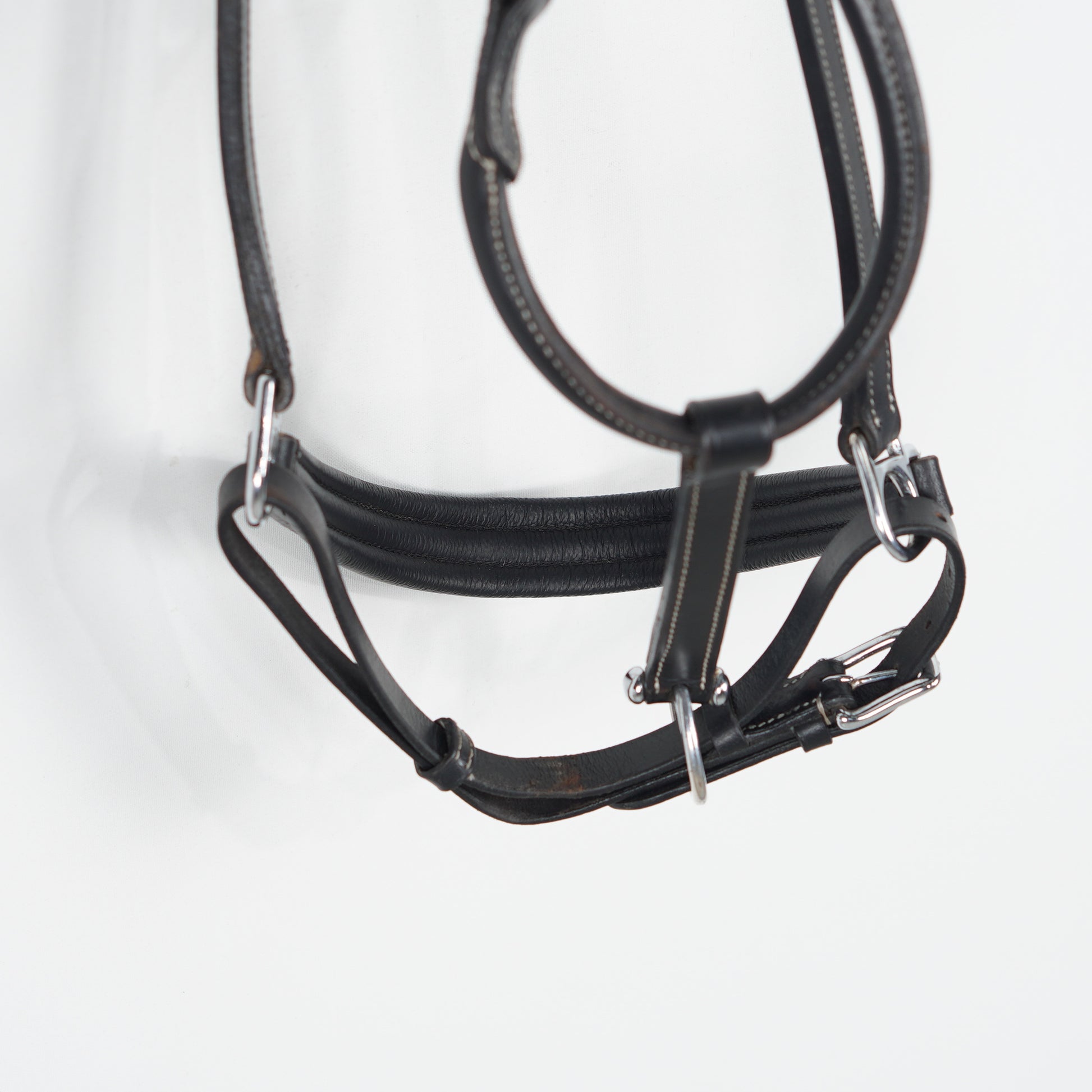 Svart lädergrimma med vita sömmar från okänd tillverkare.