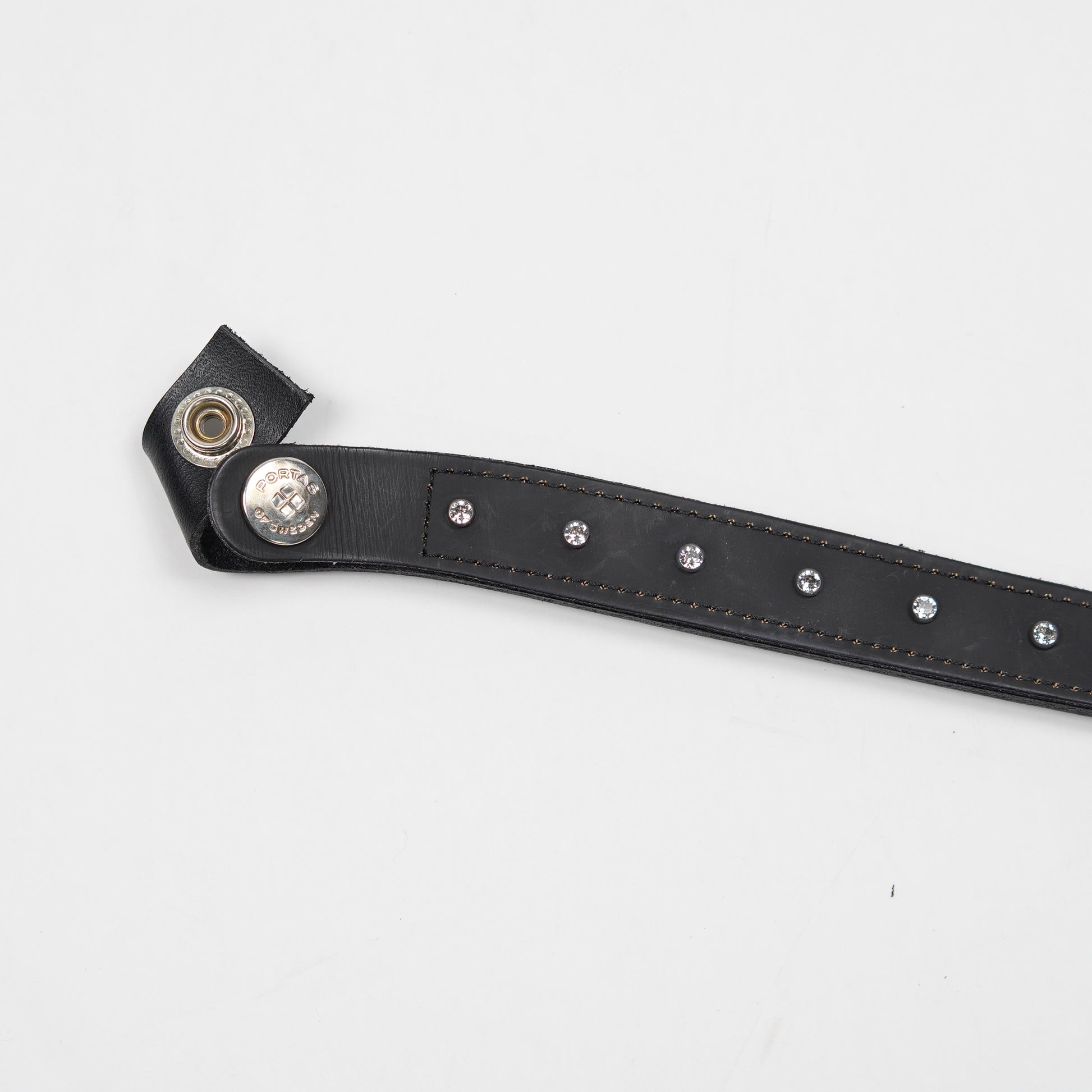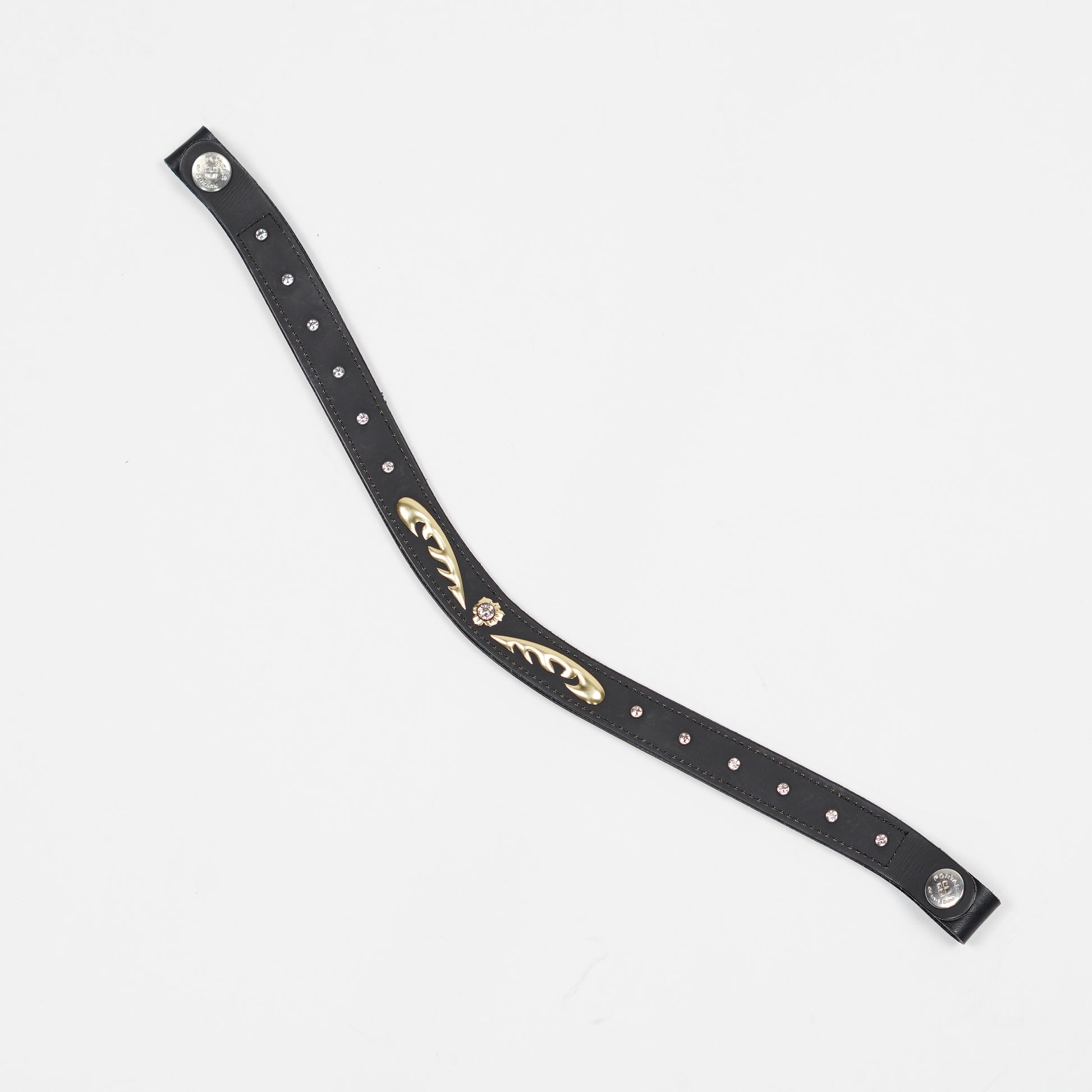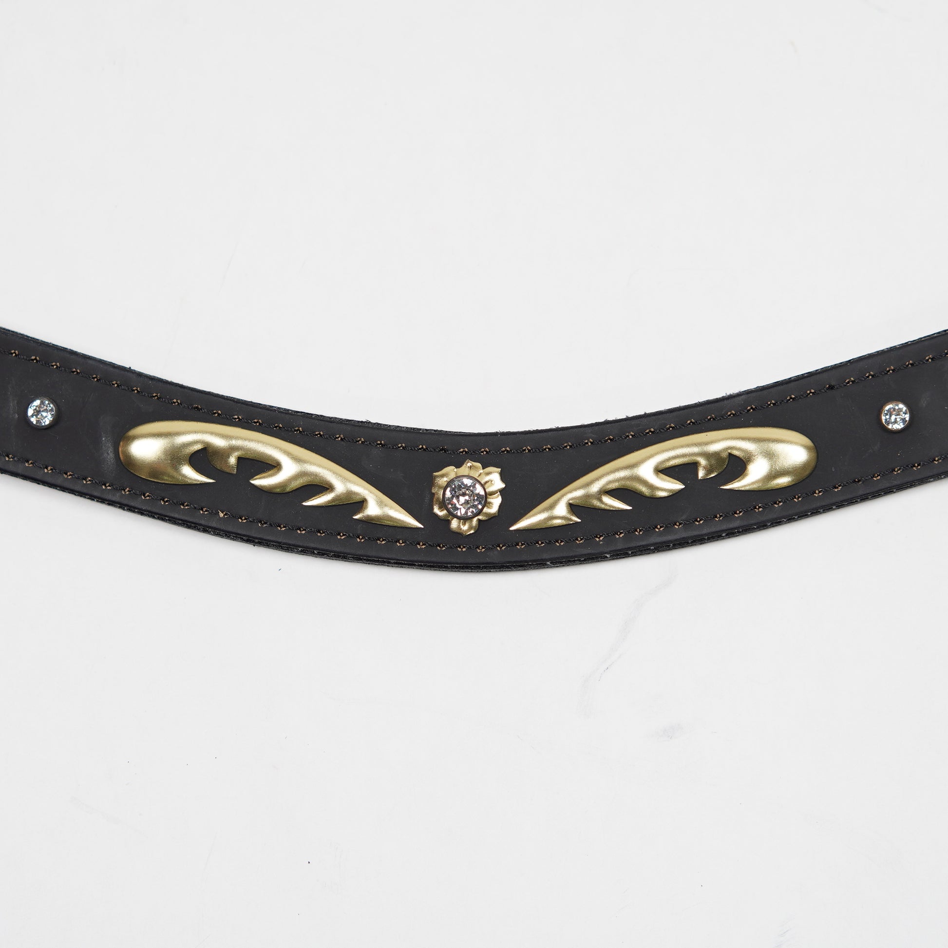 Pannband i svart läder med guldfärgad dekor och gnistrande stenar från Portas of Sweden.