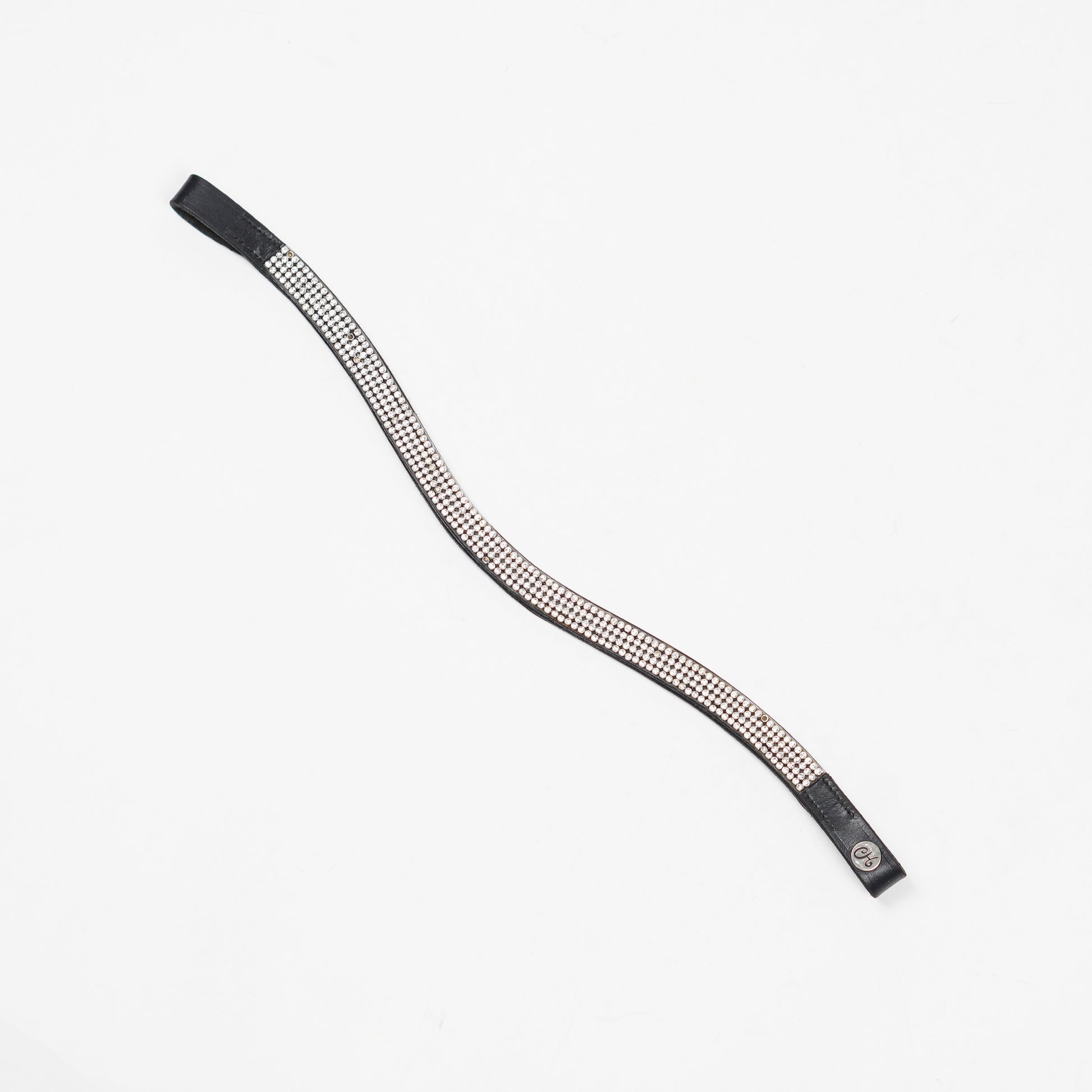 Pannband i svart läder med fyra rader av små stenar från Claridge House. Några stenar har tyvärr lossnat.
