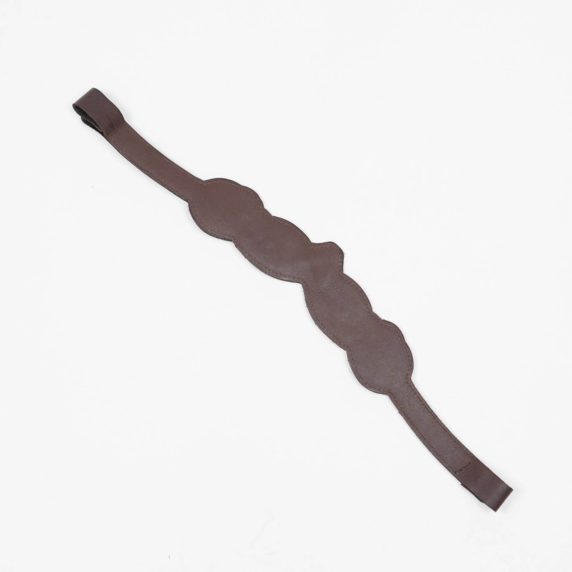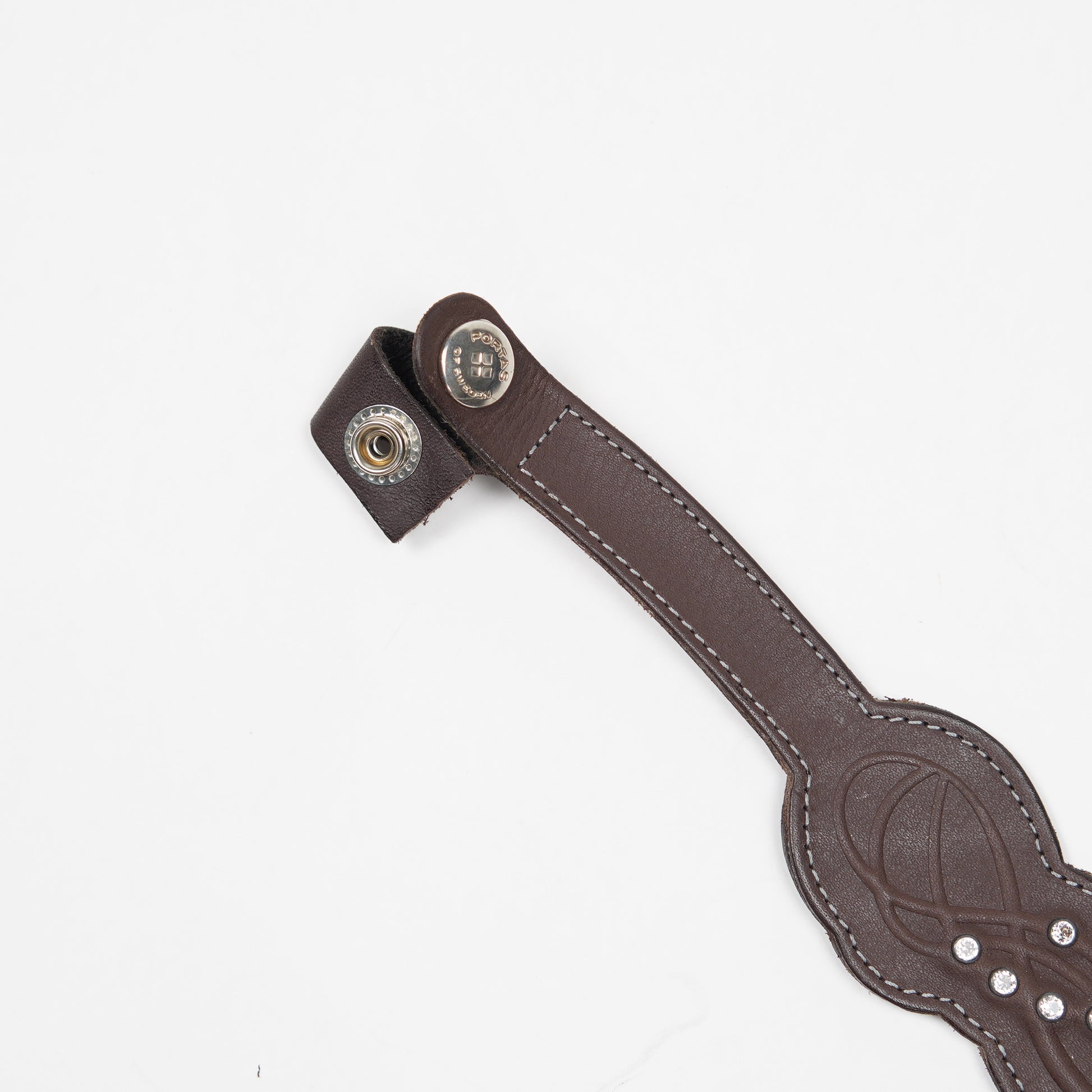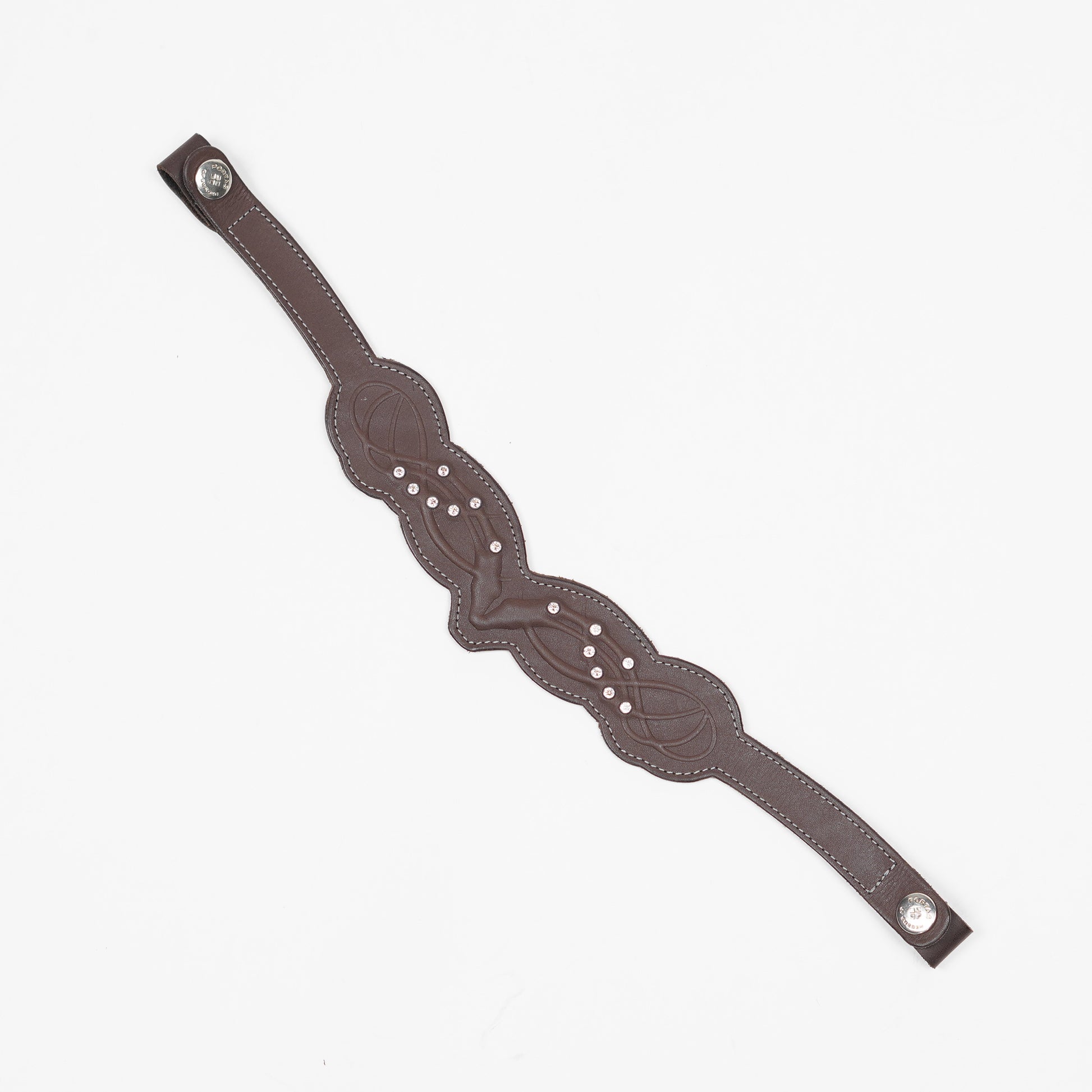 Pannband i brunt läder med en bredare del i mitten dekorerad med gnistrande stenar och knappfästen från Portas of Sweden.