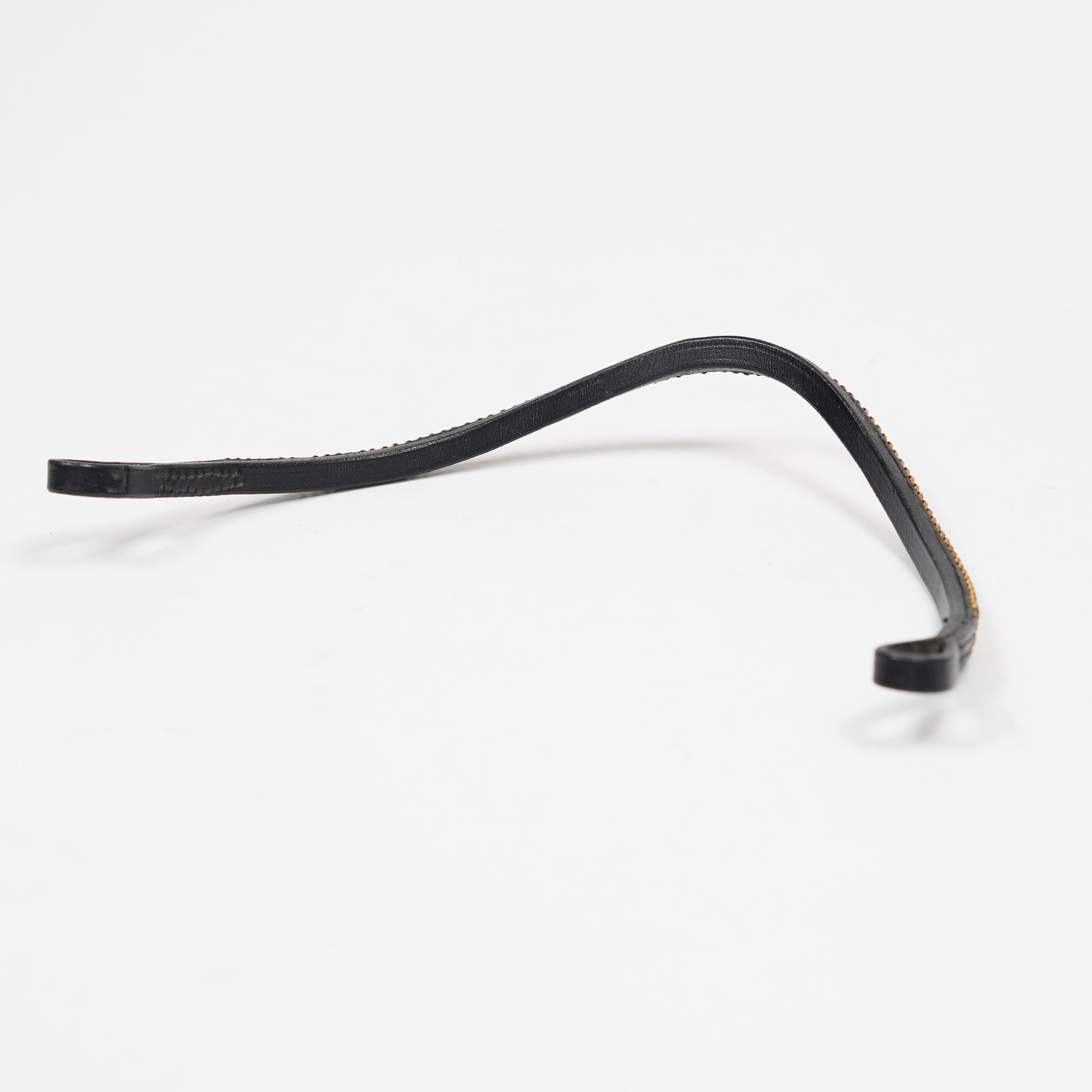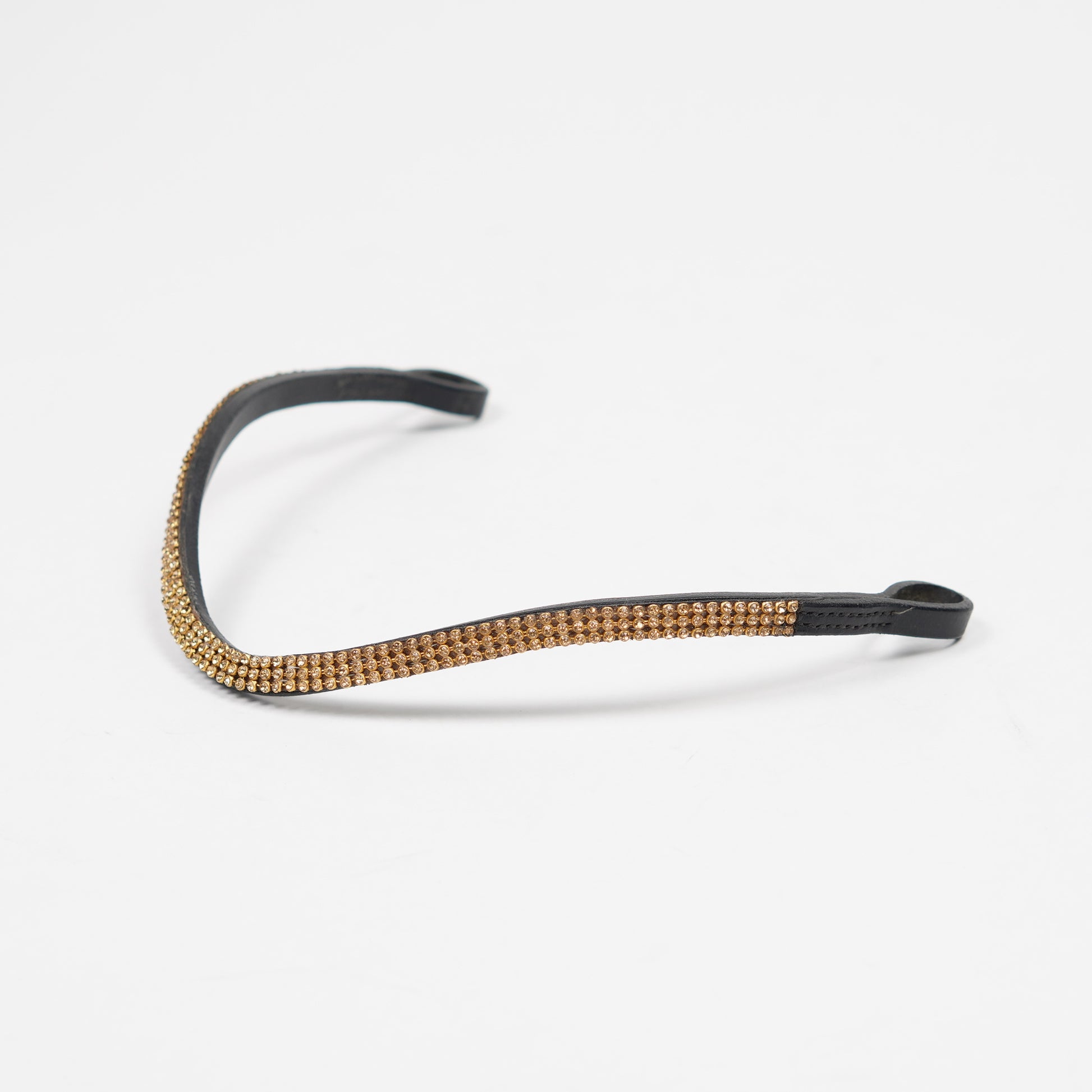 Pannband i svart läder med tre rader av strasstenar i guld.