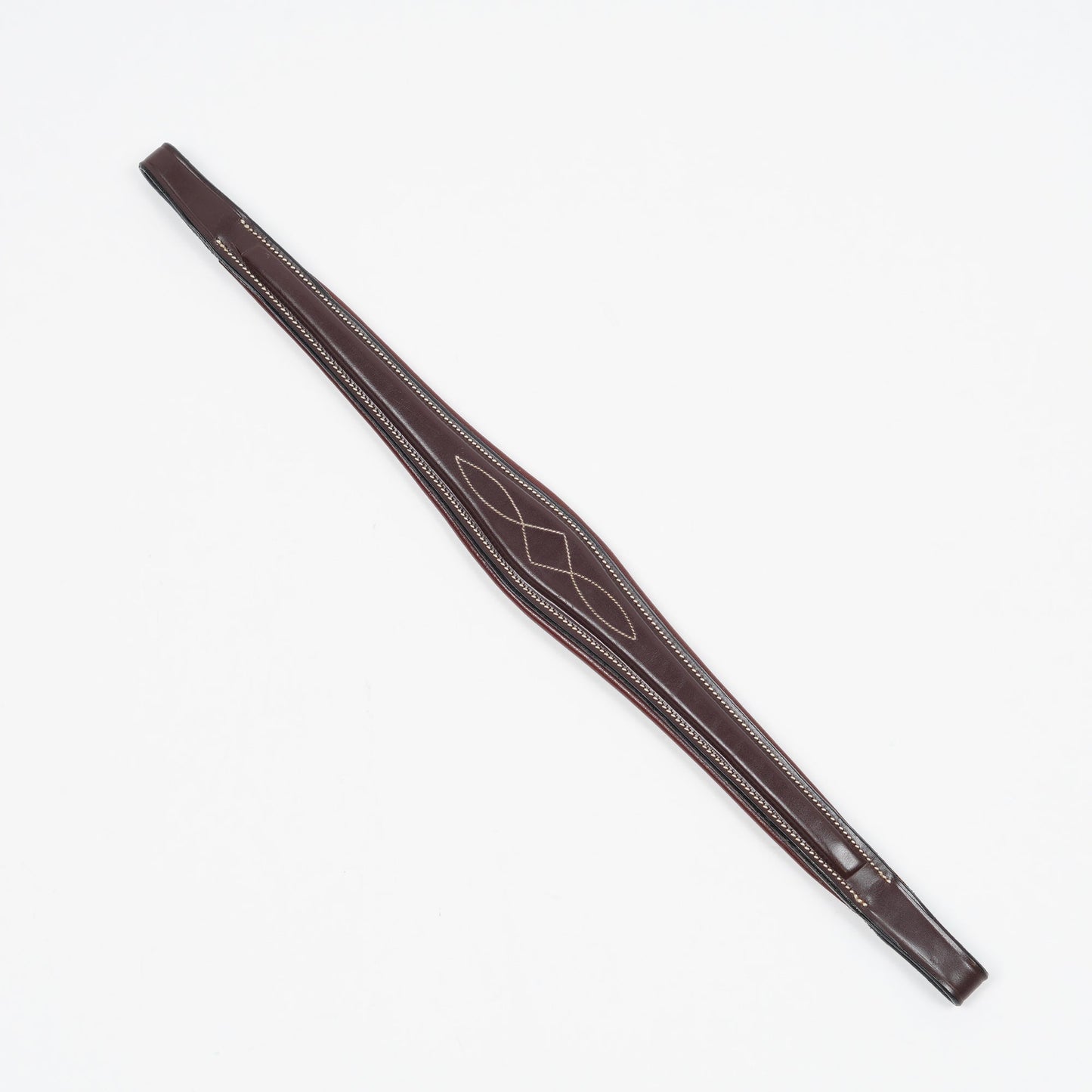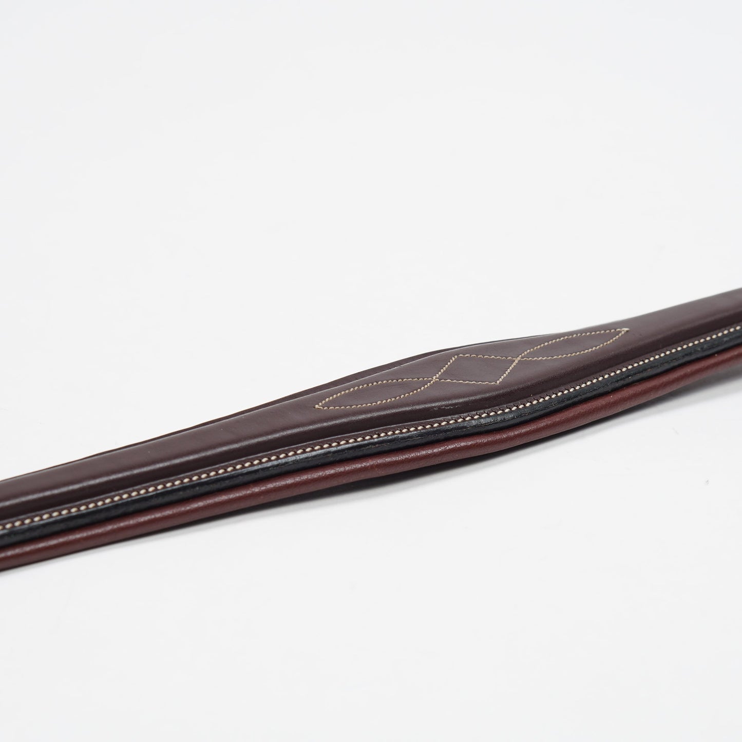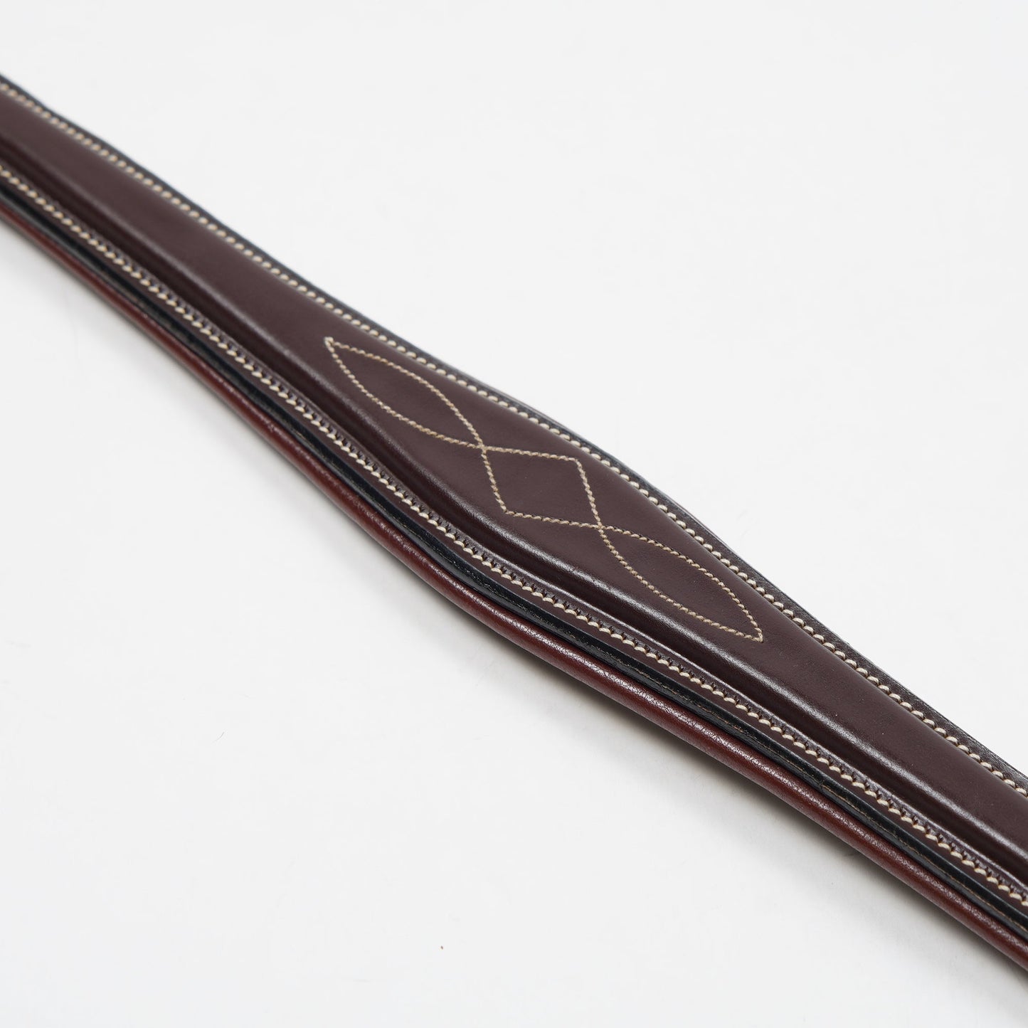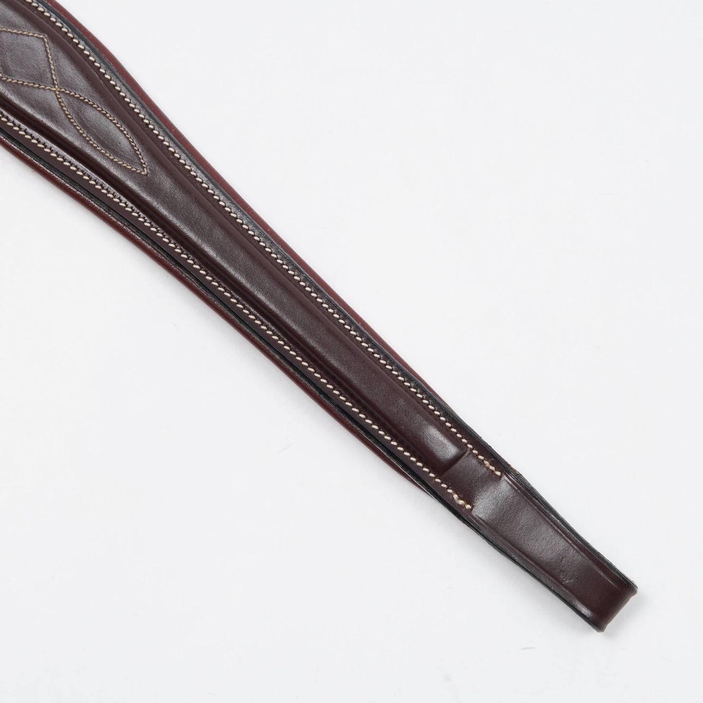 Pannband i läder med en bredare mitt och ljus mönstersöm. Pannbandet är i ett mycket bra skick. Pannbandet är ej märkt med Dyon, men det är vår kvalificerade gissning tack vare både utseende, kvalité och den info vi har.