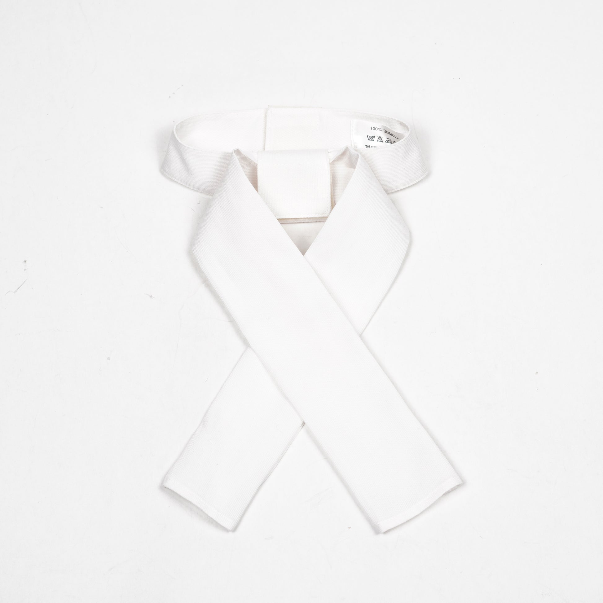 Vit plastrong av 100% bomull med kardborre i nacken från okänd tillverkare.