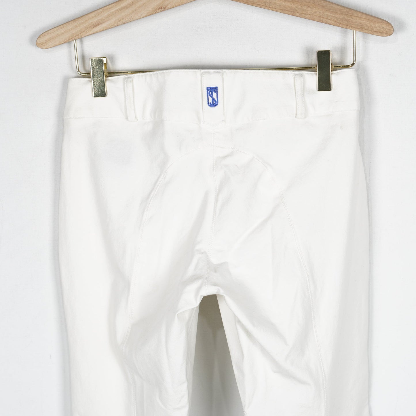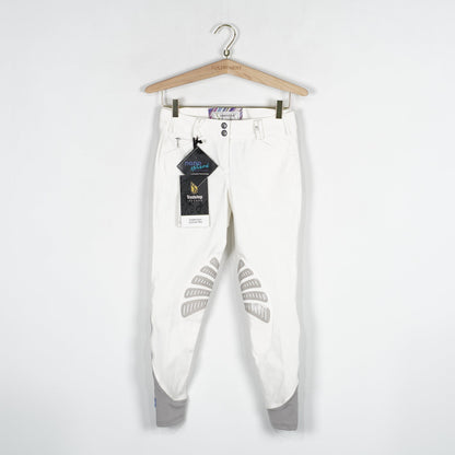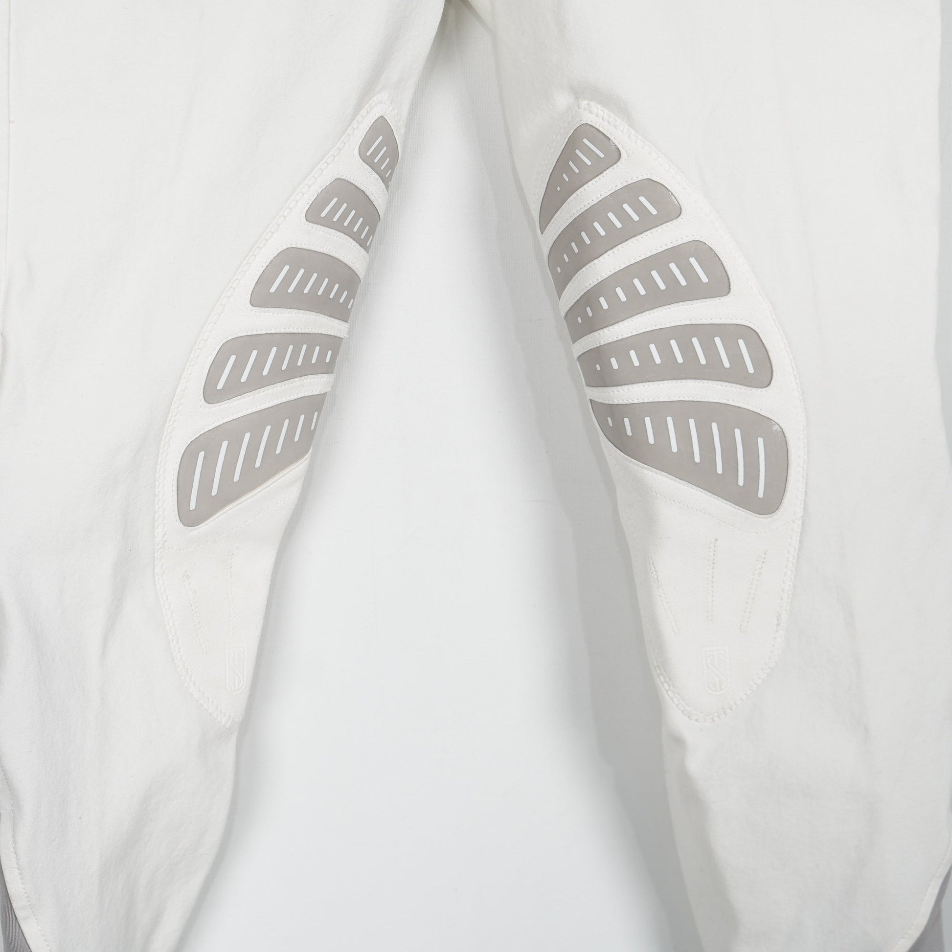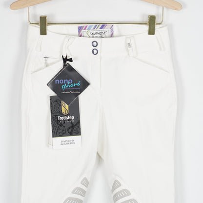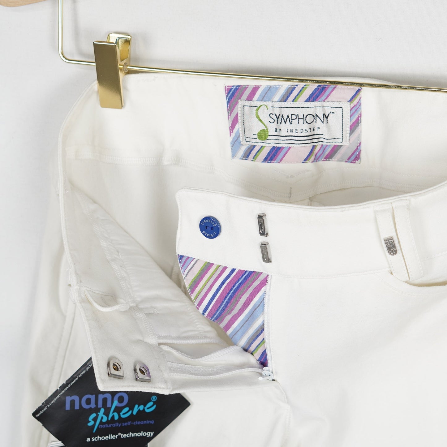 Vita ridbyxor halvskodda med både silikon och syntetmocka från Symphony by Tredstep. Ridbyxorna har en låg midja, elastiskt benslut och är i ett oanvänt skick.