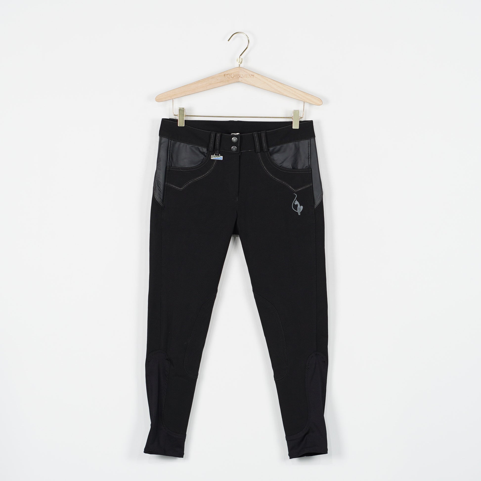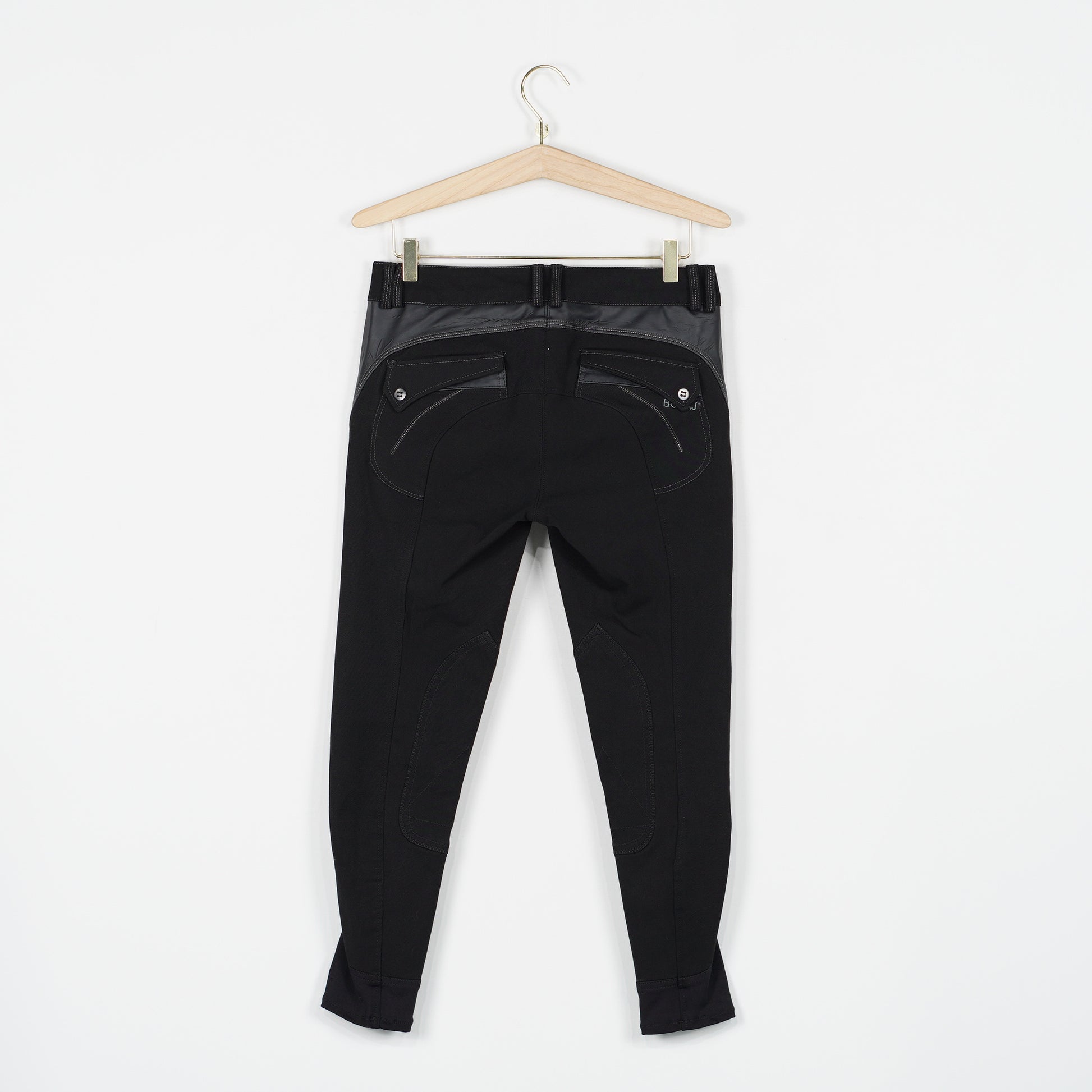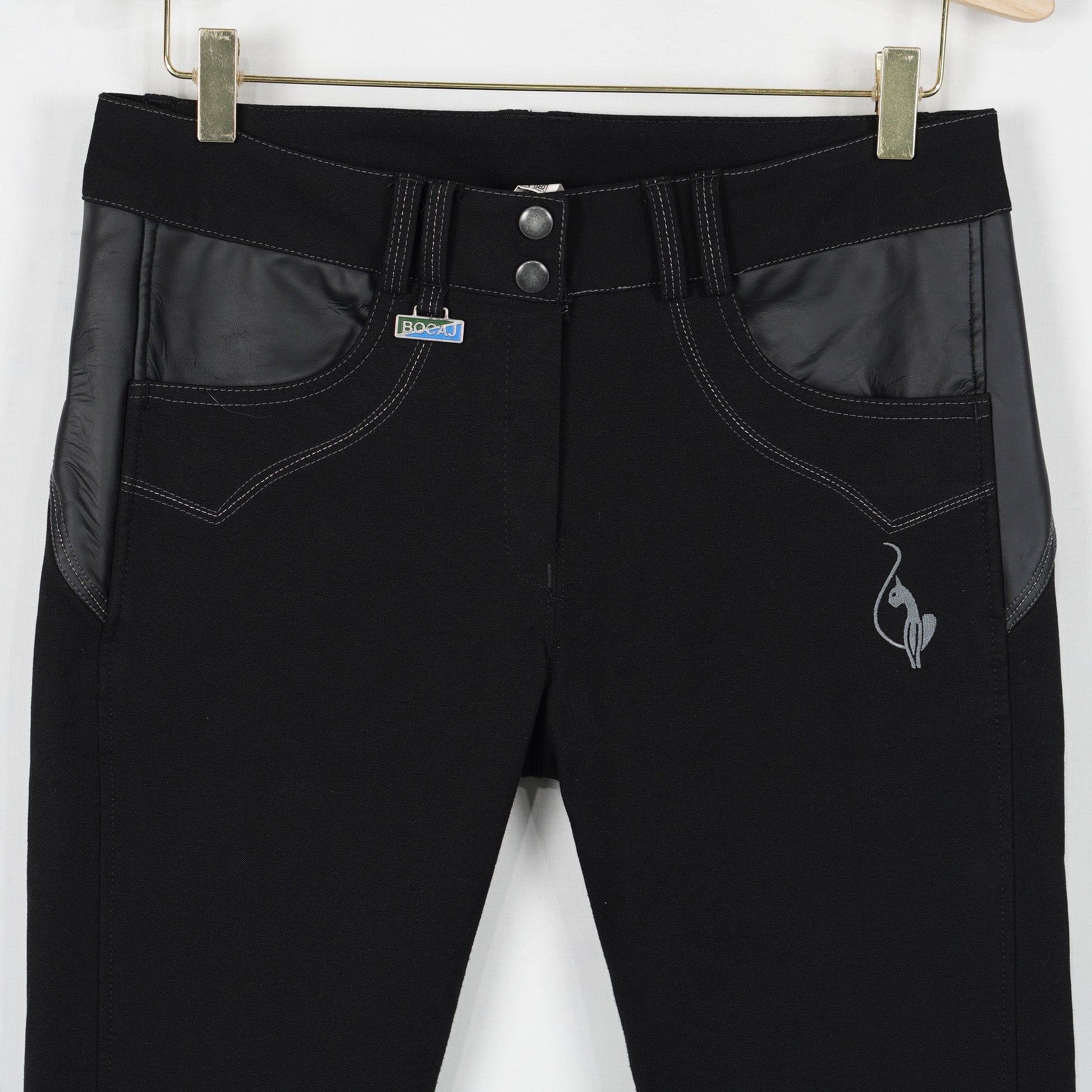 Svarta oskodda ridbyxor med knäförstärkning och elastiska benslut från Globus. Byxorna har även en söt katt broderad på framsidan, se bild.