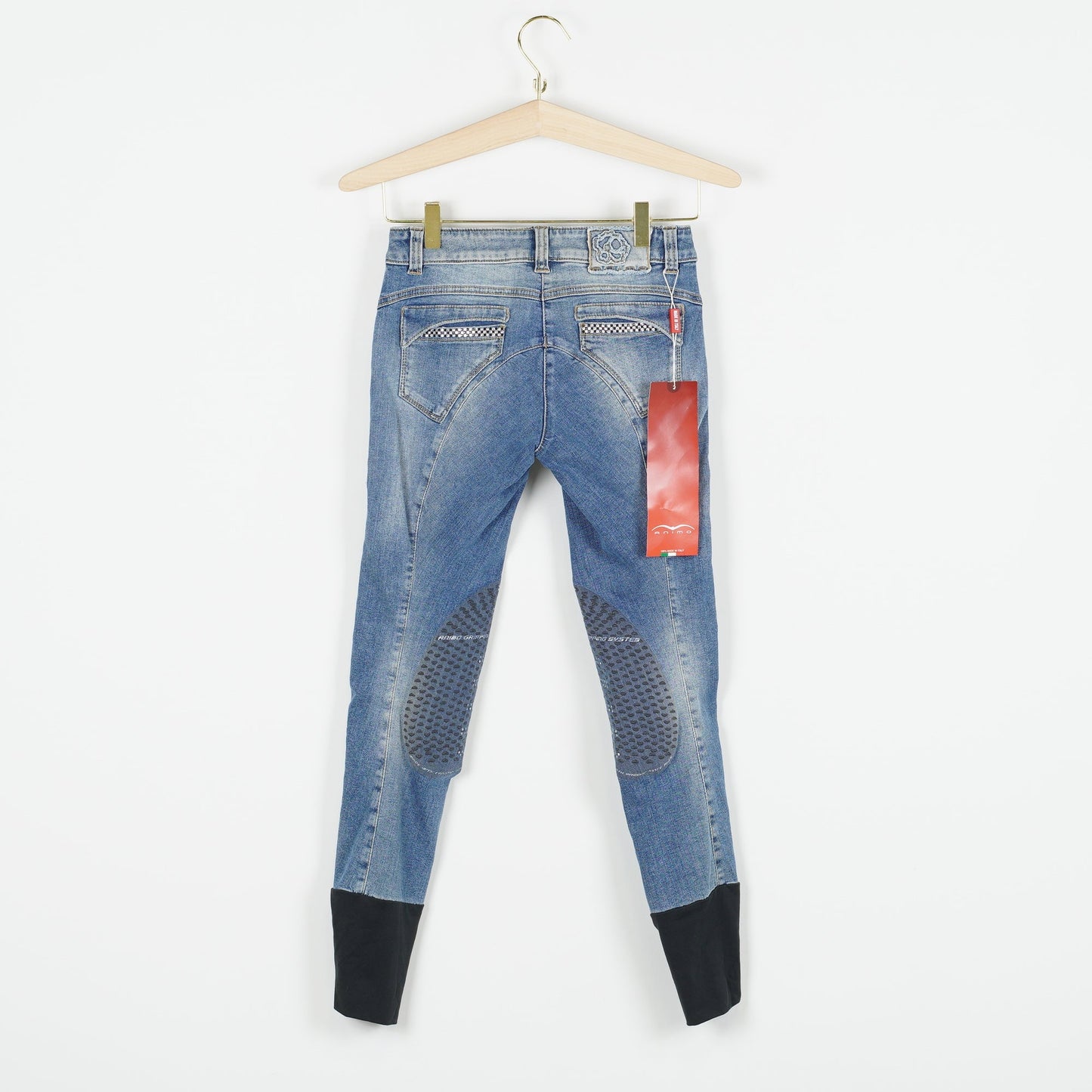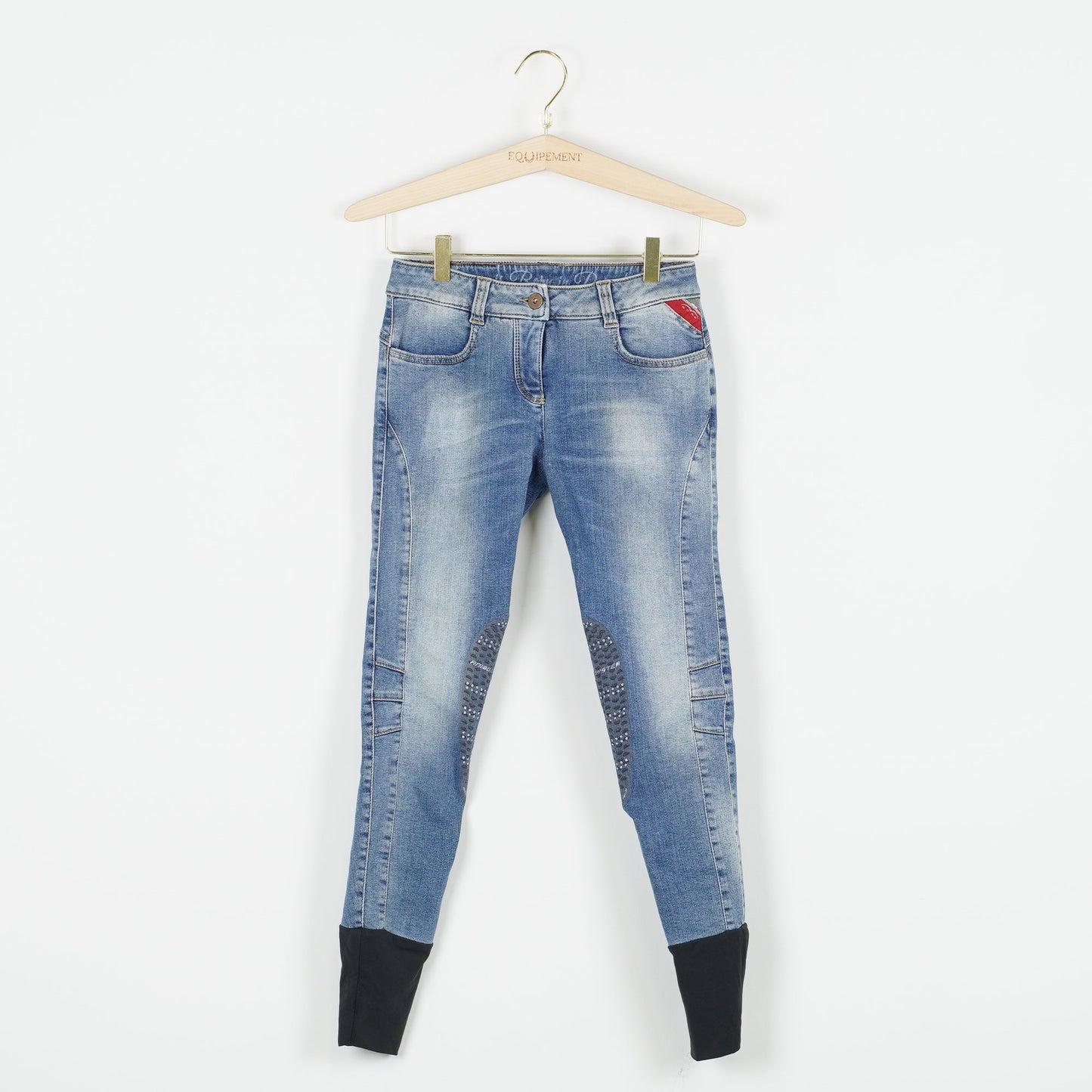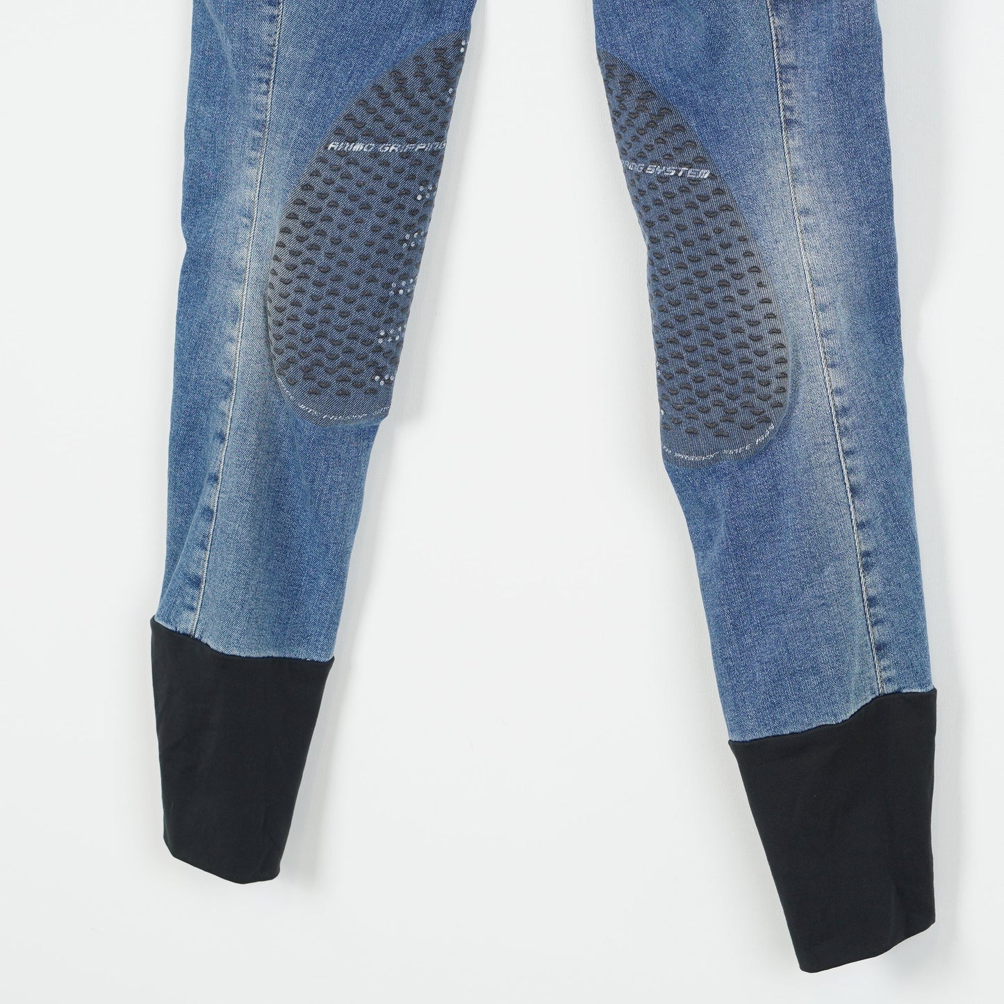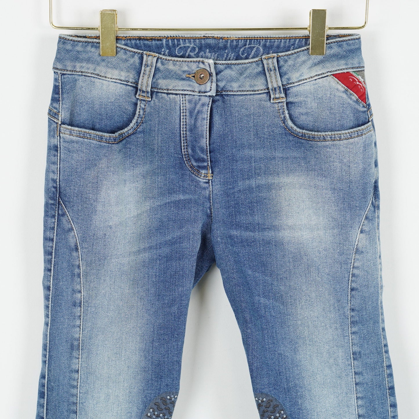 Ridbyxor "Nullo" från Animo i stentvättat jeansmaterial och halvskoning av silikon. Byxorna Har en låg midja och är prydd med snygga detaljer som bling på bakfickorna. Byxorna är nya med tags.