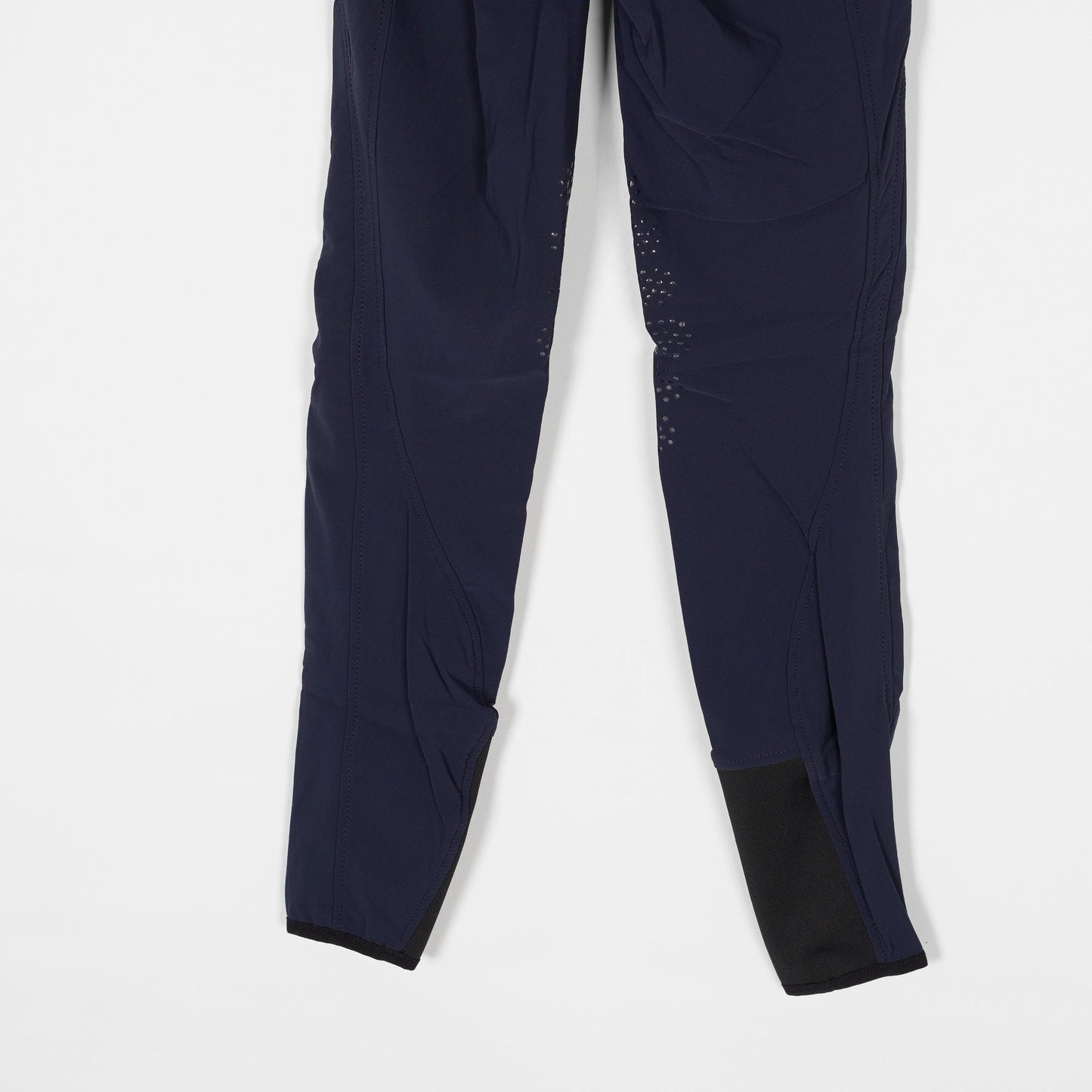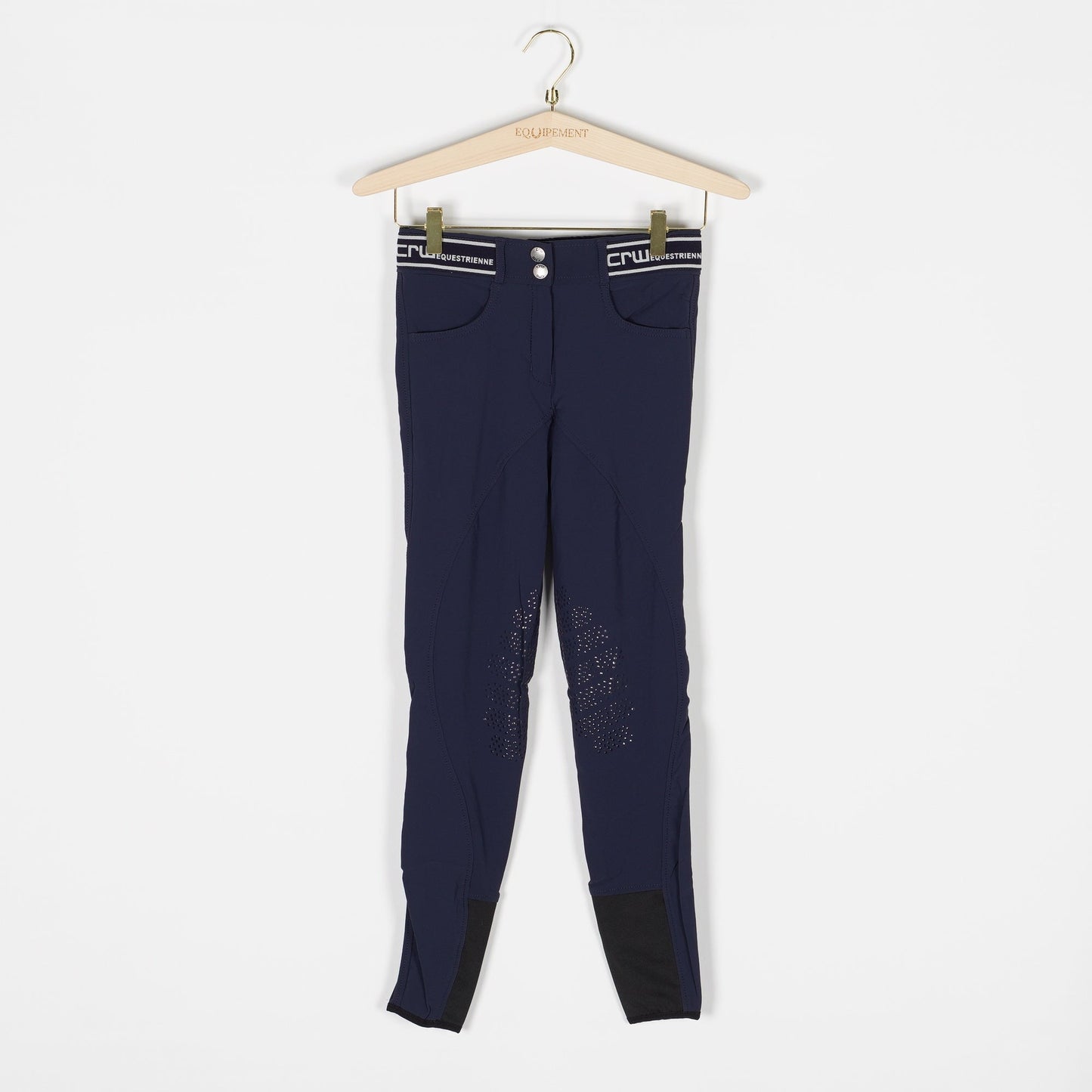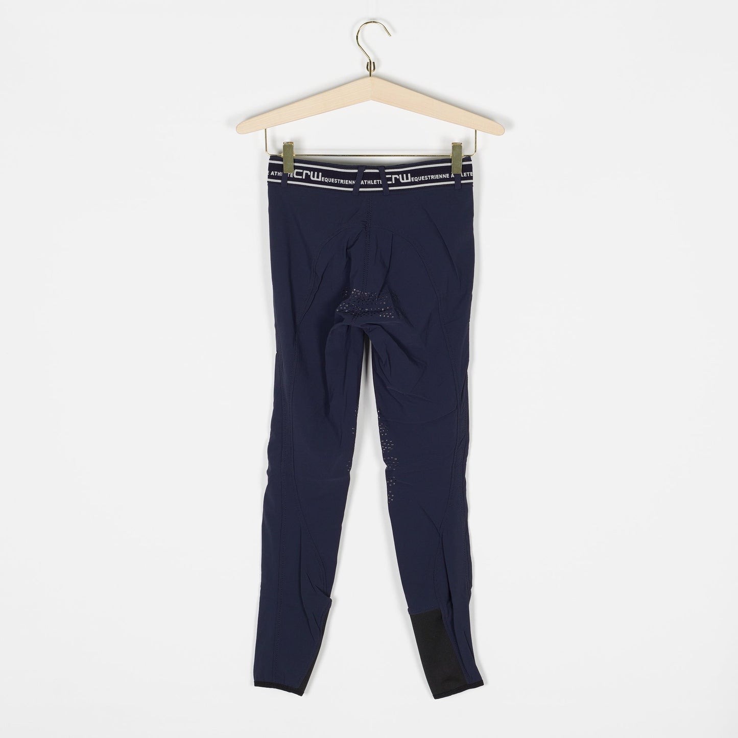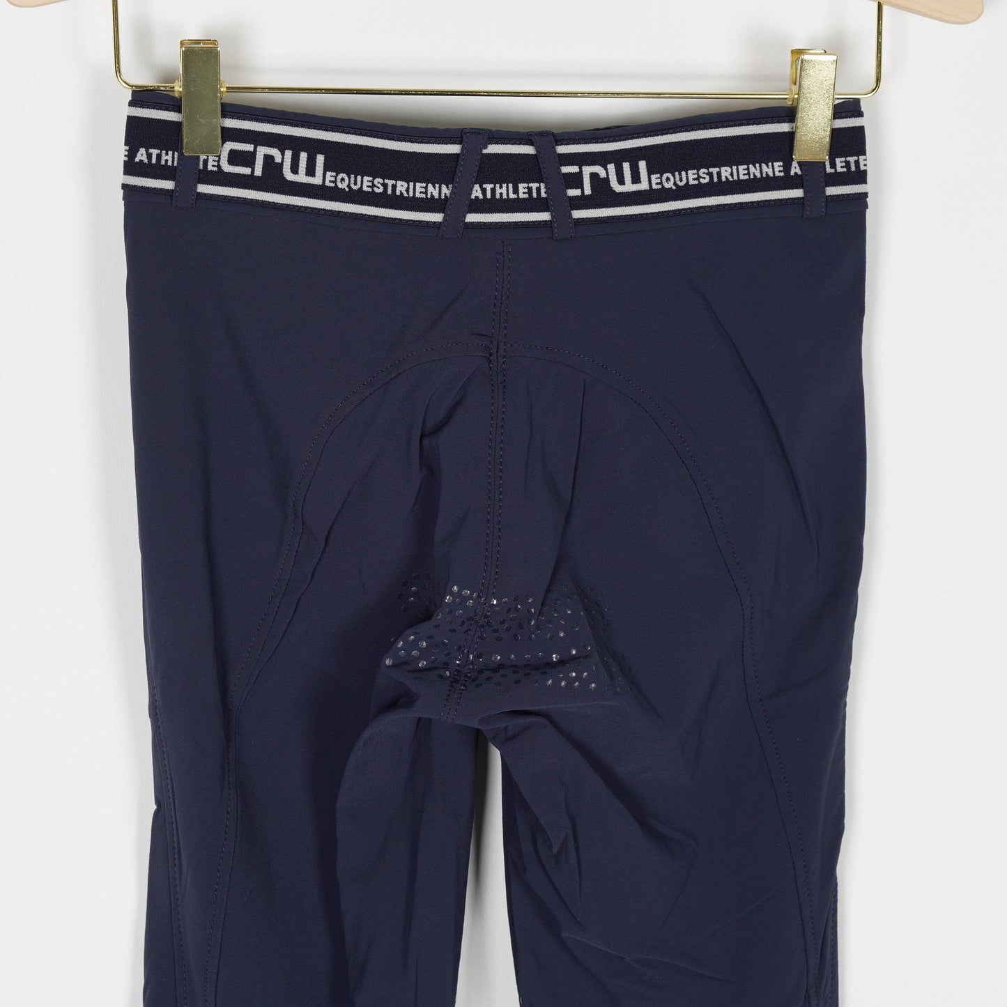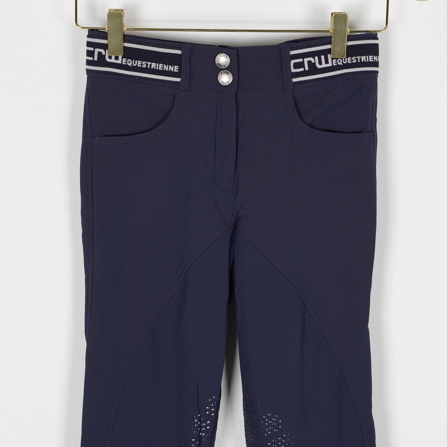 Mörkblå ridbyxor från CRW med silikonskoning längs insida knän och under sitsen samt resår i midjan. Ridbyxorna är i ett jättefint skick och kan knappt vara använda.