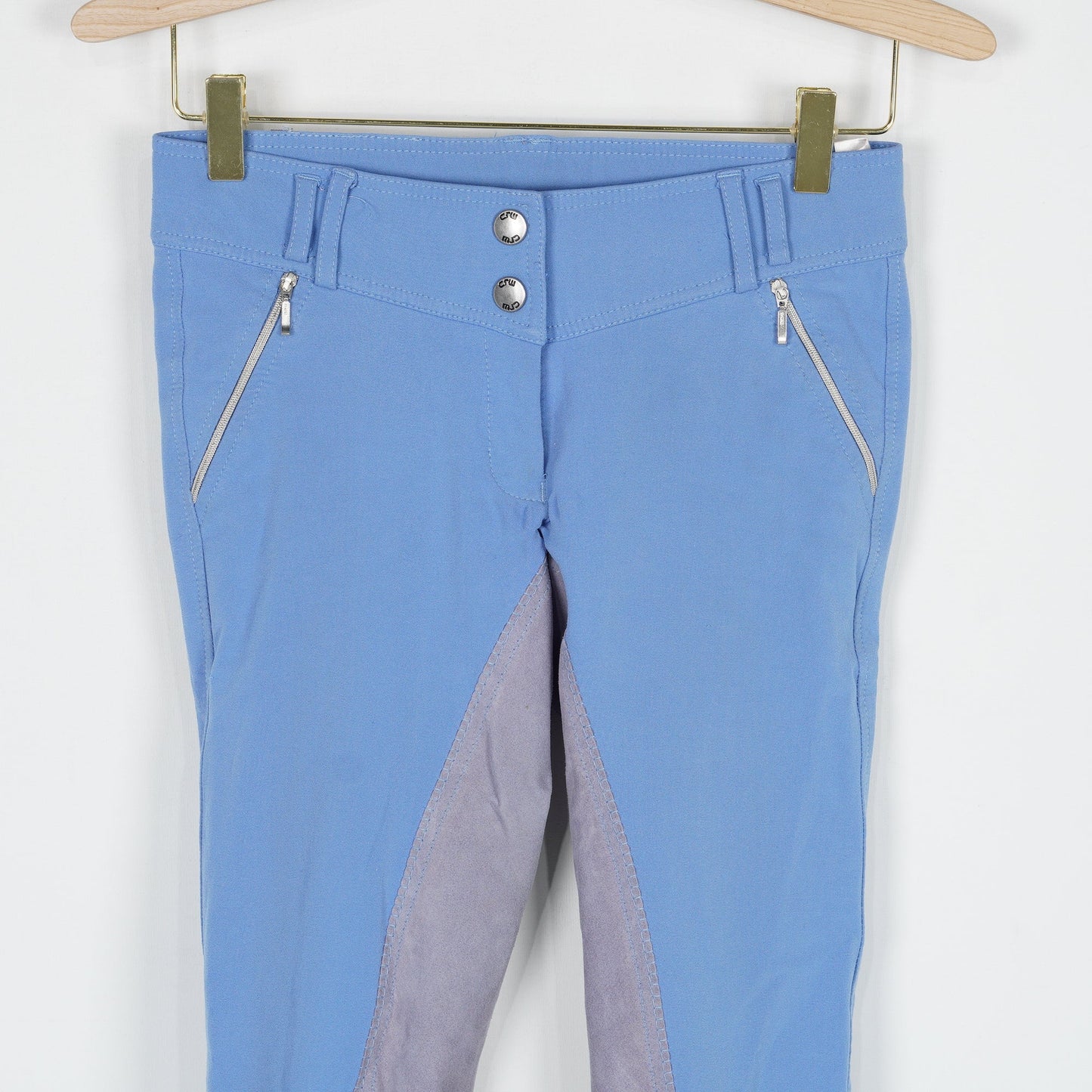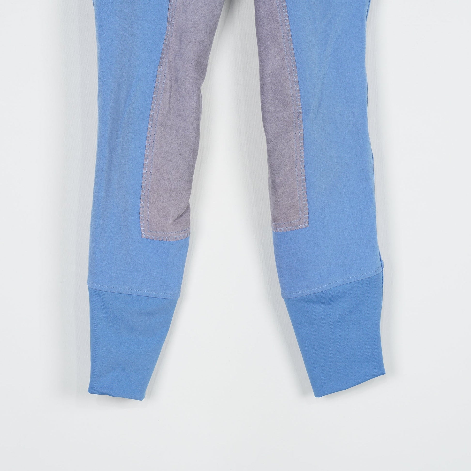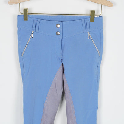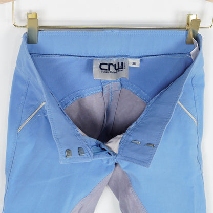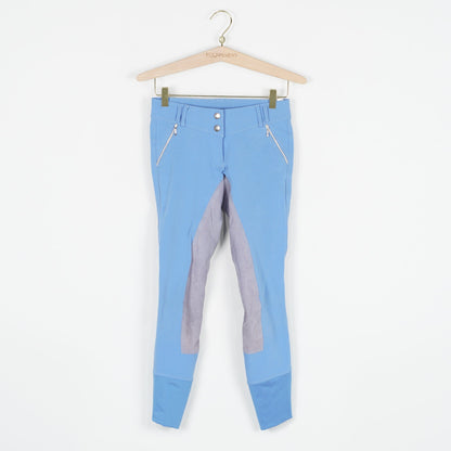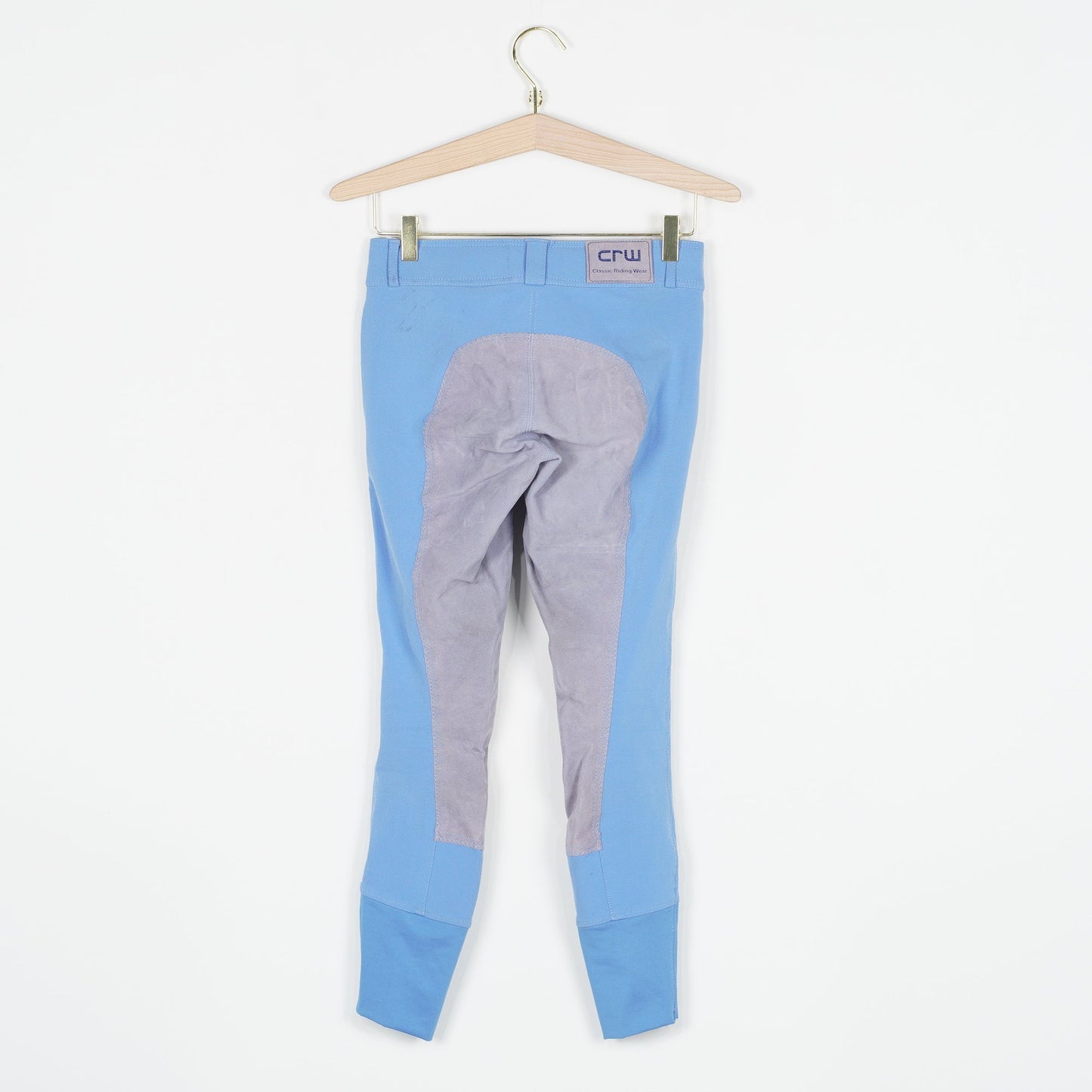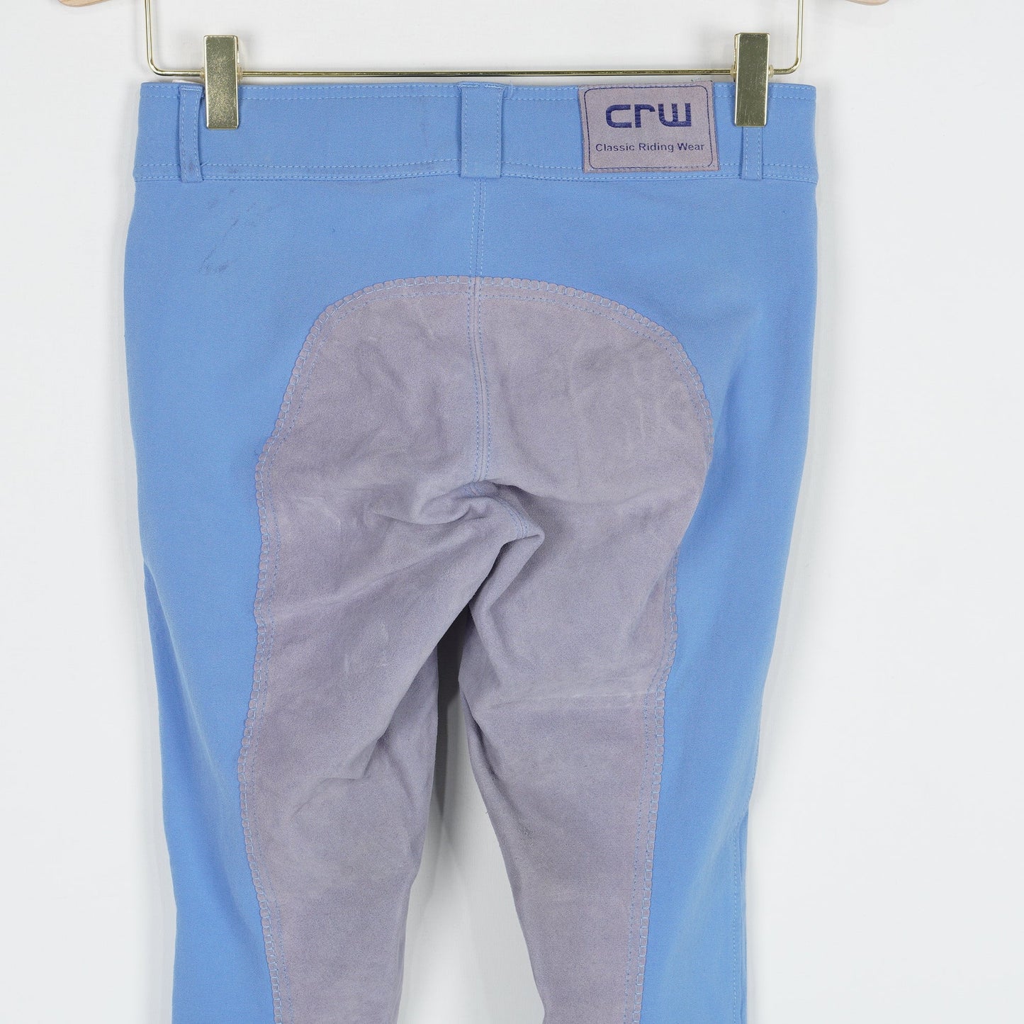 Helskodda ridbyxor i ljusblått med elastiskt benslut från CRW. Ridbyxorna är i ett använt men bra skick.