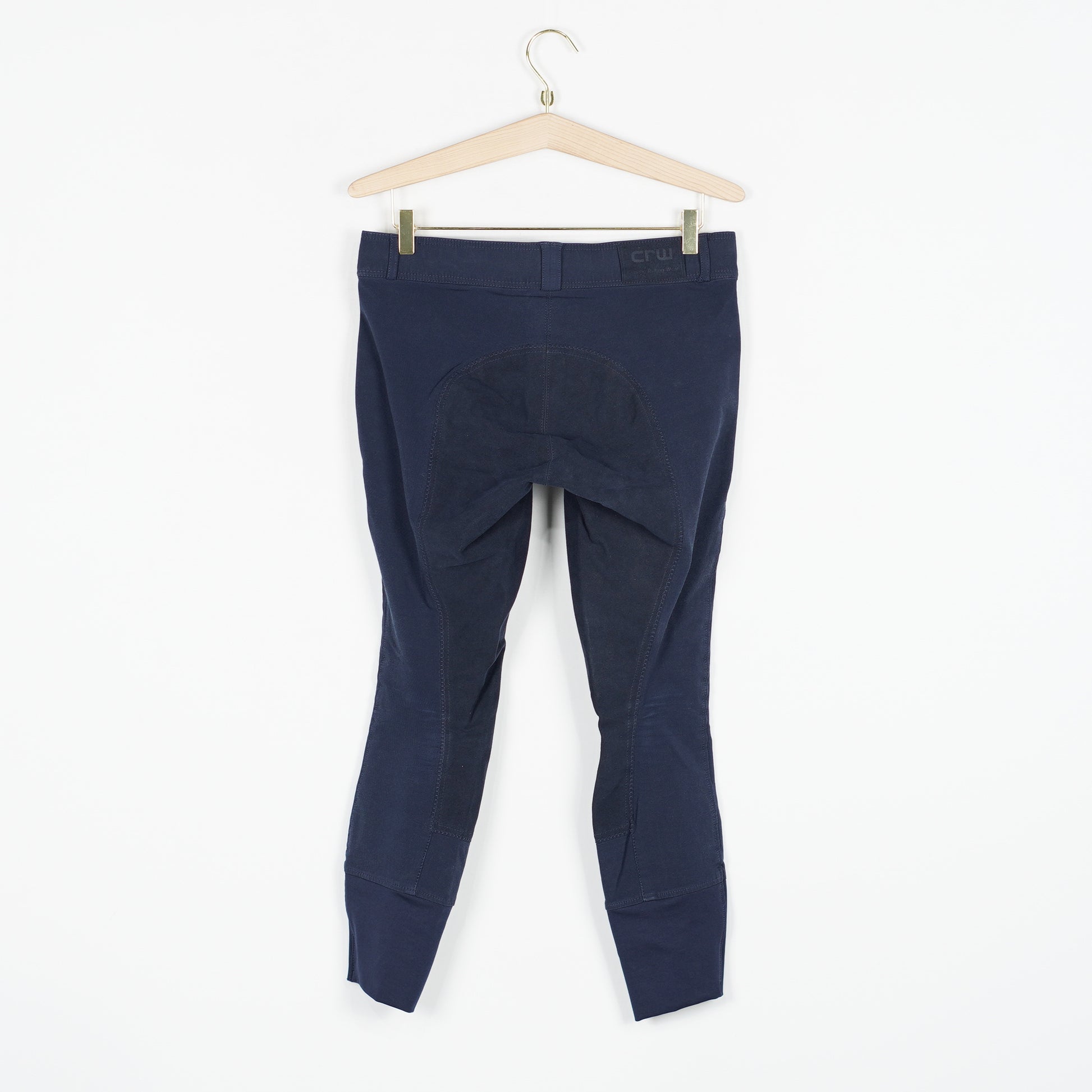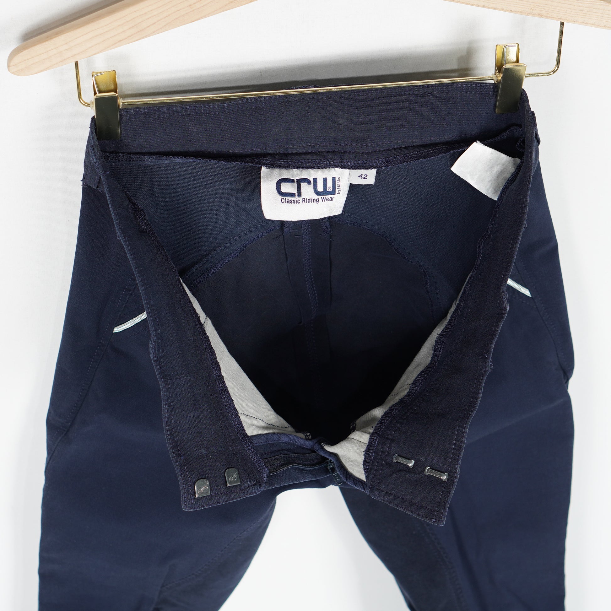 Blå ridbyxor helskodda med syntetmocka och elastiskt benslut från CRW. Resåren i midjan är något uttöjd, se mått.