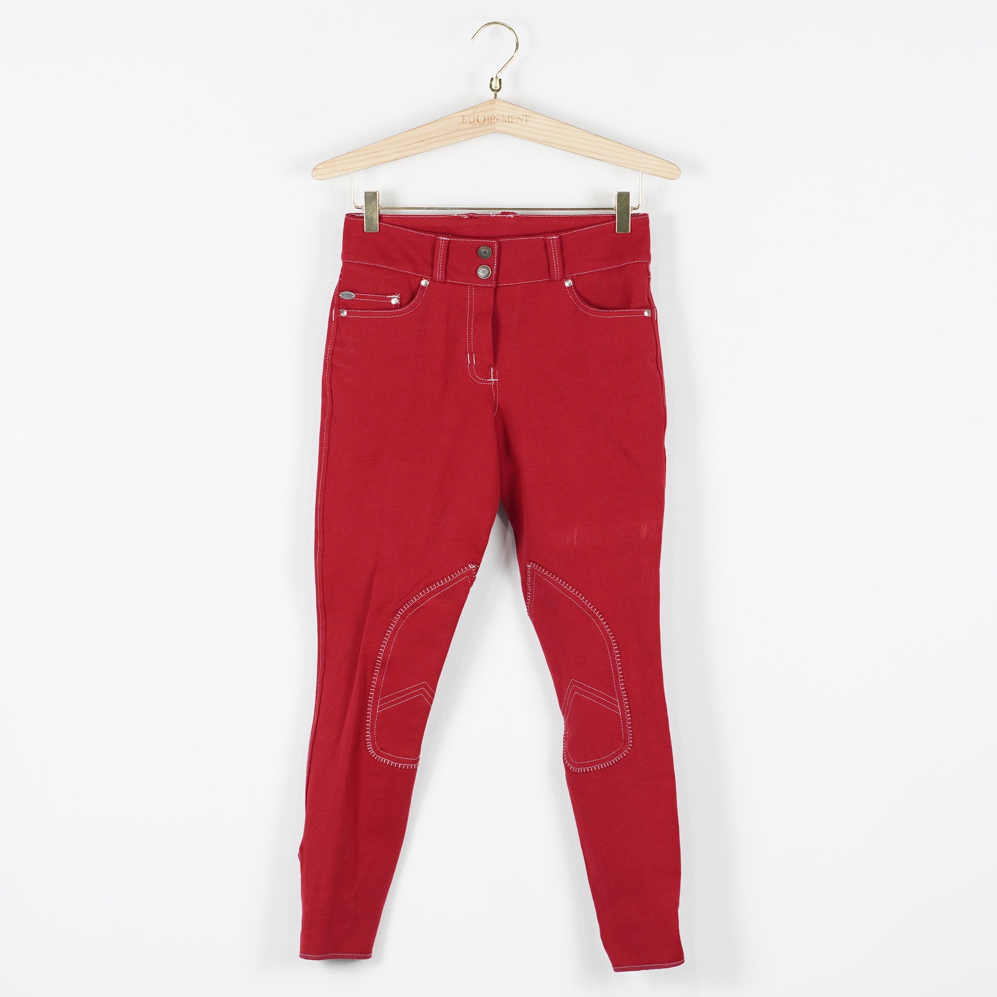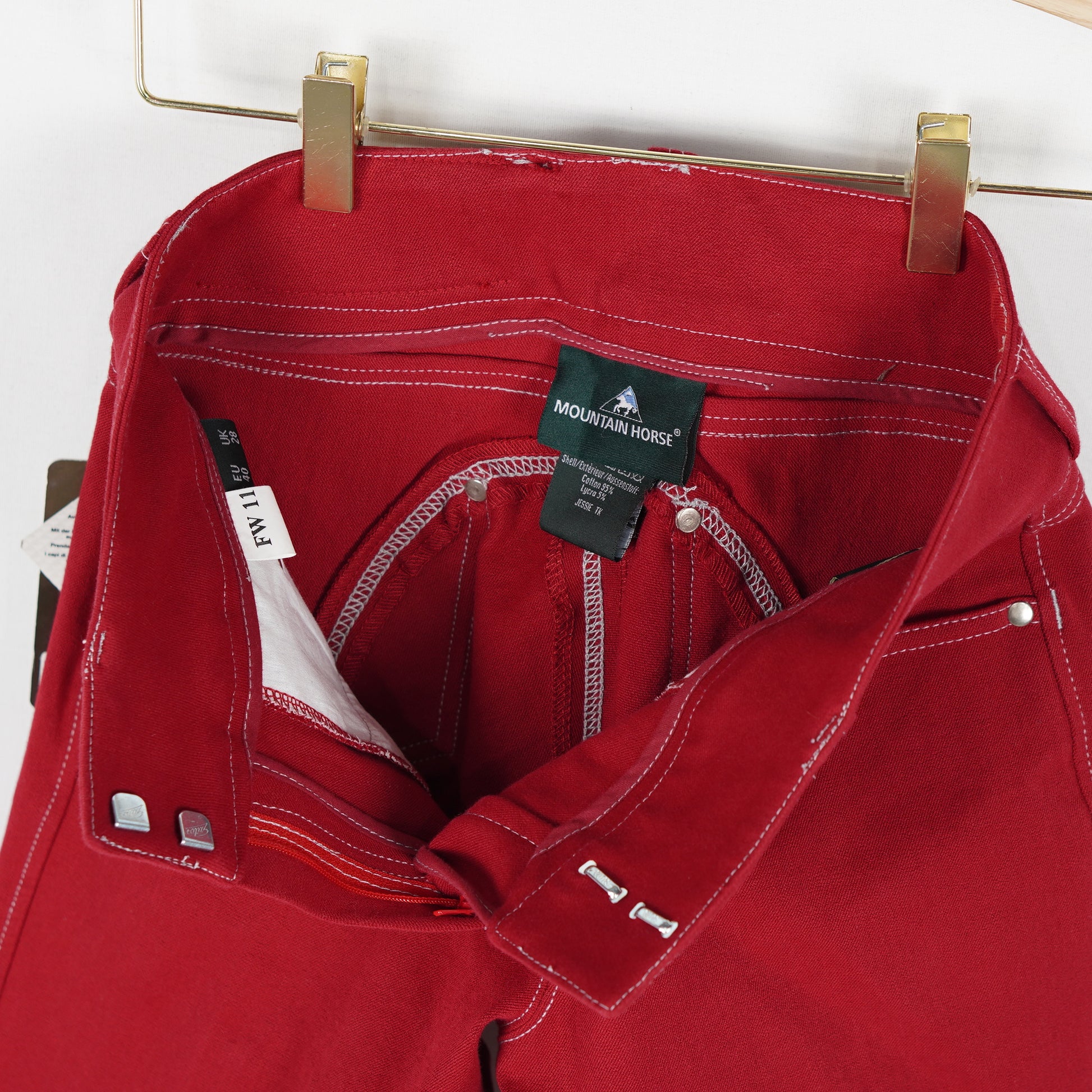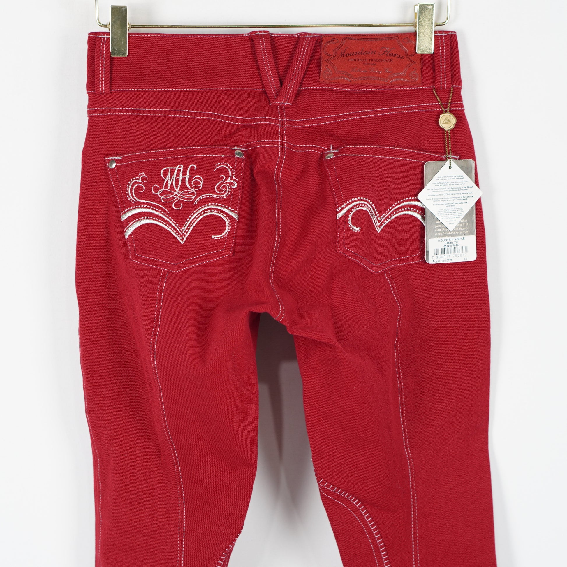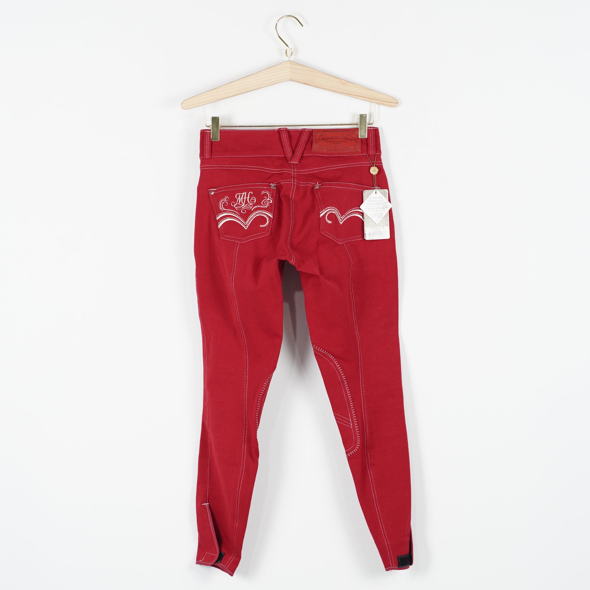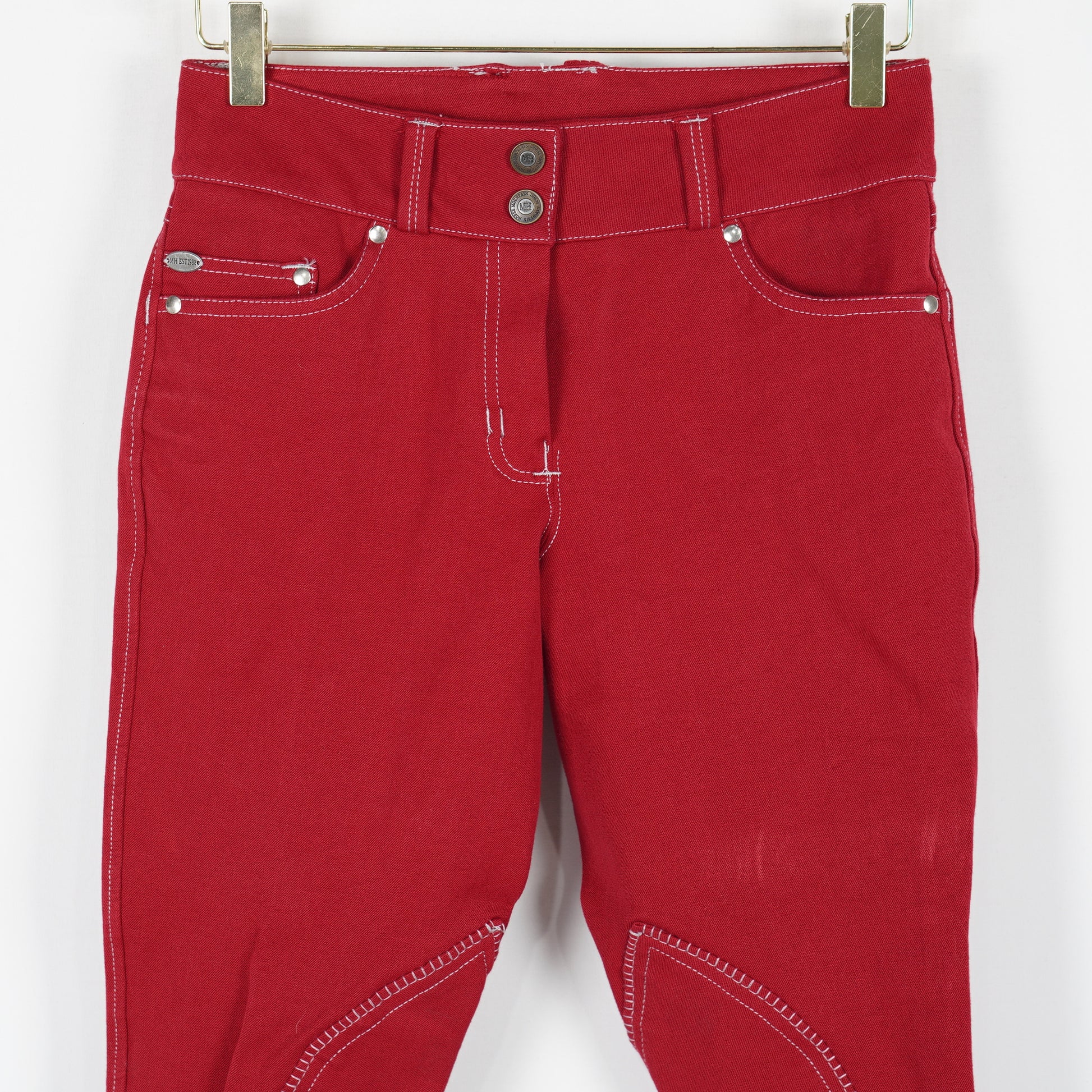 Röda oskodda ridbyxor "Jessie" med förstärkta knän och kardborre vid benslutet från Mountain Horse. Ridbyxorna är i ett oanvänt skick med tags kvar.