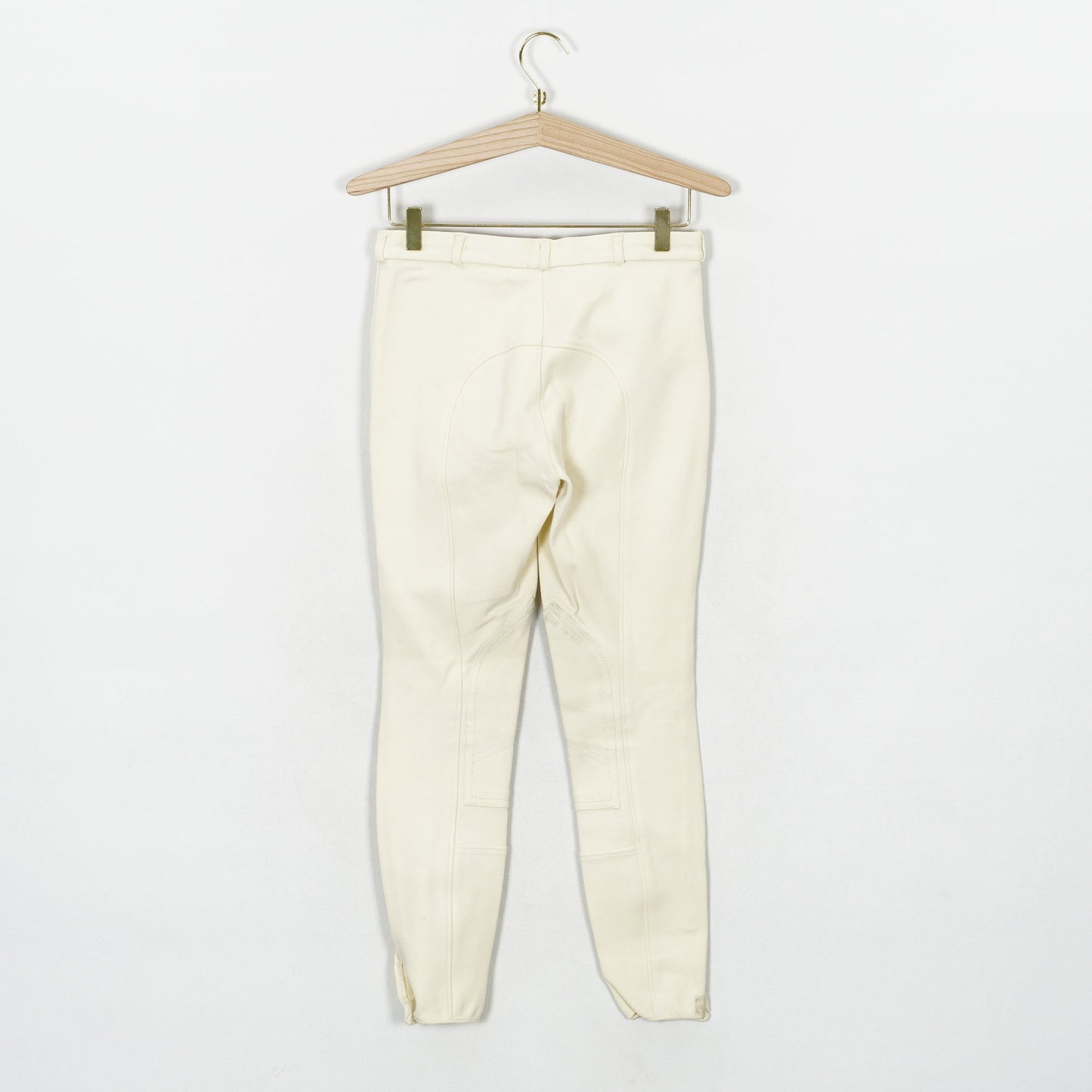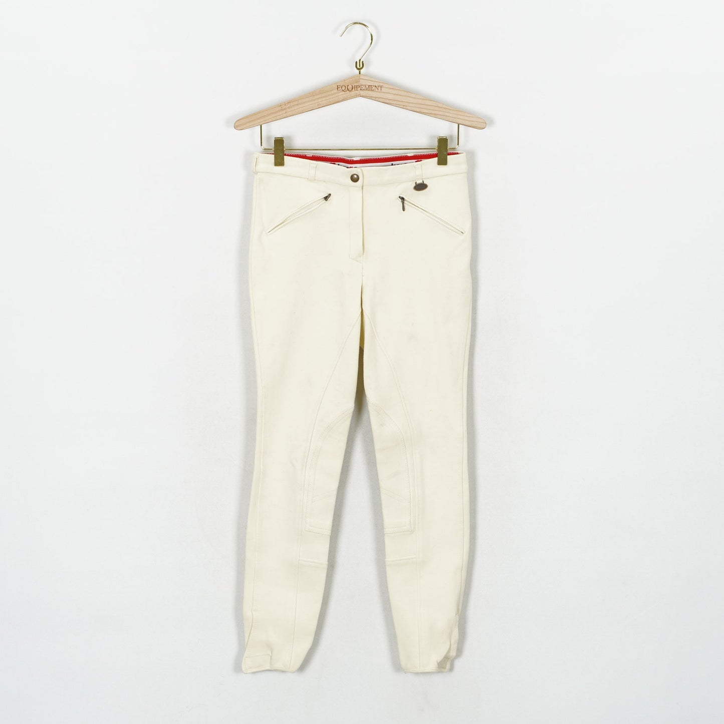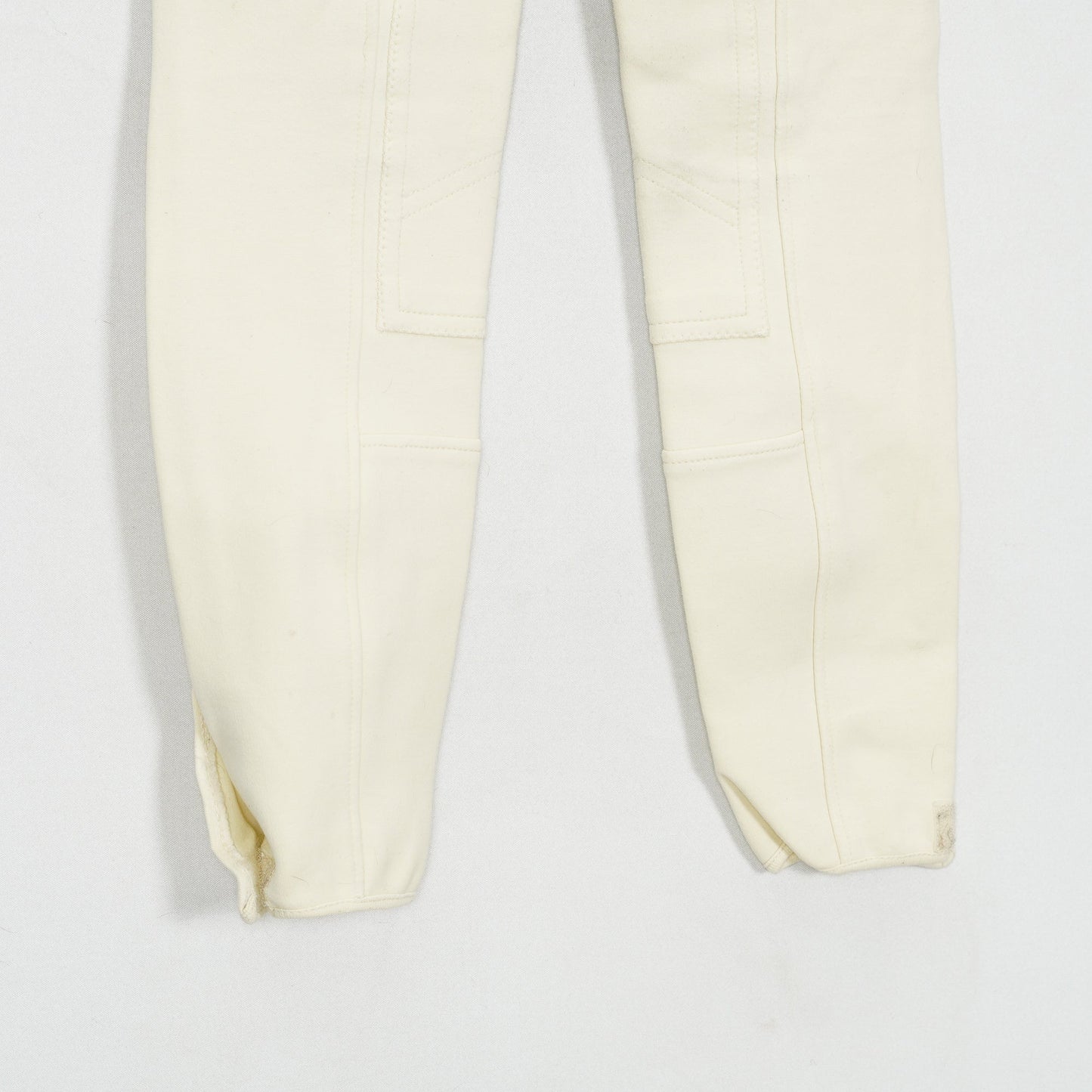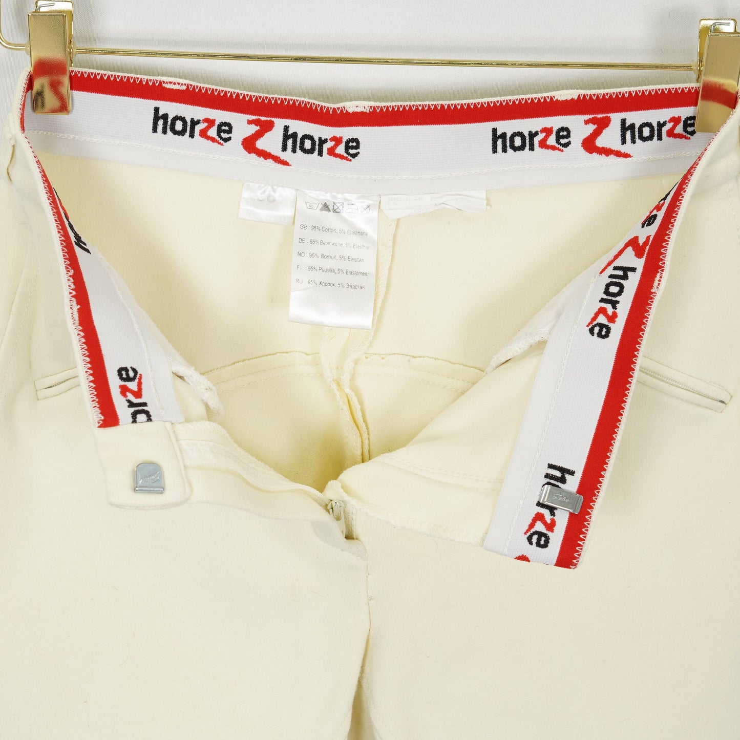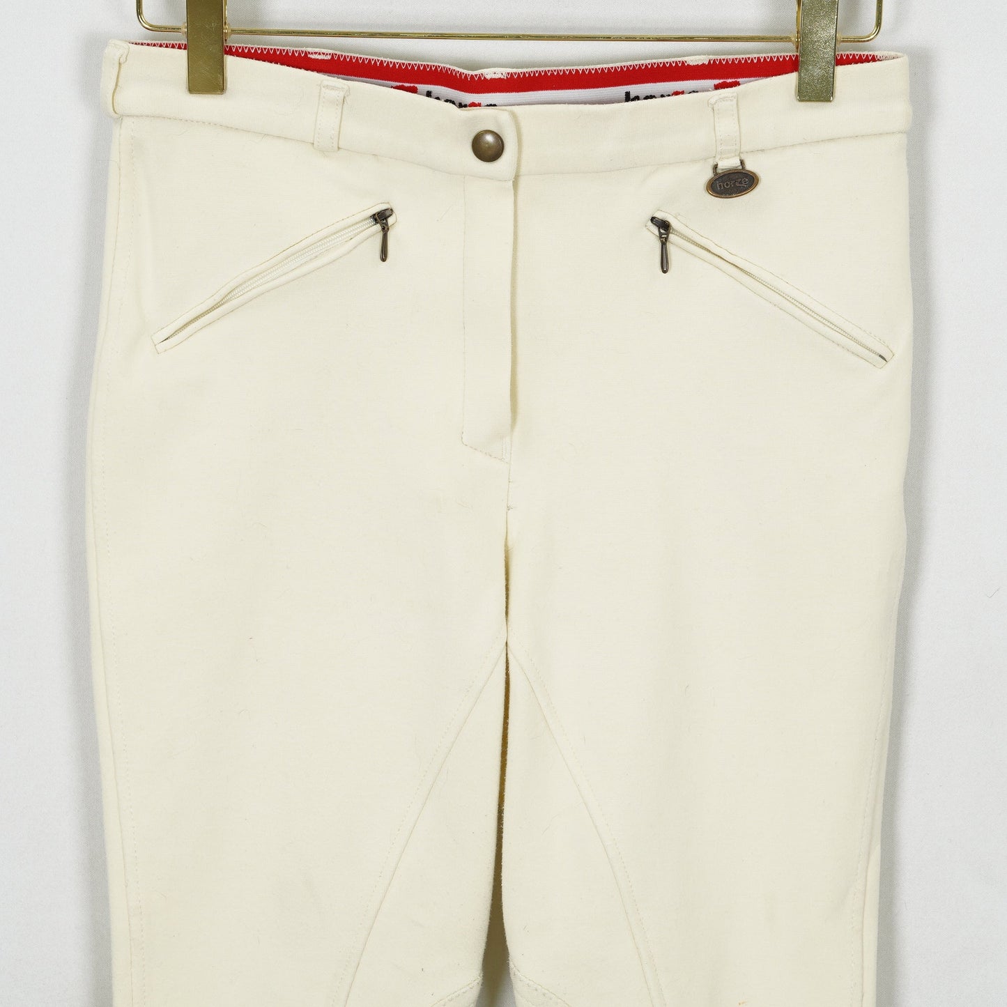 Oskodda ridbyxor från Horze med kardborre vid benslut. Ridbyxorna har en ljusgul-aktig färg och två fickor fram med dragkedja. Ridbyxorna är i ett använt men ok skick.