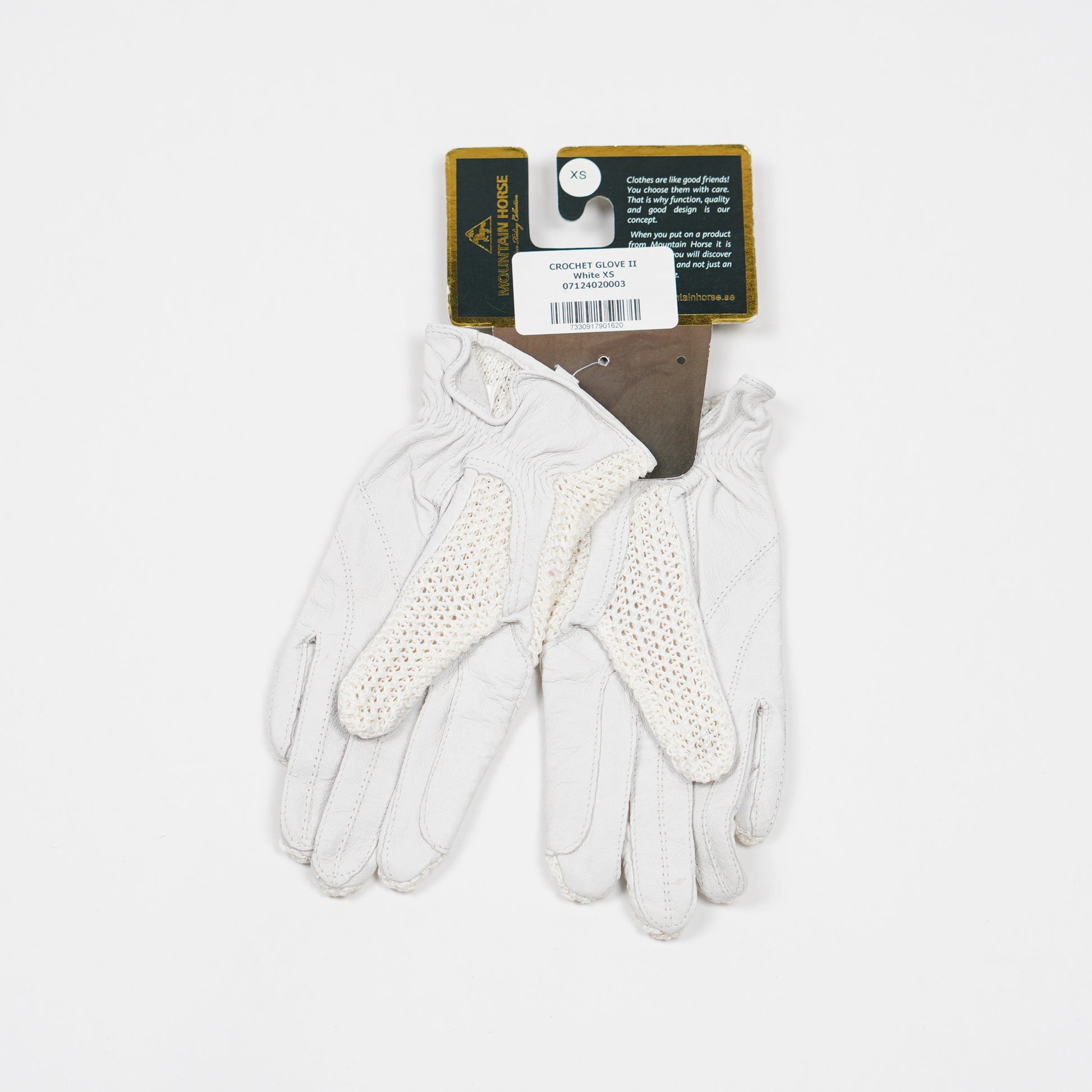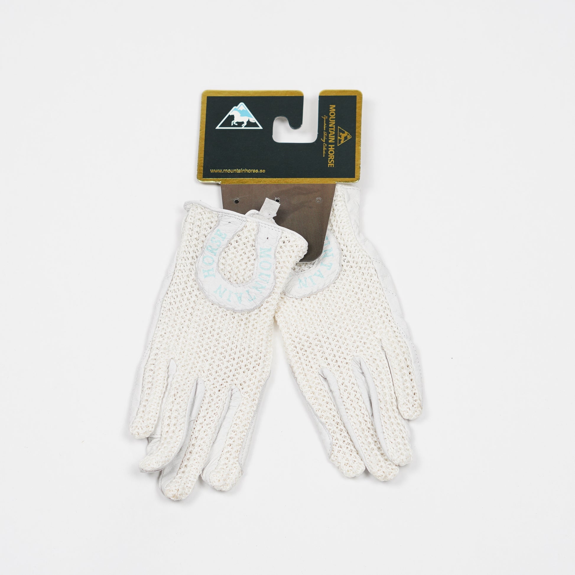 Klassiska ridhandskar med en vit virkad ovansida och undersida i vitt läder från Mountain Horse. Ridhandskarna är i ett oanvänt skick.