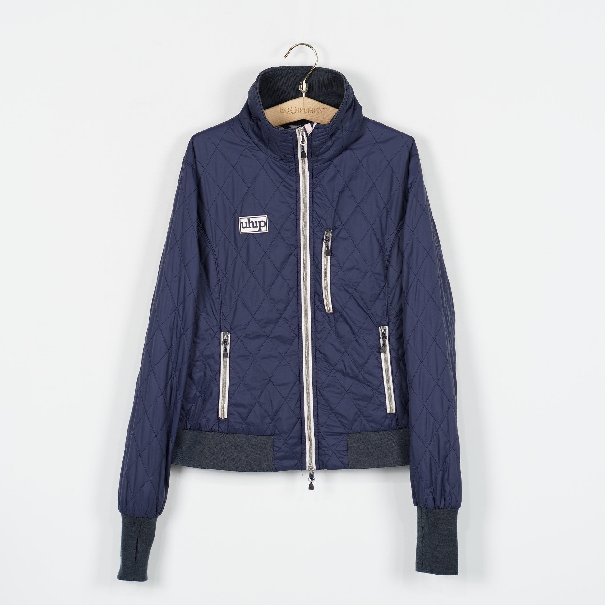 Tunt fodrad ridjacka i blått med bred ribbstickad resår runt midja och handleder från Uhip.