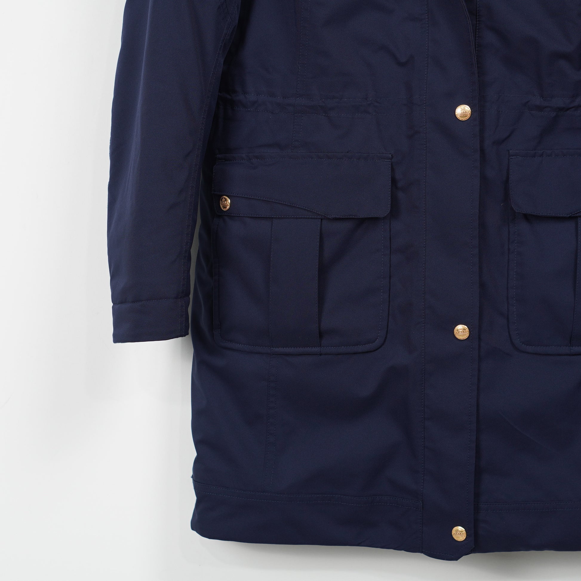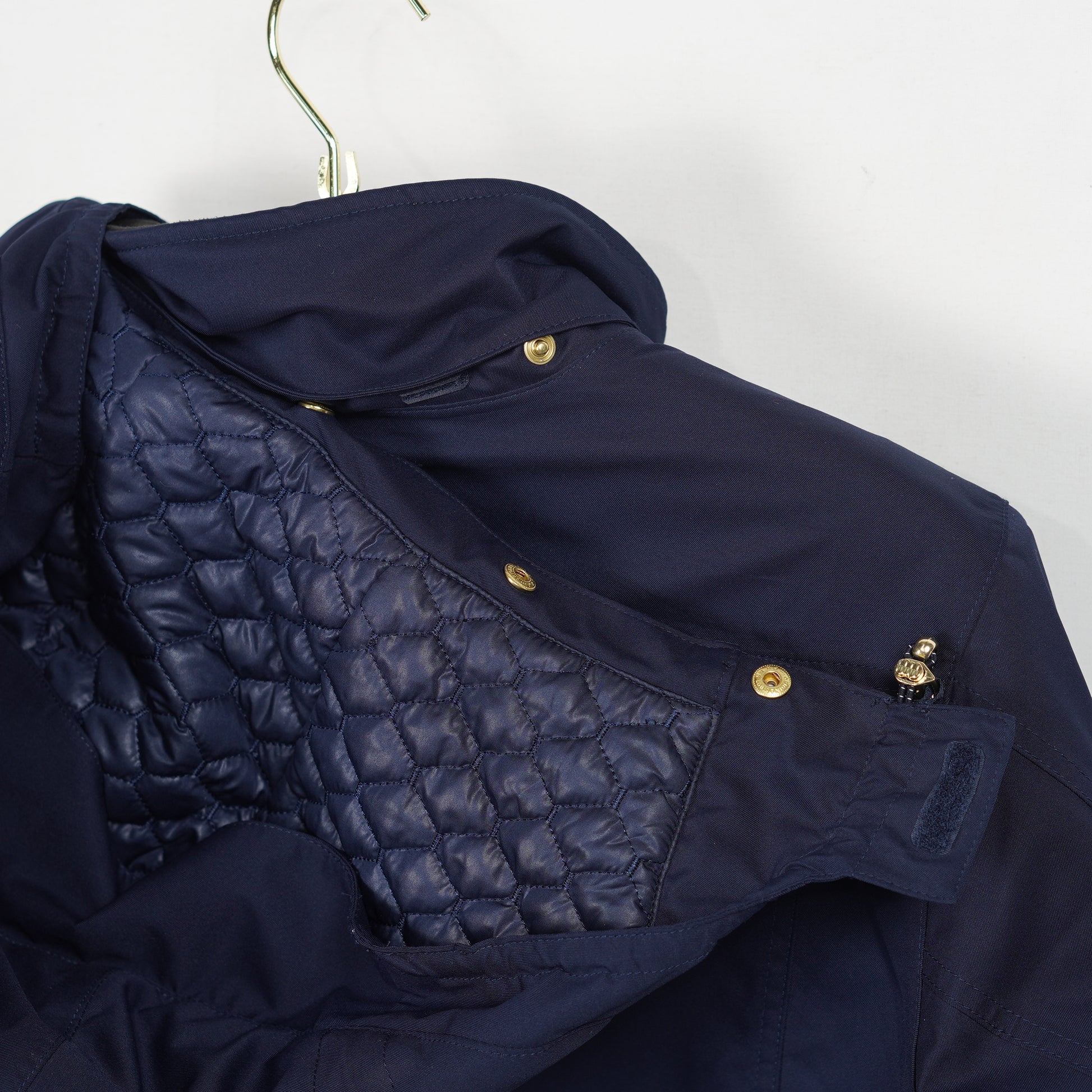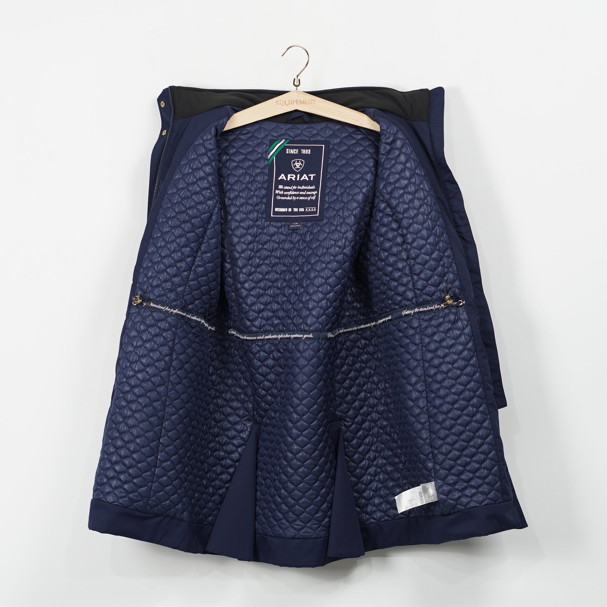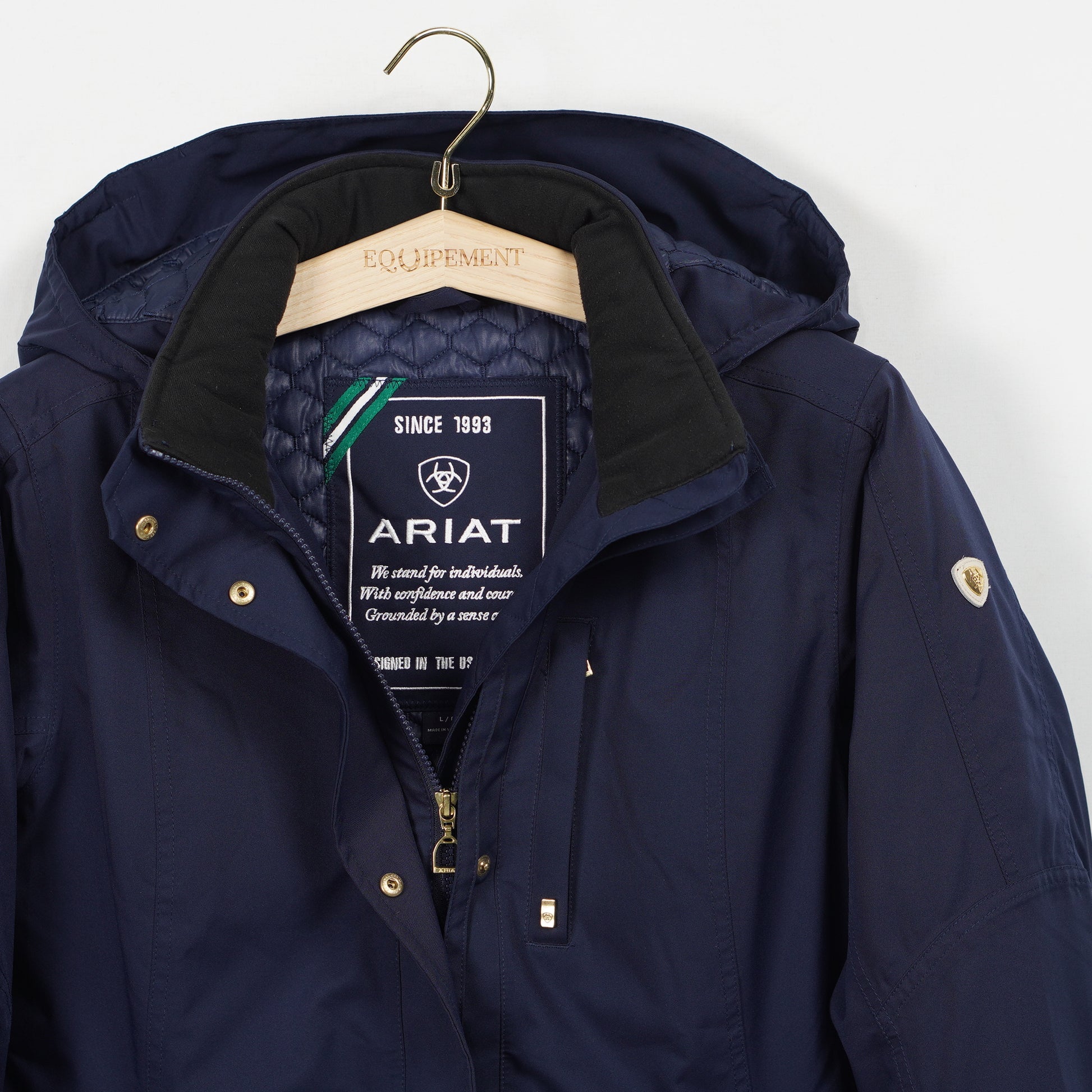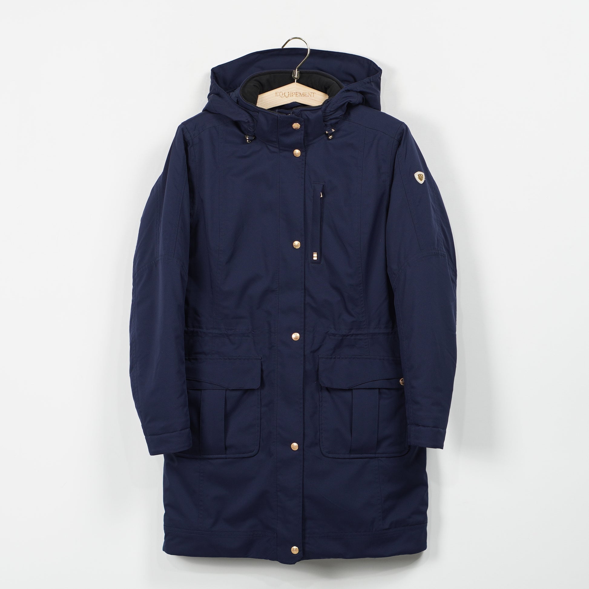 Snygg fodrad kappa i blått med många fickor, avtagbar luva och snygga guldfärgade detaljer från Ariat.