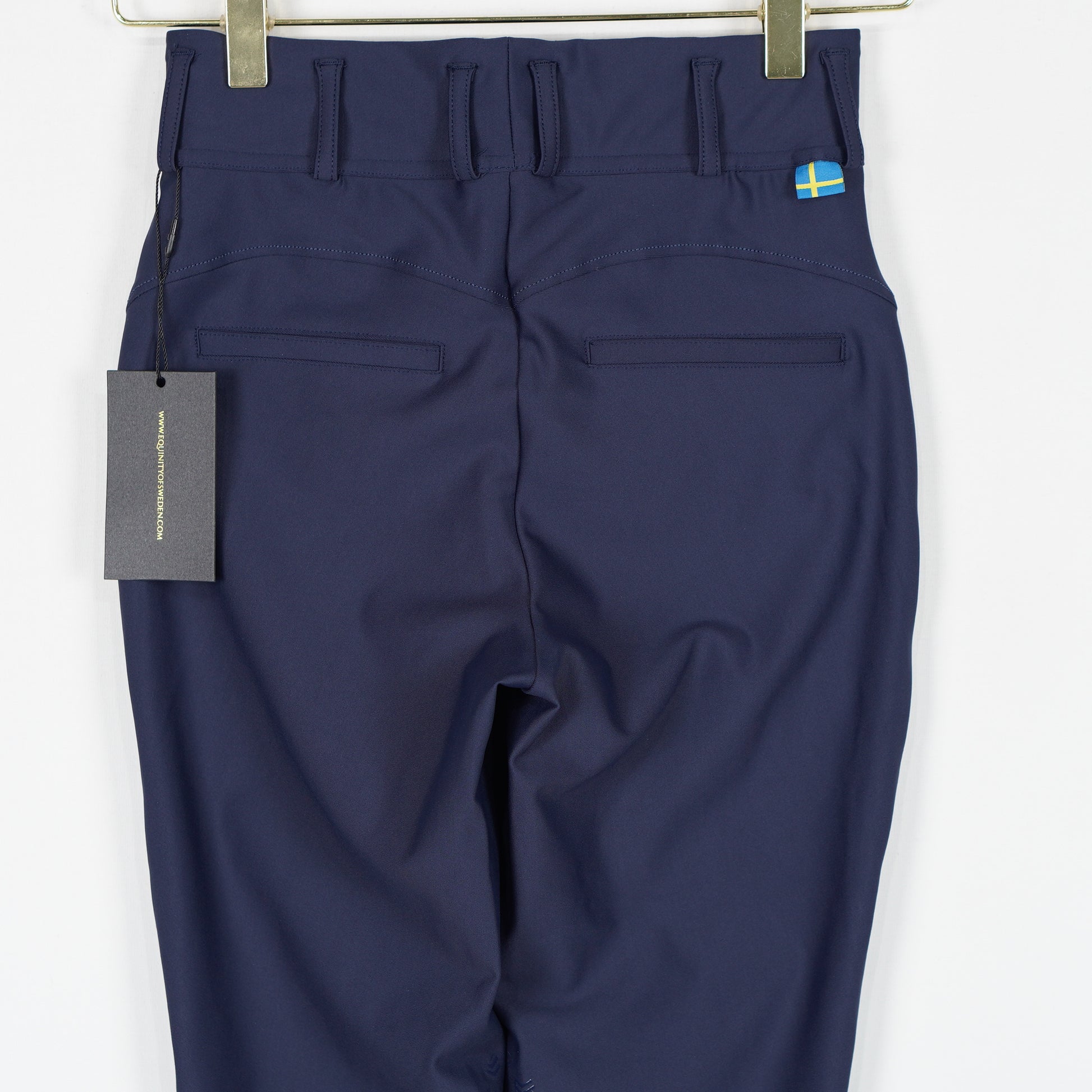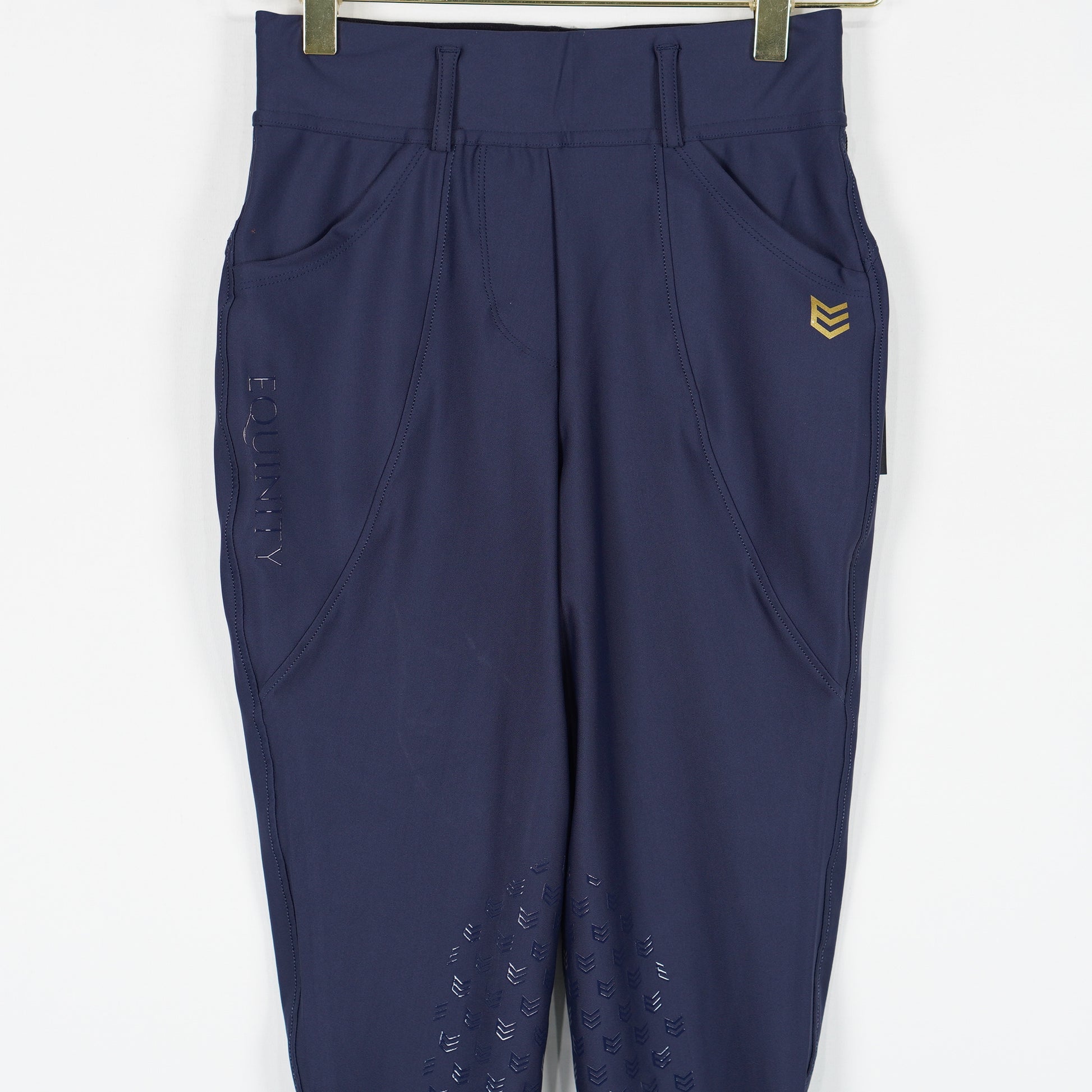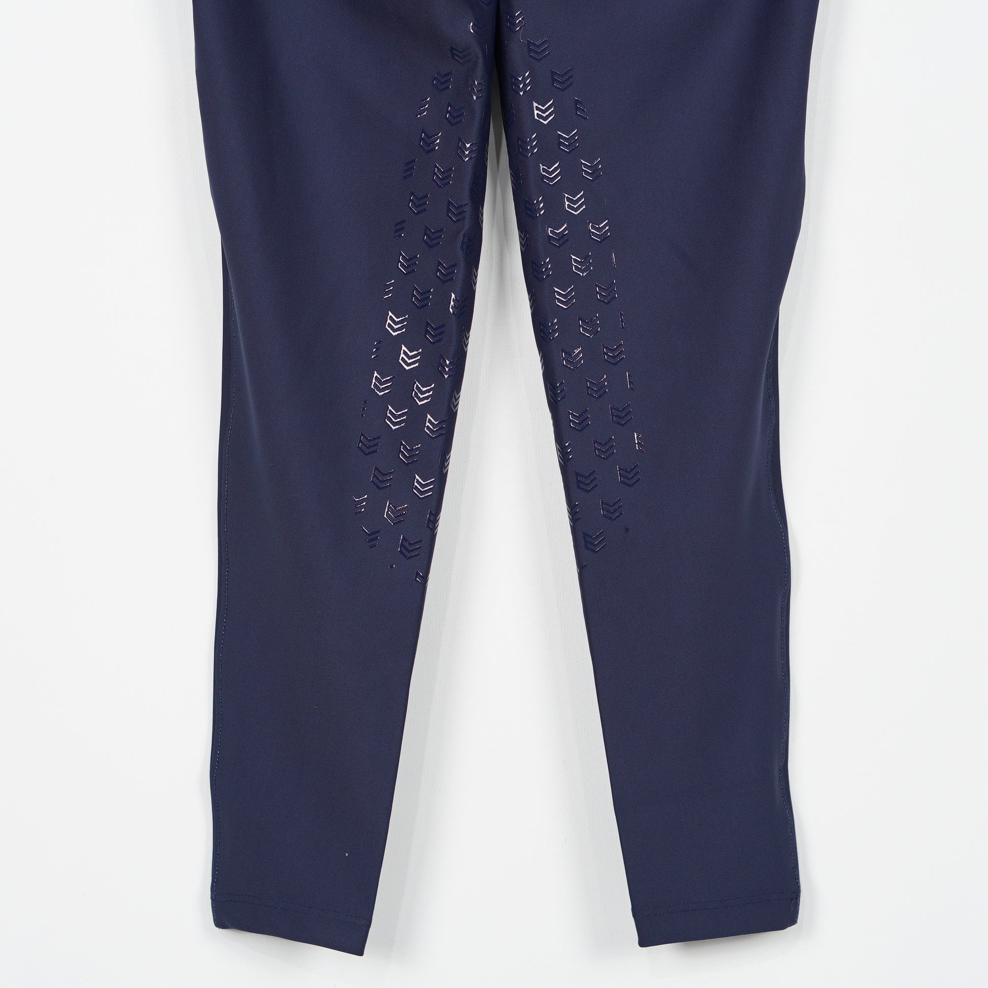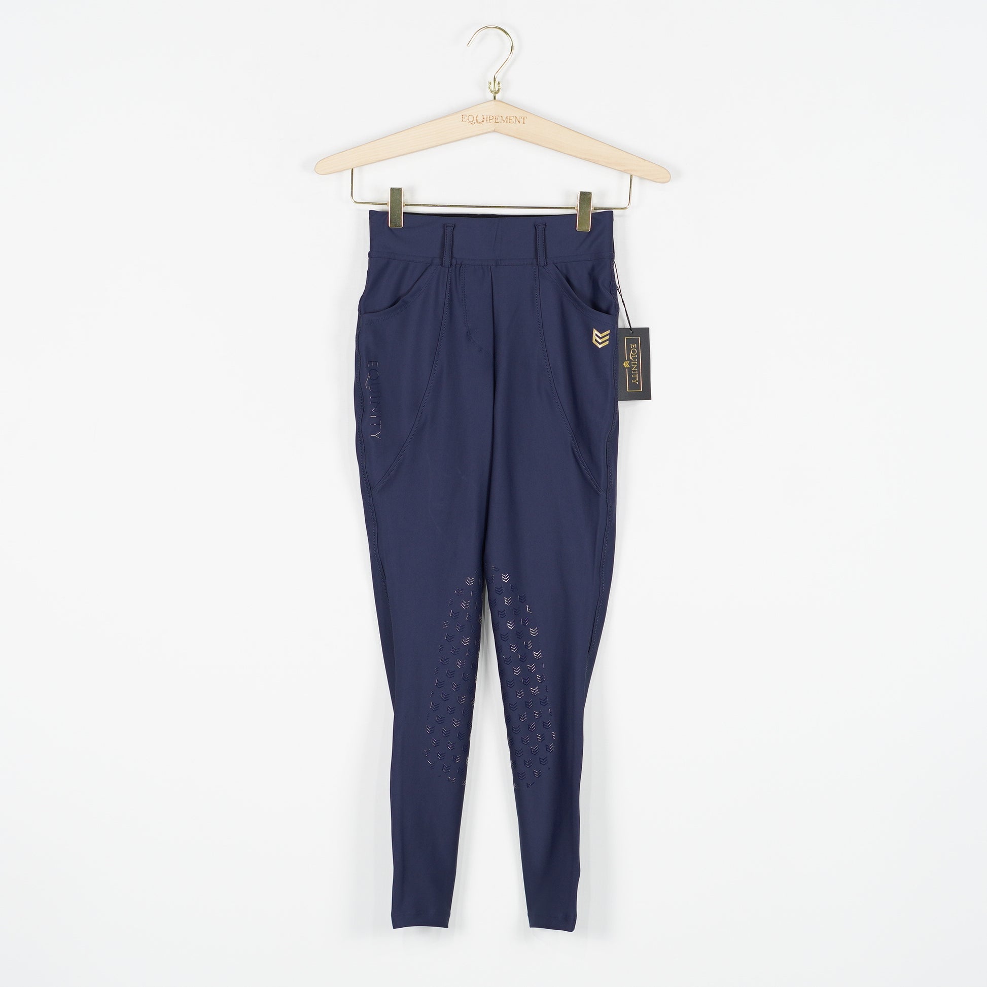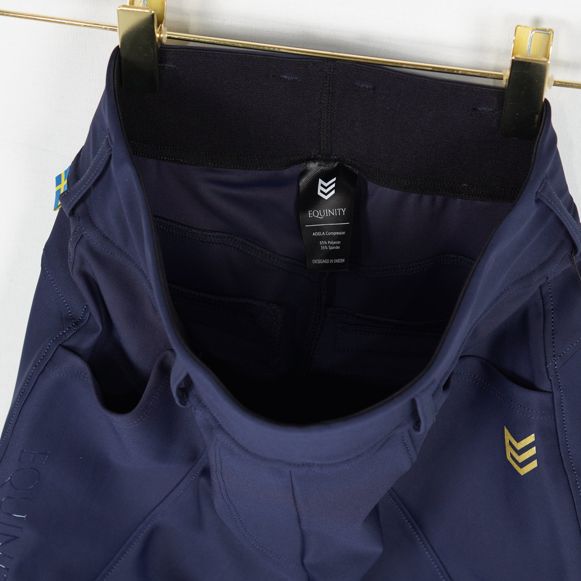 Blå ridleggings från Equinity, modell Adela Compression. Leggingsen är halvskodda med silikon grip i form av loggan och resår i midjan.
